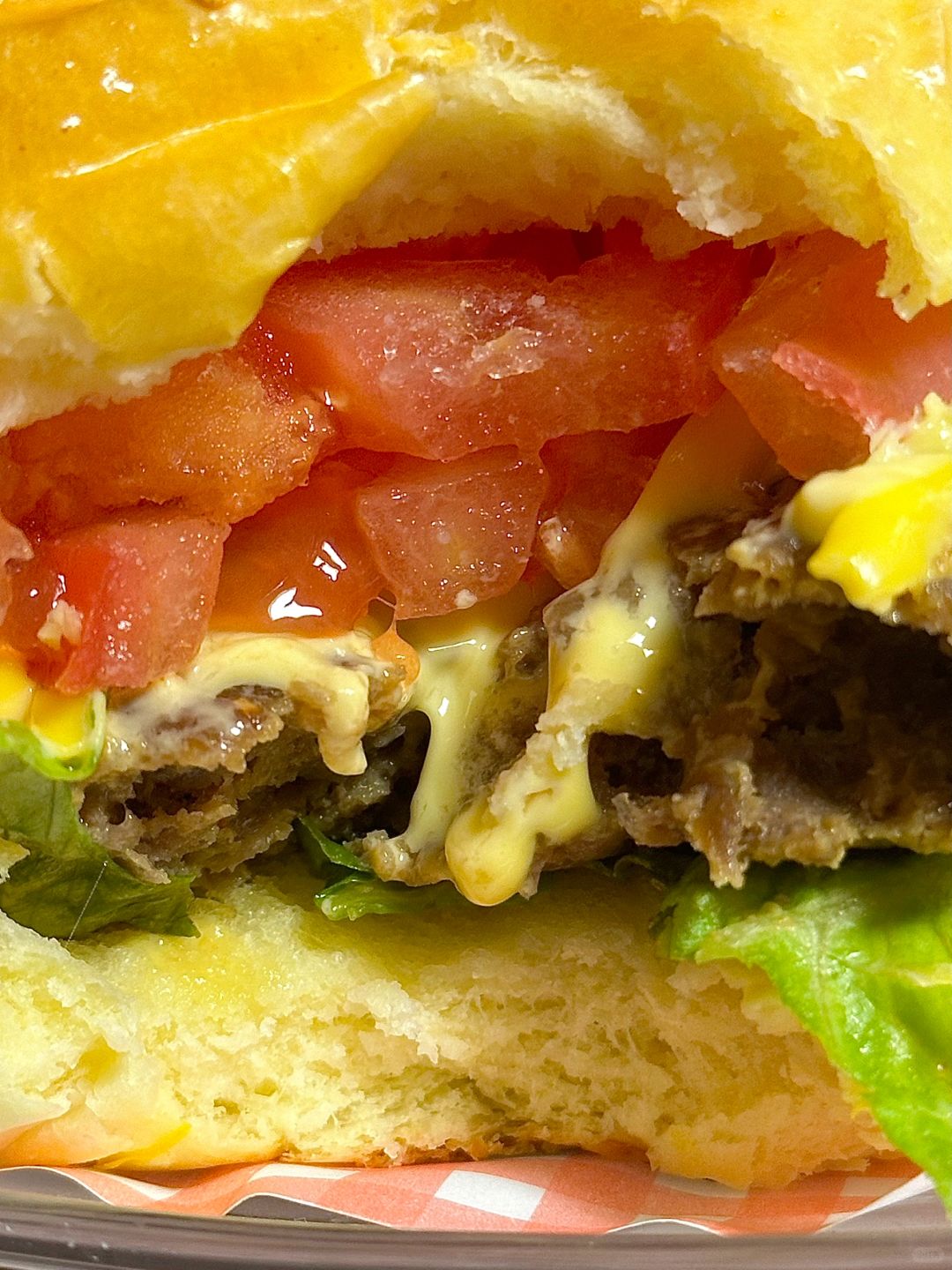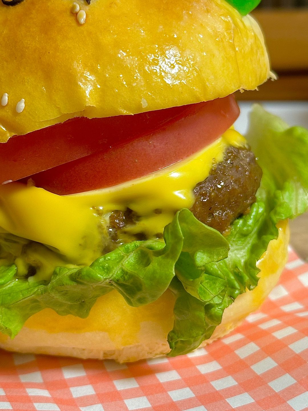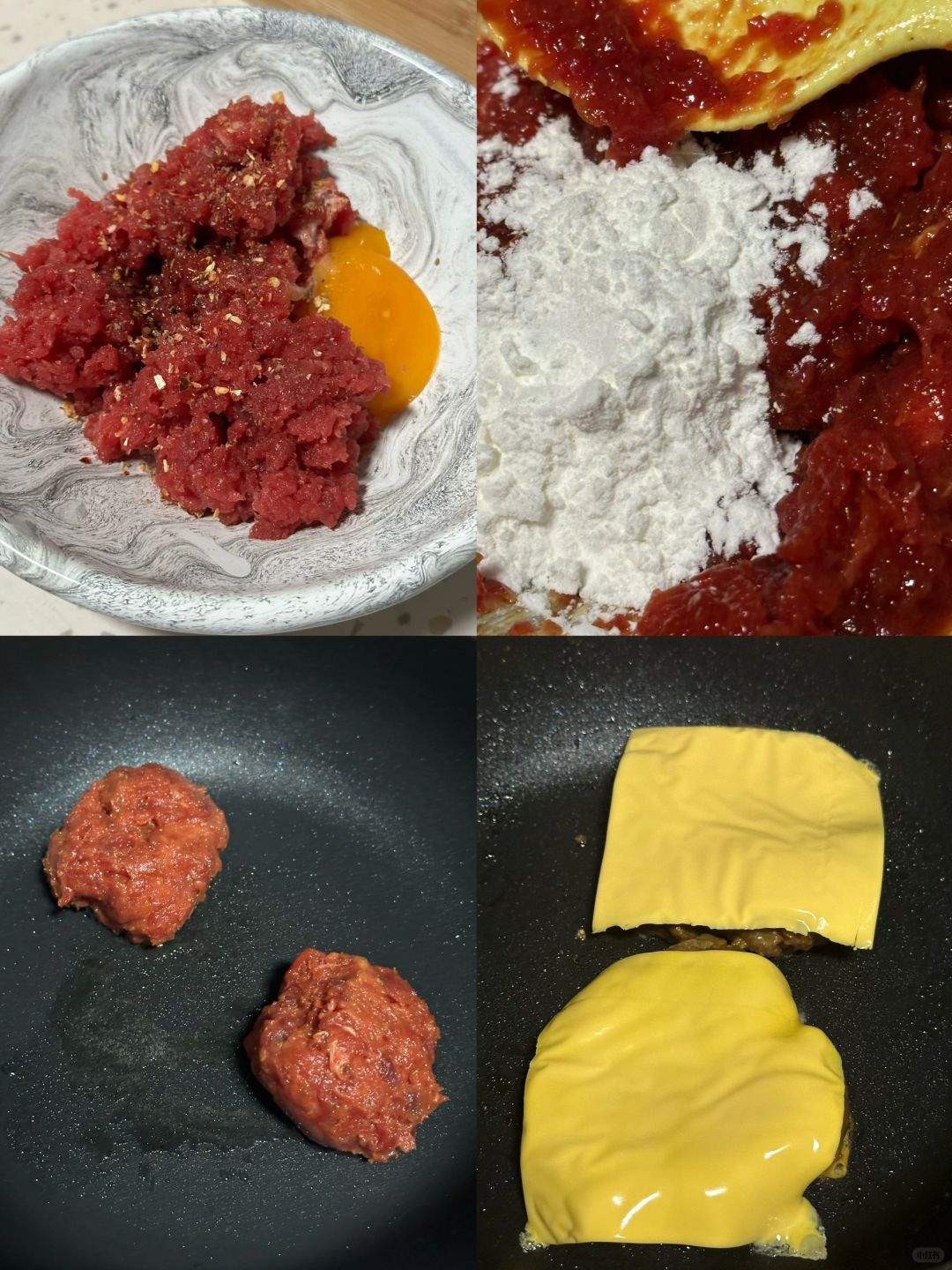 3.牛肉打碎加入调料搅打上劲,捏成饼煎至表面焦黄,趁热放上芝士片