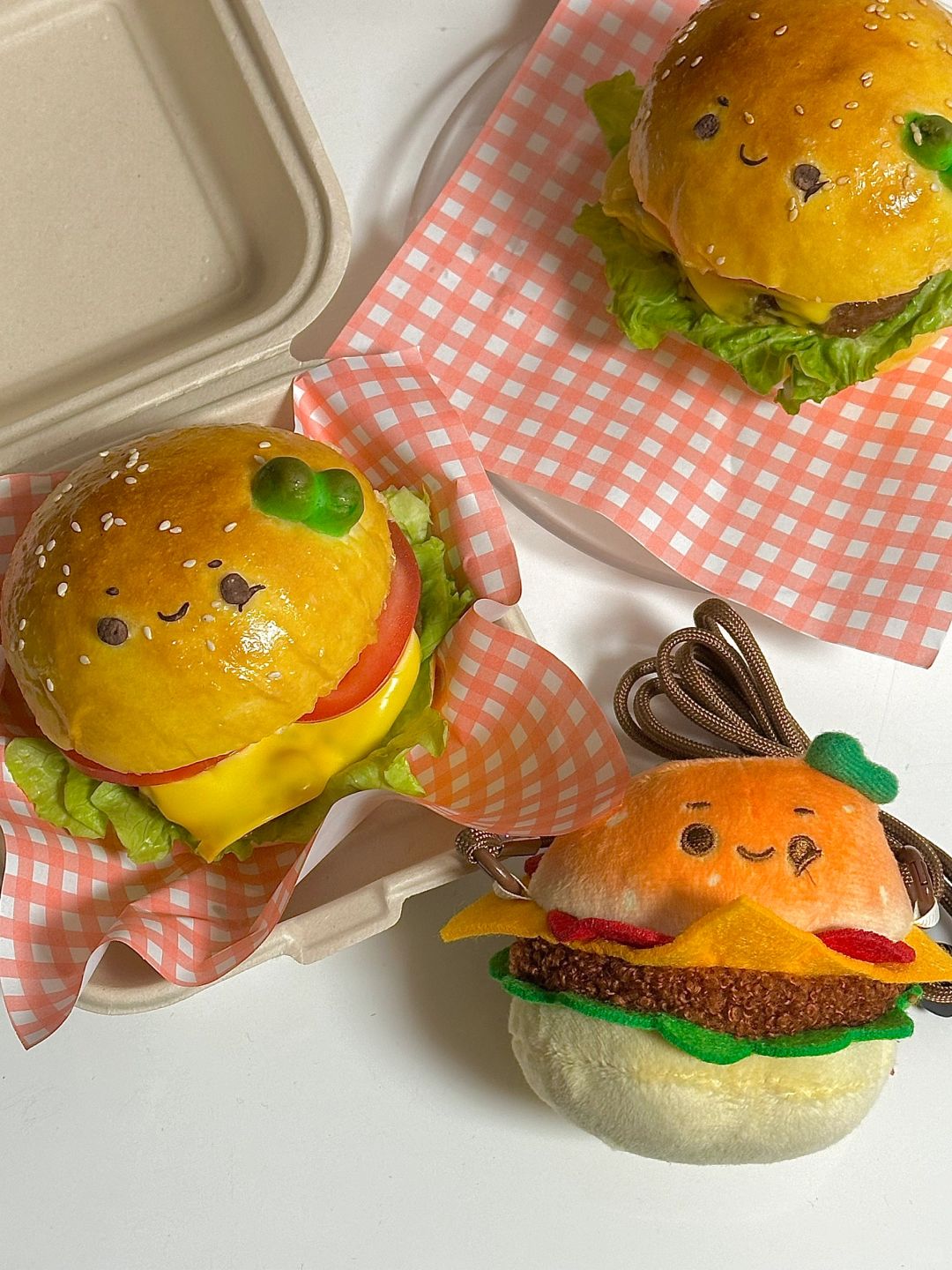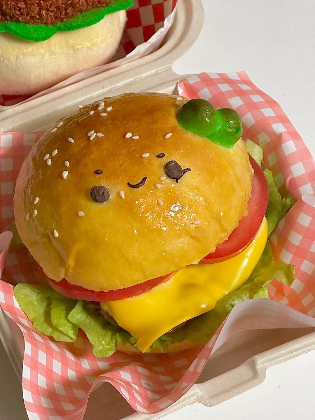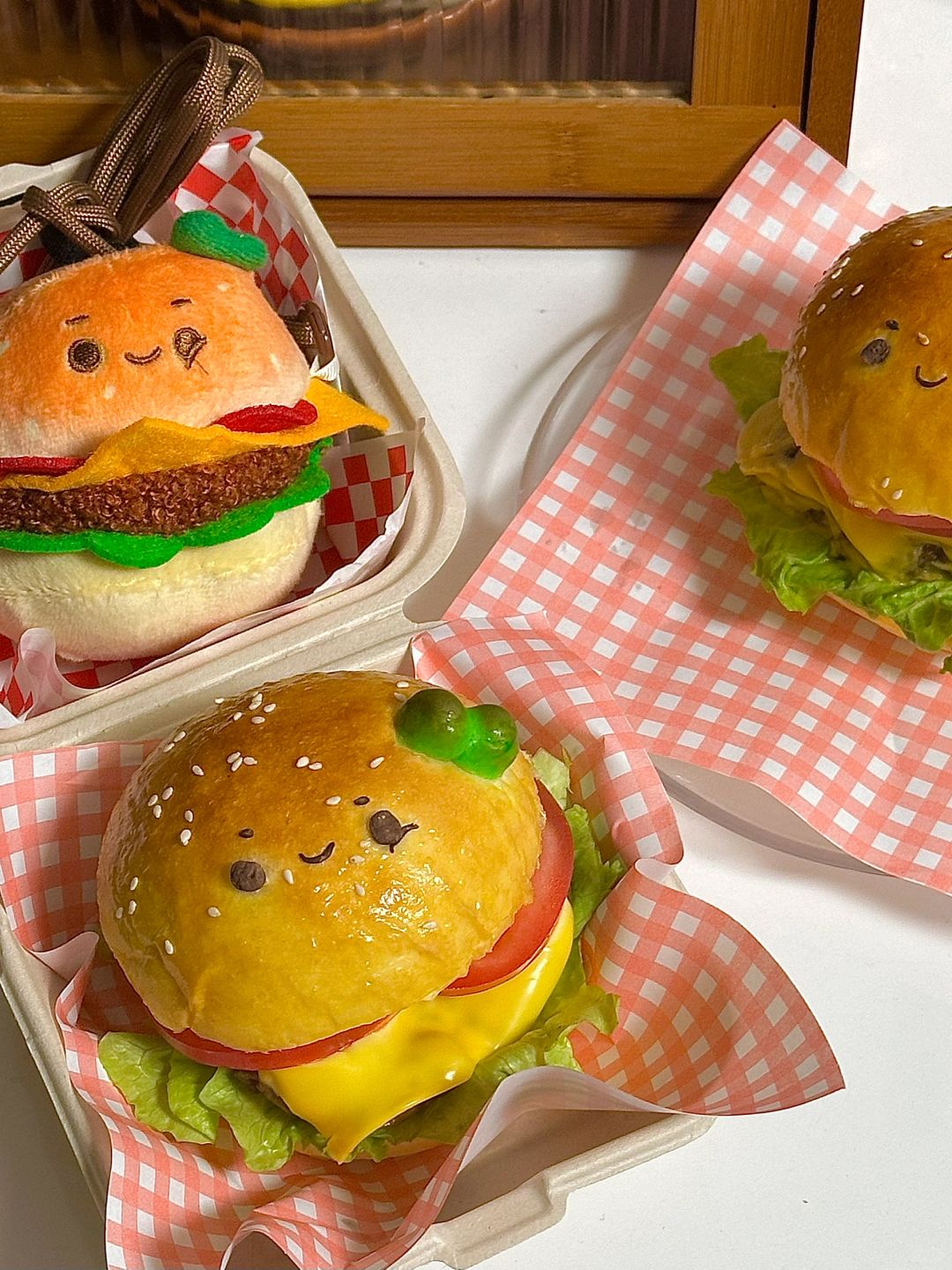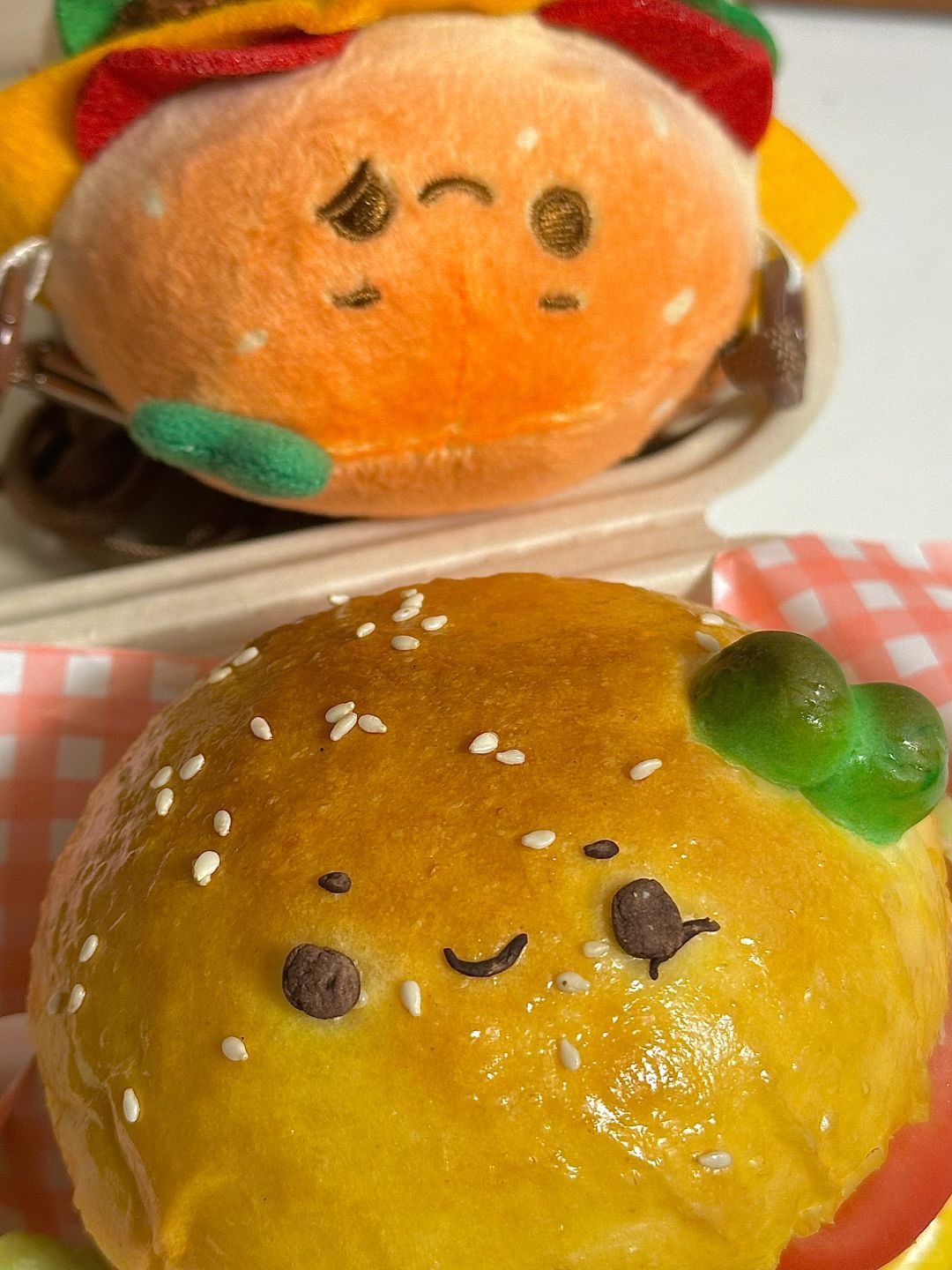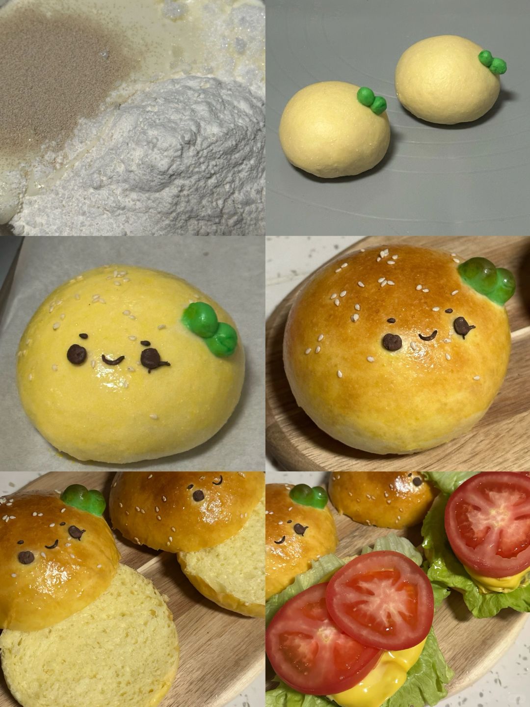 汉堡胚:90g高筋面粉、65g熟土豆、2g酵母、50g牛奶、8g蛋黄液、一撮盐、4g糖、12g黄油