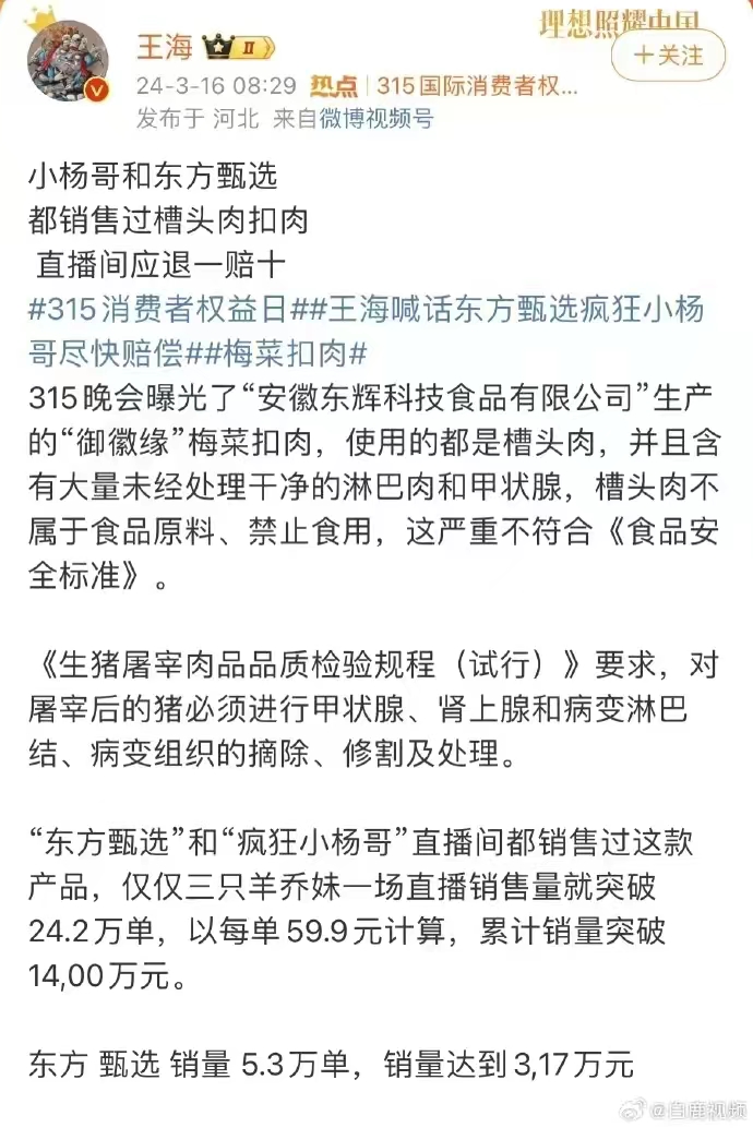 打假人王海给算了个账,东方甄选和小杨哥都带过这个扣肉,一场的销售额都是上千万元的,有可能就意味着他们能赚到大几百万元。所谓的严格管控商品的质量是怎么管控的?对于这些销售能达到上千万元乃至上亿元的货品,难道不需要派一个人到厂家去看一看,考察一下,整个观察一下生产流程吗?