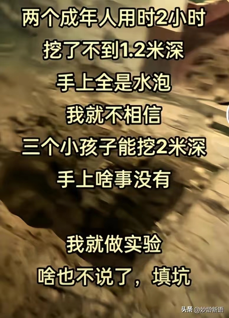 #邯郸村民试挖坑:6小时只能挖1米深#我觉得这事儿大家别猜疑了,河北邯郸警方一定会找出答案的。如果是村民和家长能够想到的问题,警方整个在侦破过程中也会将整个过程问的仔仔细细。如果是有旁人协助,那么相信这三个未成年人在面临警方的手段时,不可能最终言语保持一致,一定会找出这个人。如果没有他人协助,那么肯定是有客观原因的,所以将来肯定是有情况通报的。