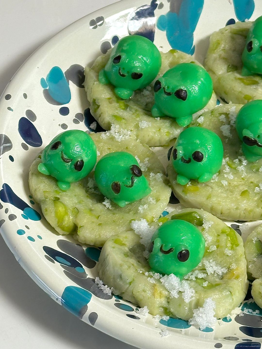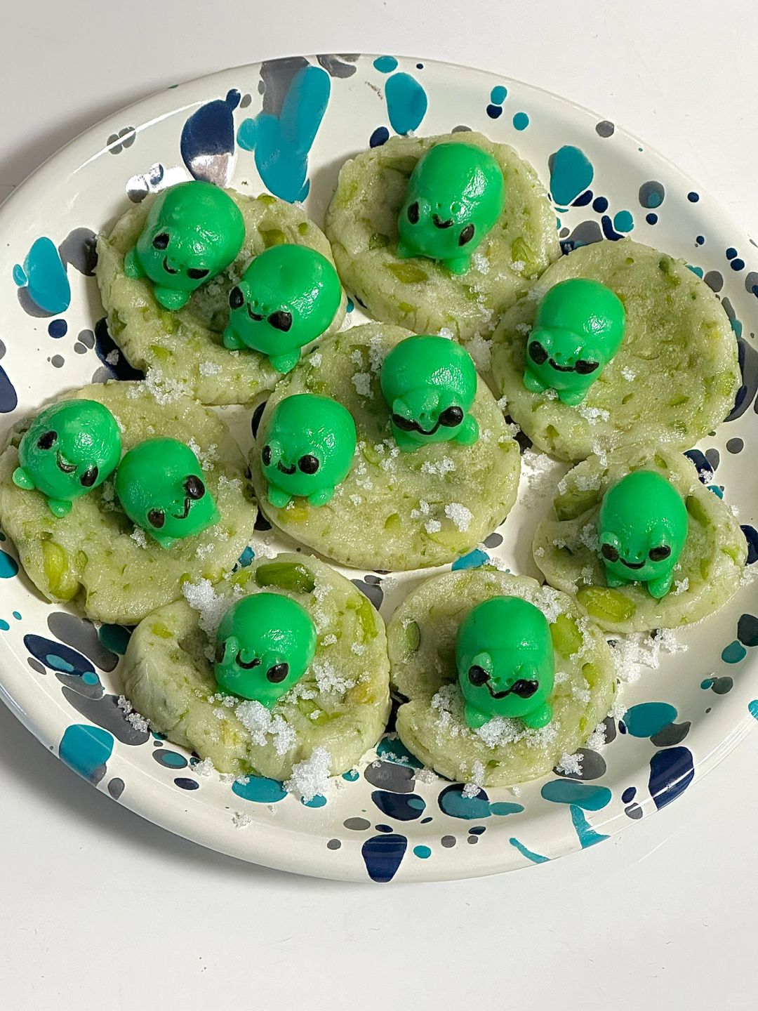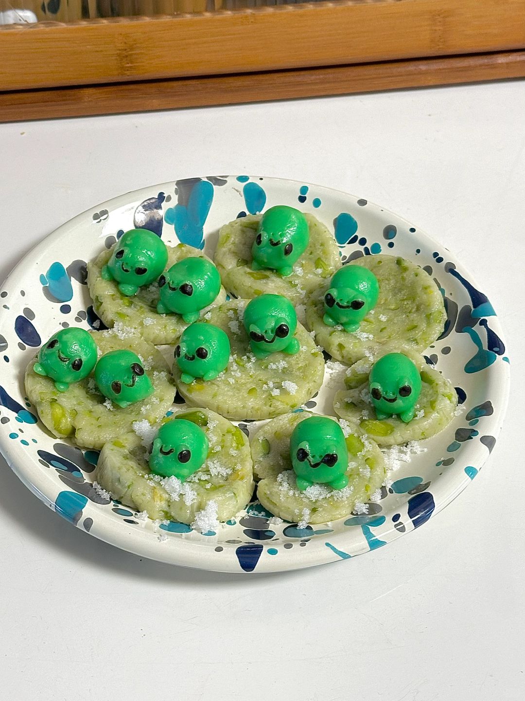 2.青蛙配料混合,分份调色,做出小青蛙,水开上锅蒸10分钟
