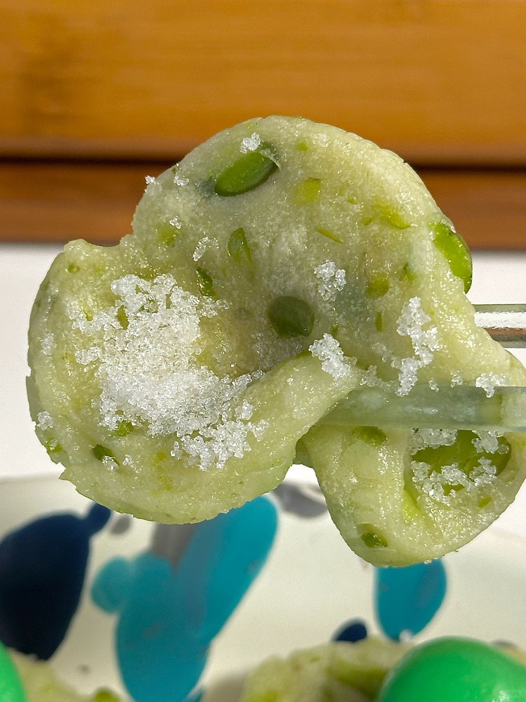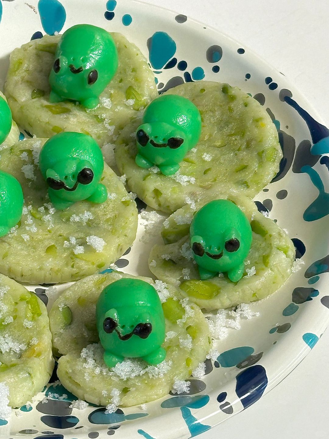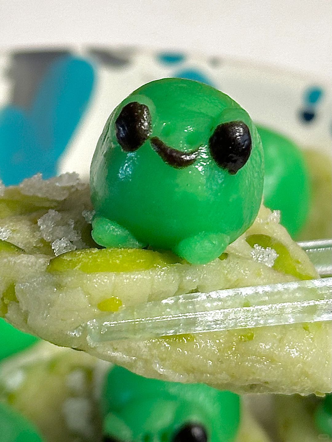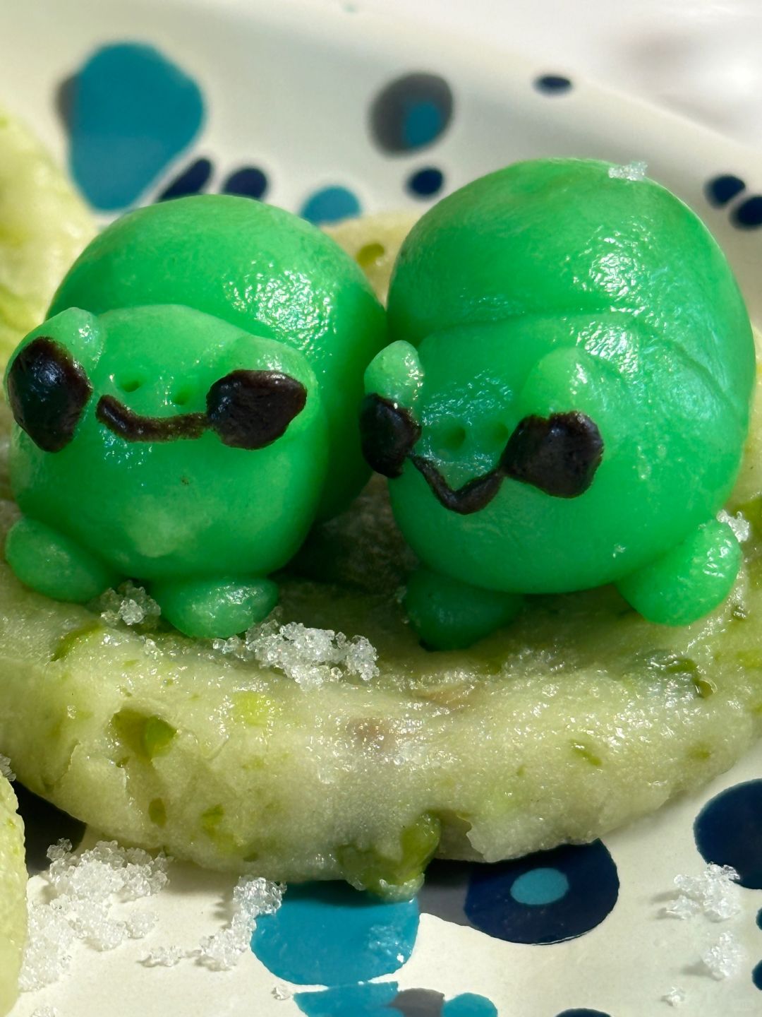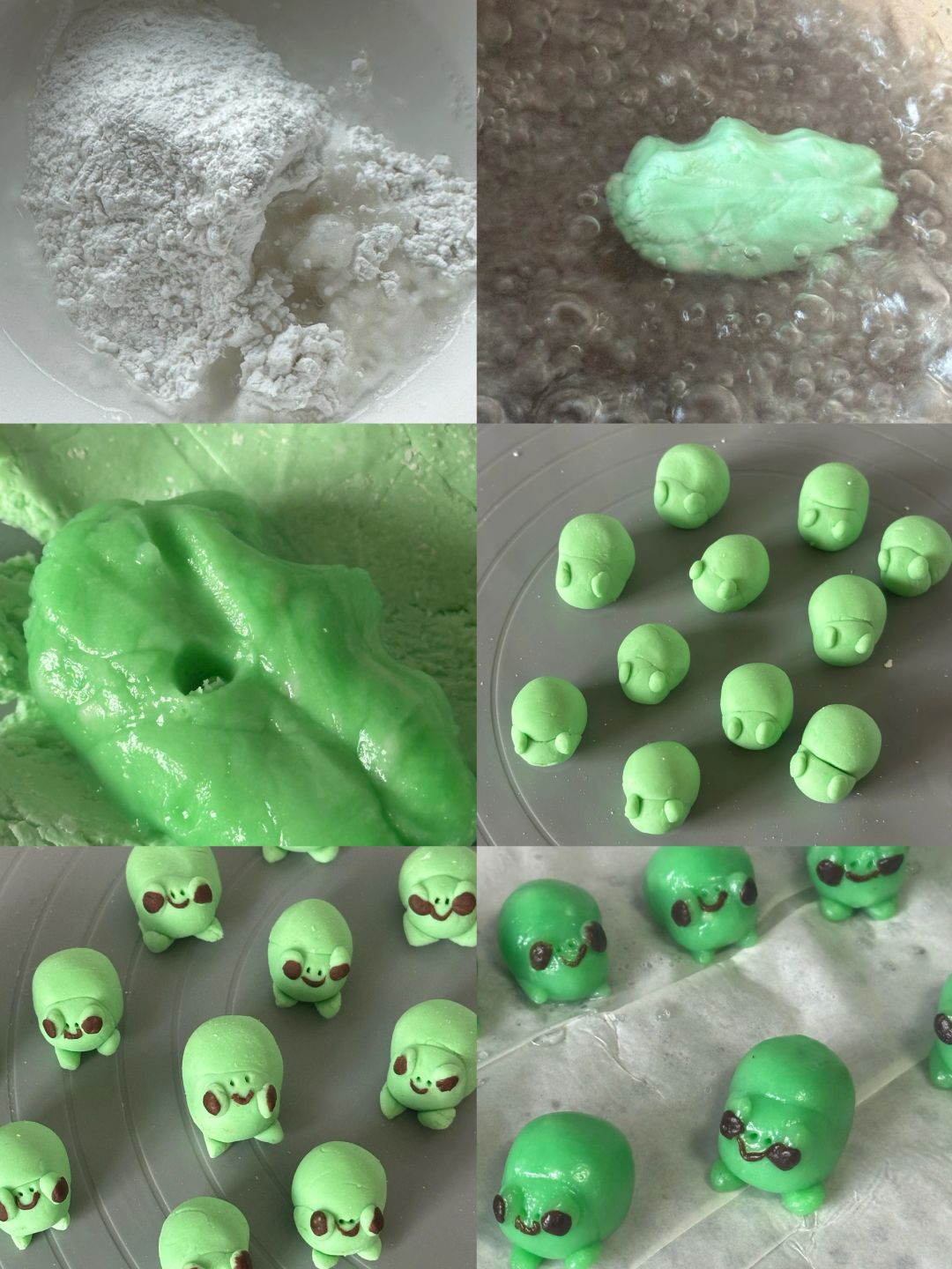 青蛙:40g粘米粉、10g糯米粉、35g开水、调色(绿色色素、可可粉)