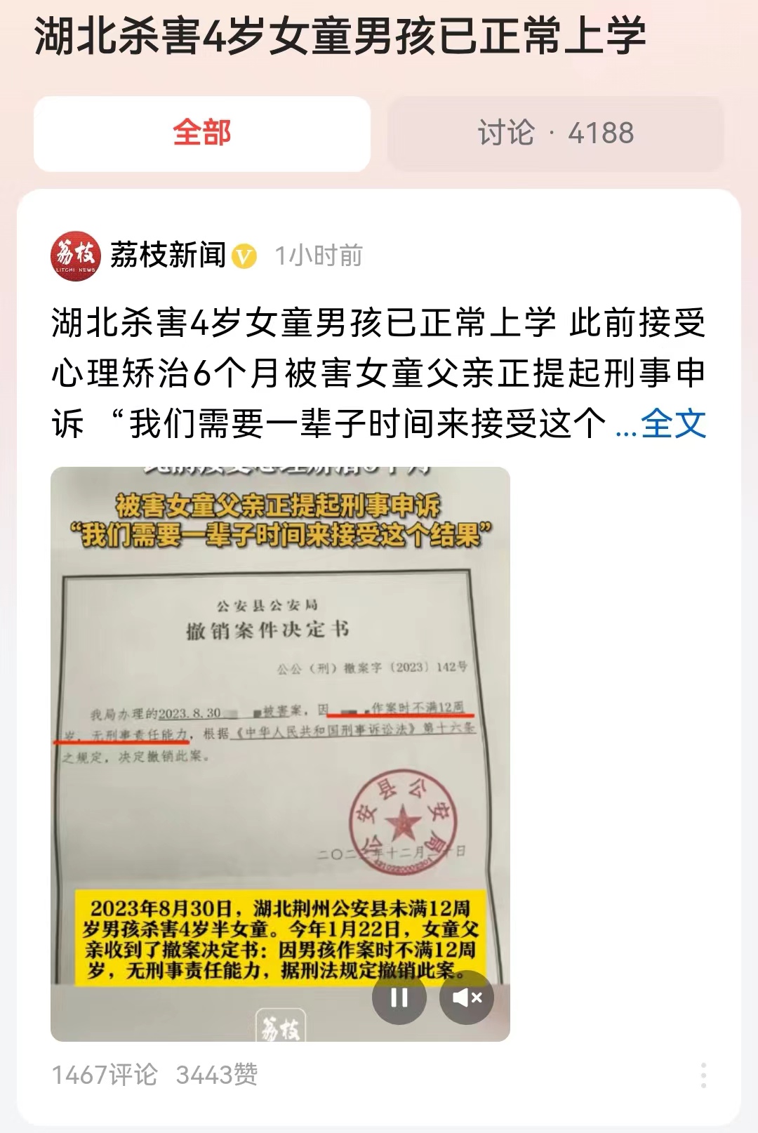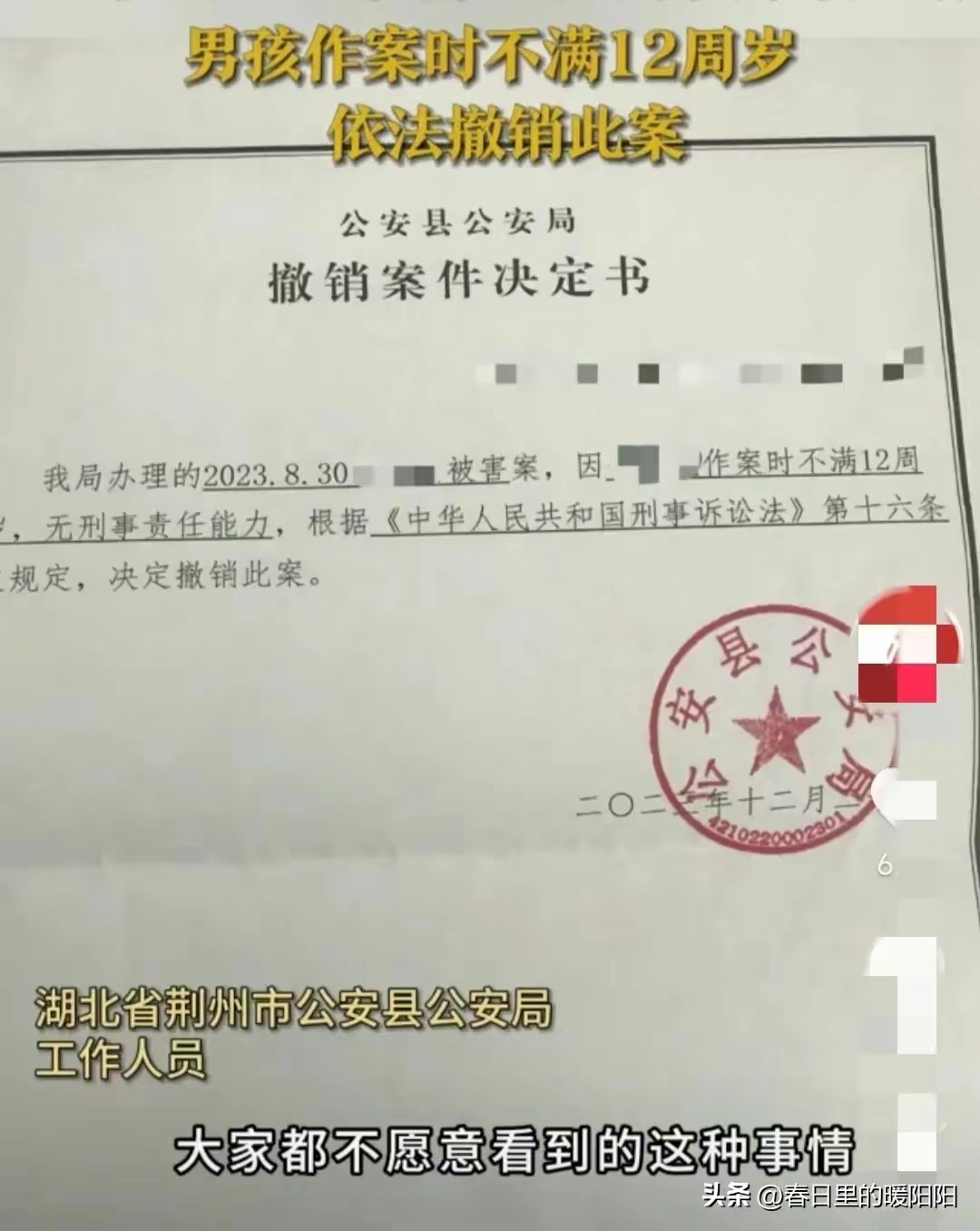#湖北杀害4岁女童男孩已正常上学#这是发生在2023年8月30日的惨剧,湖北省公安县一名未满12岁的男童,因为妹妹同一名4岁女童相互争夺玩具发生吵闹,于是哄骗4岁女童说带她去一个好玩的地方,为了怕女童跑掉,还牵着女童的手,带到了离女童家300米到400米的一处荒废的菜园,之后男孩将四岁女童推入到菜园中的粪坑致其死亡。