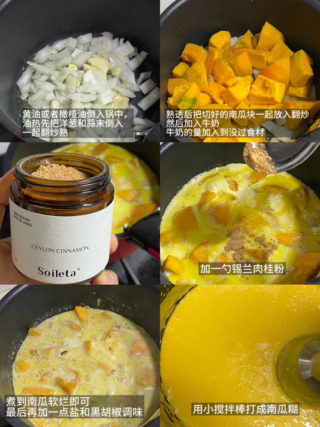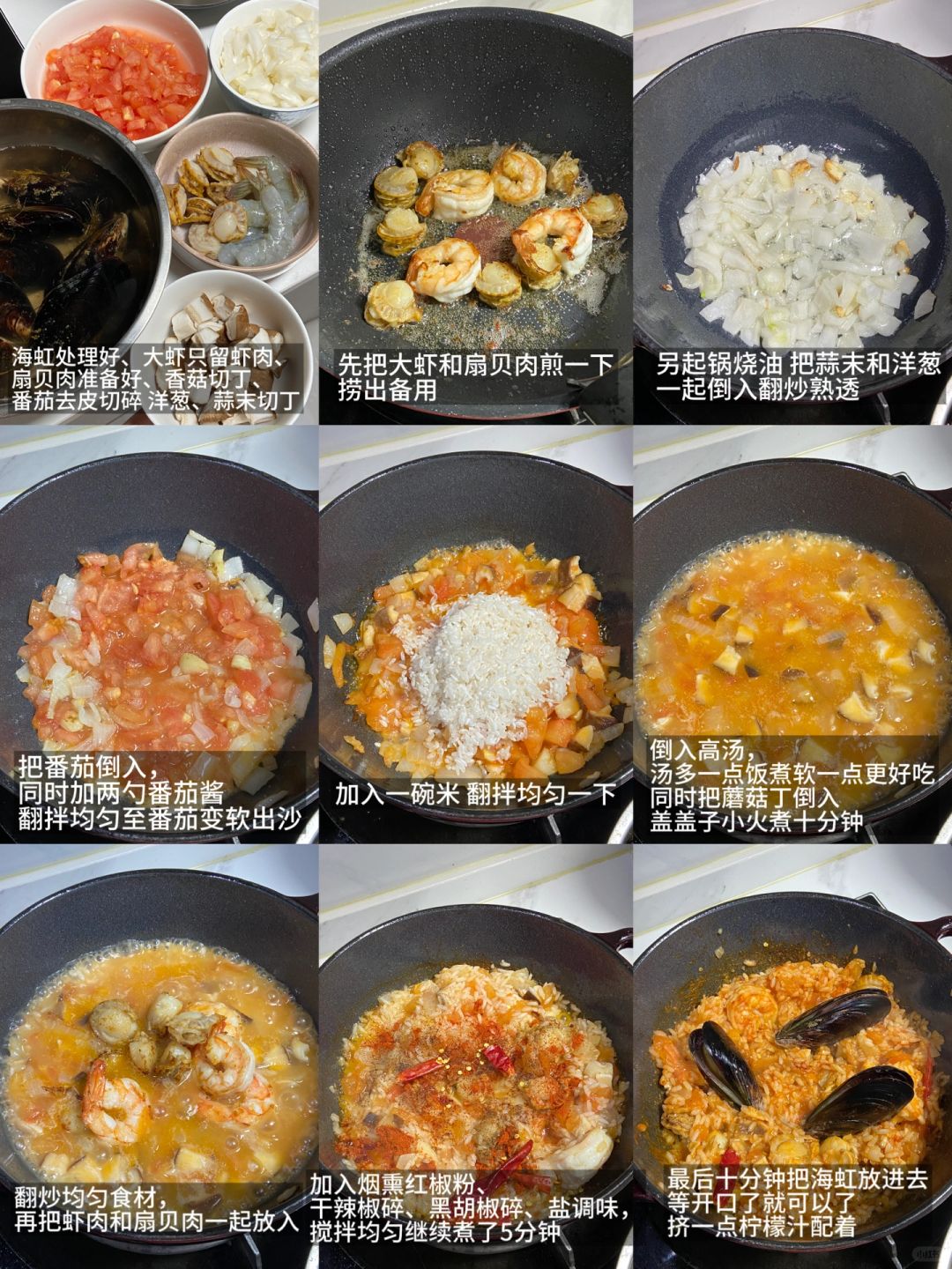 小厨房开餐!今天是一顿美味海鲜烩饭,和肉桂南瓜汤一起吃得饱饱!食谱如下: ——————【辣海鲜烩饭】—————— 食材: 大虾|扇贝肉|海虹(青口贝)|香菇|番茄|蒜末|洋葱|大米|高汤 步骤: 1)海虹先清洗干净,把足丝给处理一下,等待备用,大虾去头去壳,清理虾线,扇贝肉准备好 2)番茄烫皮后去皮切成丁,洋葱切小块,香菇切丁,蒜瓣切末,大米准备好 3)先把大虾和扇贝肉煎一下,捞出备用 4)再起锅烧油,我直接用的炖煮锅,先把蒜末、洋葱倒入翻炒熟透,再把番茄倒入,同时加两勺番茄酱,翻拌均匀至番茄变软出沙 5)加入一碗米,倒入高汤,汤多一点饭煮软一点更好吃,同时把蘑菇丁倒入,盖盖子小火煮十分钟 6)十分钟后,翻炒均匀食材,再把虾肉和扇贝肉一起放入,加入烟熏红椒粉、干辣椒碎、黑胡椒碎、盐调味,搅拌均匀继续煮了5分钟 7)最后把海虹贝加进去,继续盖盖子煮到完全开口,盛到碗里再加一点黑胡椒粉、欧芹碎 ——————【肉桂南瓜汤】—————— 食材: 锡兰肉桂粉|贝贝南瓜|蒜|洋葱|牛奶 步骤: 1)黄油或者橄榄油倒入锅中,油热先把洋葱和蒜末倒入一起翻炒熟 2)熟透后把切好的南瓜块一起放入翻炒,然后加入牛奶,牛奶的量加入到没过食材,再加入一勺锡兰肉桂粉,搅拌均匀 3)小火慢煮,煮到南瓜变软,最后再加一点盐和黑胡椒调味,用小搅拌棒打成南瓜糊,我最后又烤了一点南瓜和鹰嘴豆,摆盘开吃 tips: 其实肉桂粉和锡兰肉桂粉是两种东西,锡兰肉桂粉用来做西餐烘培比较多,本身是微甜不辛的味道,做肉桂卷也很适合,锡兰肉桂粉也是抗炎的好帮手,天冷时候在咖啡里加上一点做成肉桂咖啡也相当不错呢
