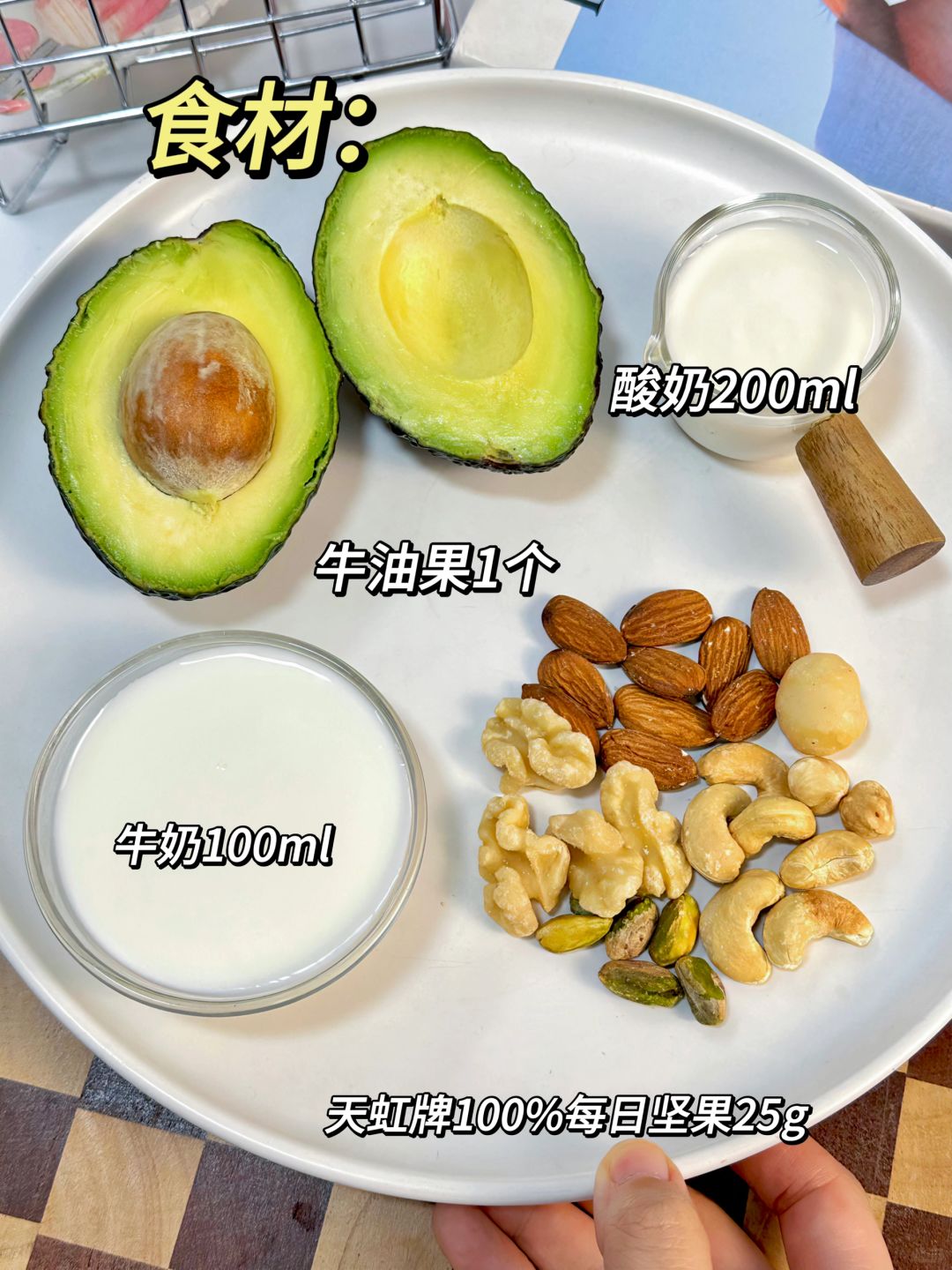 🌈食材:每日坚果一袋25g、牛油果1个、无糖酸奶200ml、牛奶100ml