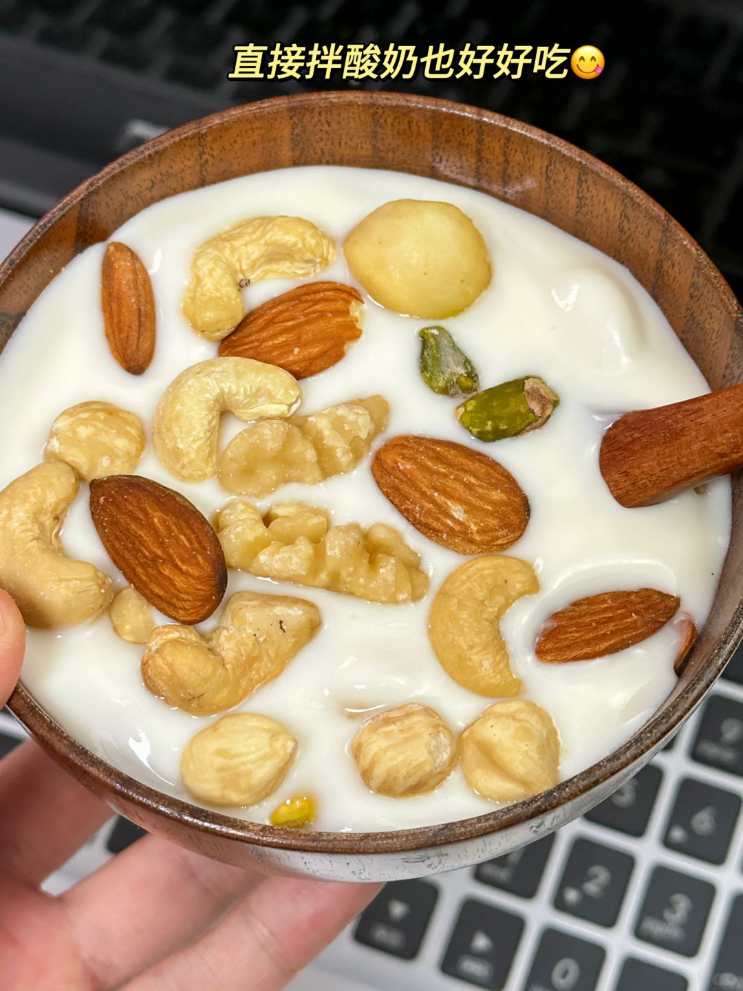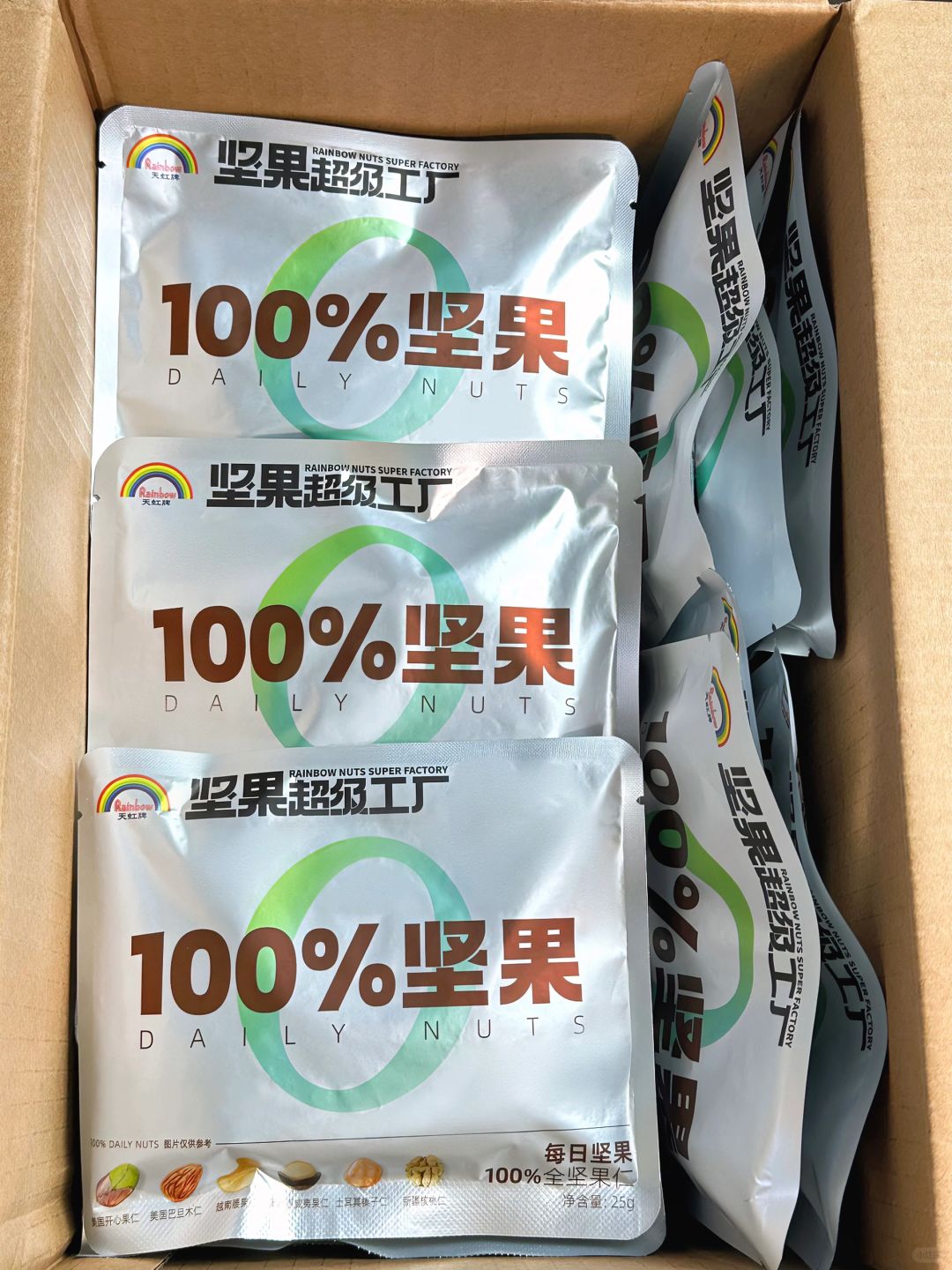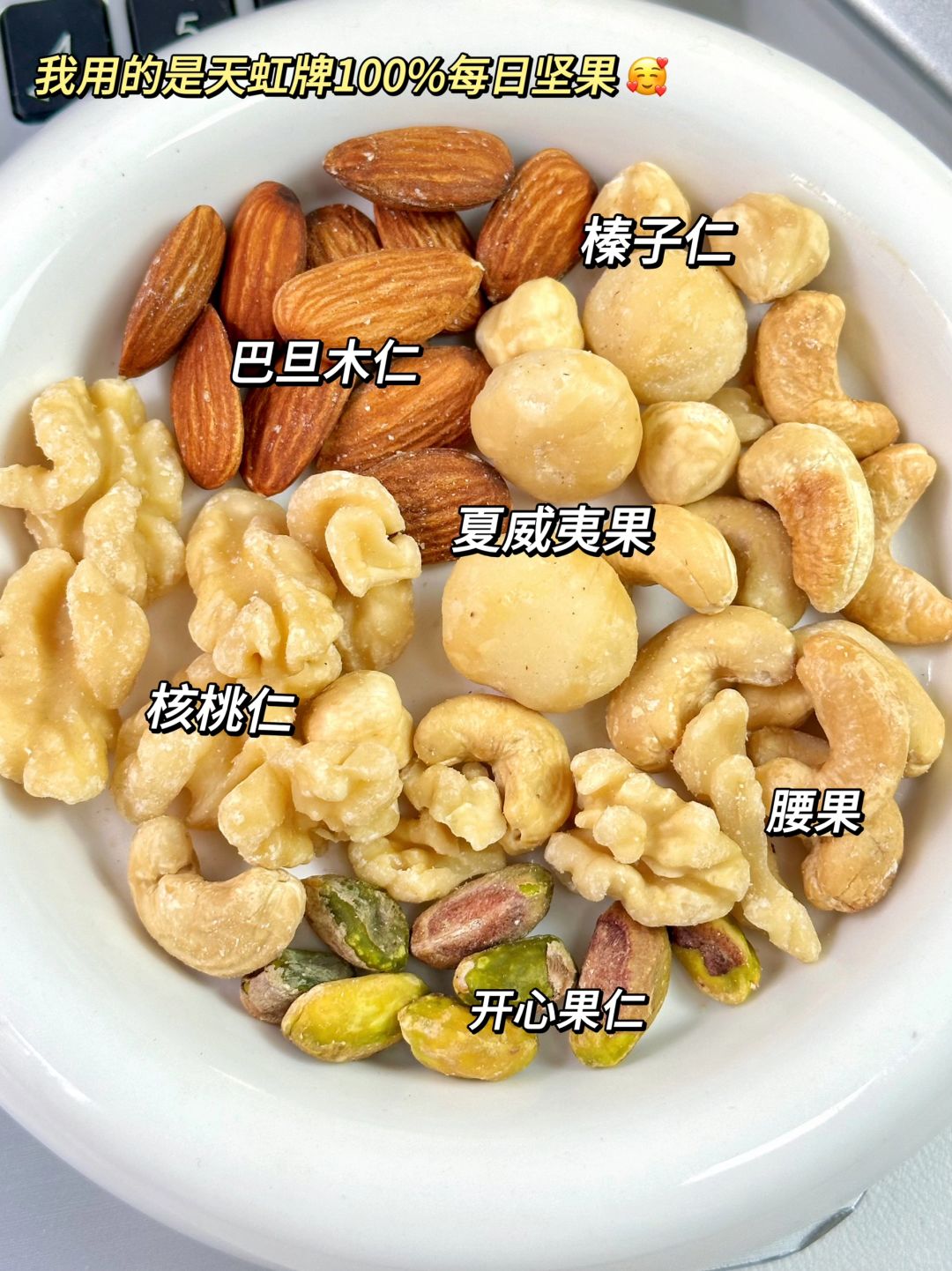 坚果选的是天虹牌100%每日坚果,里面没有果干凑数,只有纯坚果仁,小小一包很容易控制量,而且6种坚果科学配比😋比单一坚果要营养均衡,独立包装随时可以开出来吃,方便很多!