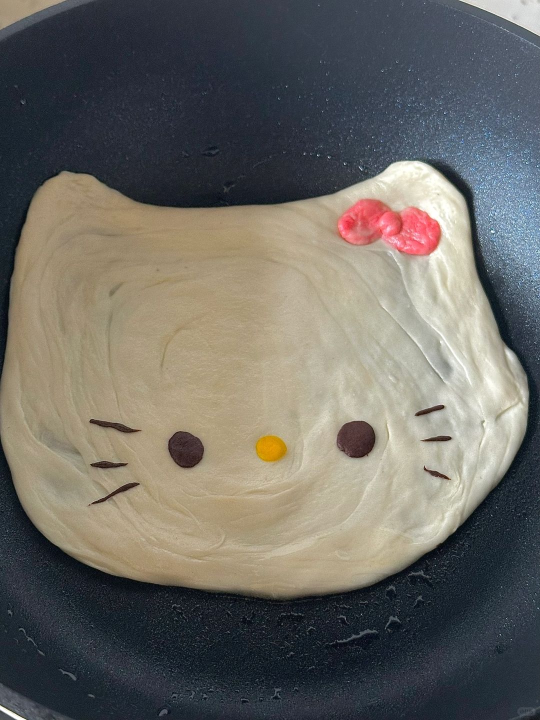 3.松弛好的饼胚擀扁,装饰上表情,平底锅抹一点点油两面烙熟