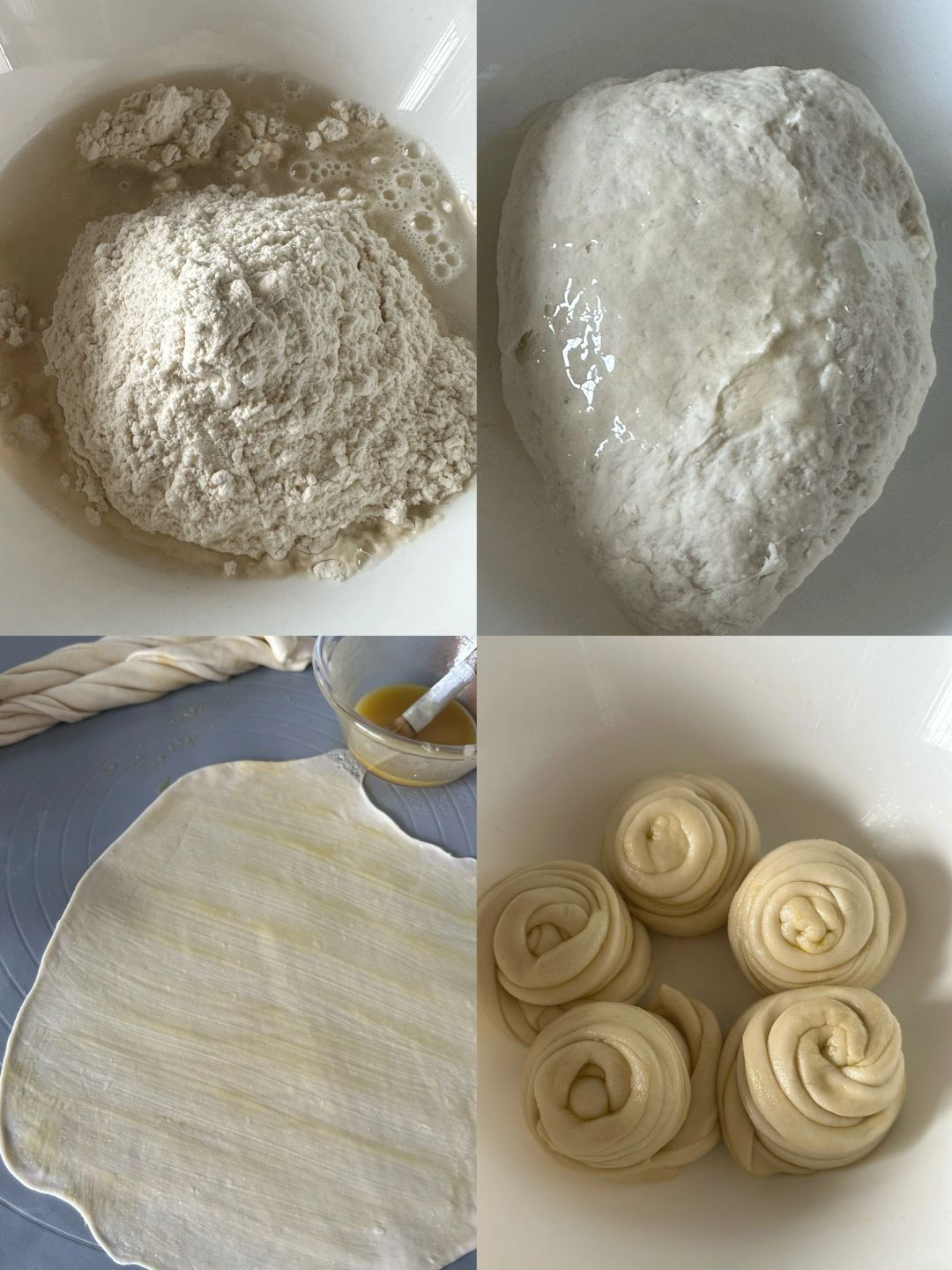 2.饼皮擀扁抹上油酥,拧成麻花状态,然后卷起来再次松弛半小时