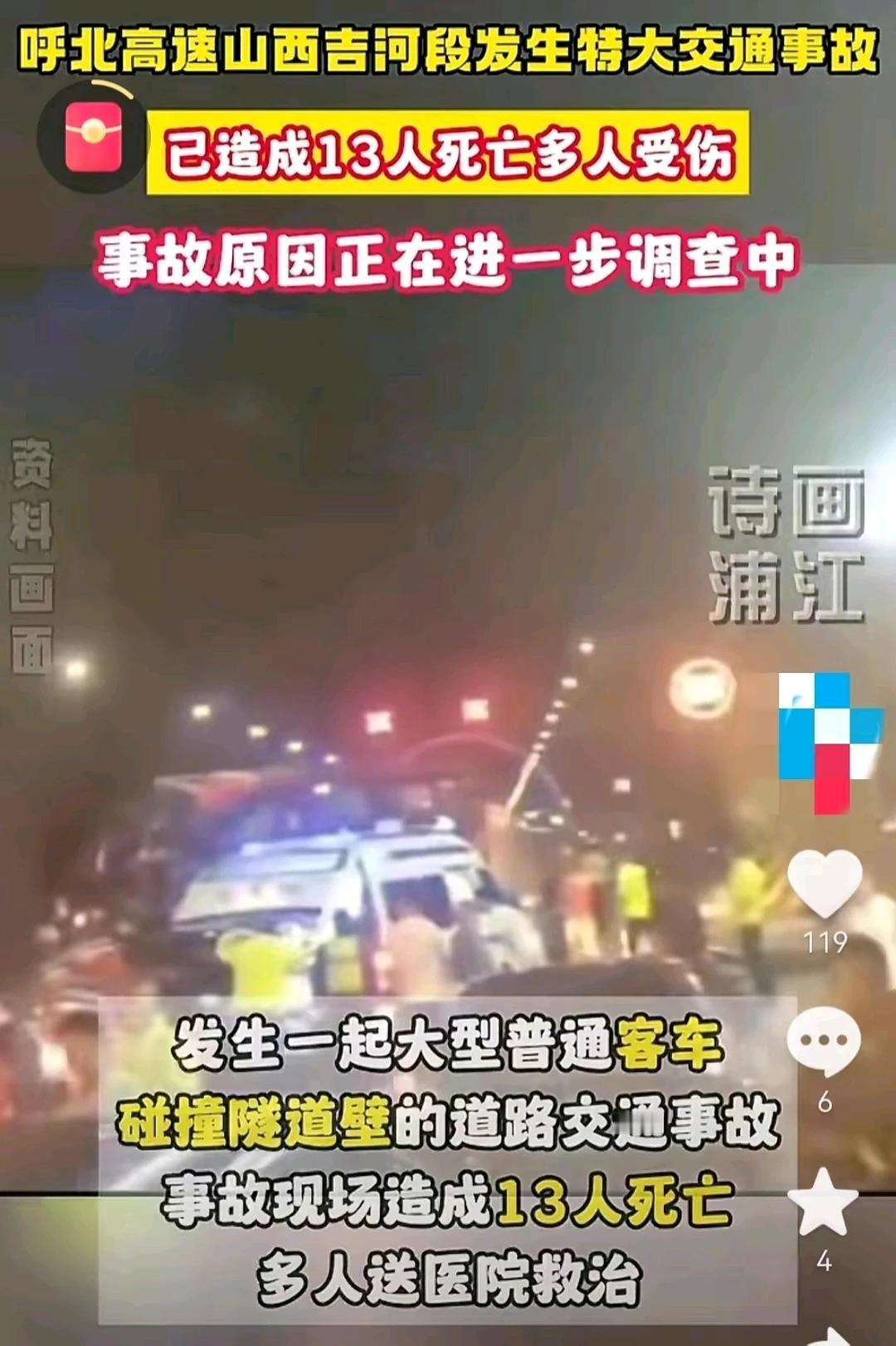 突发!14人死亡,37个人受伤的惨剧!3月19日14时37分,呼北高速发生了一起大型普通客车碰撞隧道壁的交通事故,事故已造成14人死亡,37人受伤,驾驶员司机也已经去世。发生事故的车辆是大巴车,为河南牌照,发生事故的时候,车上有人员51人。 这是一辆旅游大巴,车辆核载54人,当时大巴车实载51人,没有超载。 事故的发生地点在,山西省临汾市乡宁县西交口乡境内。 事故发生的时候,是车辆撞击隧道墙体造成多人被困。 也就是说,不是和别人撞车,而是自己撞上了隧道墙体。 很多人都质疑隧道的安全问题。 交通运输厅的一名值班室工作人员说:隧道内照明畅通,并无其他影响交通安全的因素存在。 现在救援现场已经结束,事故大巴车驾驶员也已经去世。 这次事故造成14人死亡,另外37人去医院接受治疗。 出现这么一个重大事故,令人害怕又心痛。 这旅游大巴司机是睡着了吗? 视频中,一辆载有51人的河南牌照的大巴车突然偏离行车道,以较快的速度撞击了隧道墙壁。 速度快,又发生巨大的碰撞,真惯性可想而知。 很多人被不同程度的被甩飞,与其他硬物发生撞击。 这个力量是很大的。 这个撞击,导致14人死亡,37人受伤的不幸场面。 全车人无一幸免,伤的伤,死的死。 惨剧发生后,110,120,…很多部门都是第一时间赶往现场进行救援,全力挽救受伤人员的生命。 这是一个不幸的事情,14个家庭的悲剧。 37个家庭的痛苦。51个家庭陷入人荒马乱的境地。 唉!希望这些家属节哀顺变,受伤的人员能够及时治疗。 太惨了,令人难以接受。 河南牌照的旅游大巴,那肯定是河南人去外地旅游的。 这突如其来的飞来横祸,令很多家庭蒙上阴影。 司机也在这次事故中丧生。 不知道这司机是不是疲劳驾驶或者睡着了吗? 隧道本来就是光照不足,如果司机打瞌睡或者司机玩手机,就容易出事。 大家都知道,隧道两侧路沿应该装反光灯,走过山西许多隧道,大部分黑乎乎的,二广高速太行山隧道连续十几个都没有,视觉疲劳,很容易上墙。 长途打巴出事故太多的是司机超速啊,过度疲劳啊,或者玩手机引起的。 我曾经看见过很大司机开着车玩手机,打电话。 14条生命就这么没了,太可惜了。 人生在世,本不容易,谁能预料祸事将至,生死离别,只在一瞬,不敢奢侈未来,只能珍惜当下。 愿逝者安息,生者坚强。[祈祷][祈祷]#山西高速事件# #山西临汾大客车#
