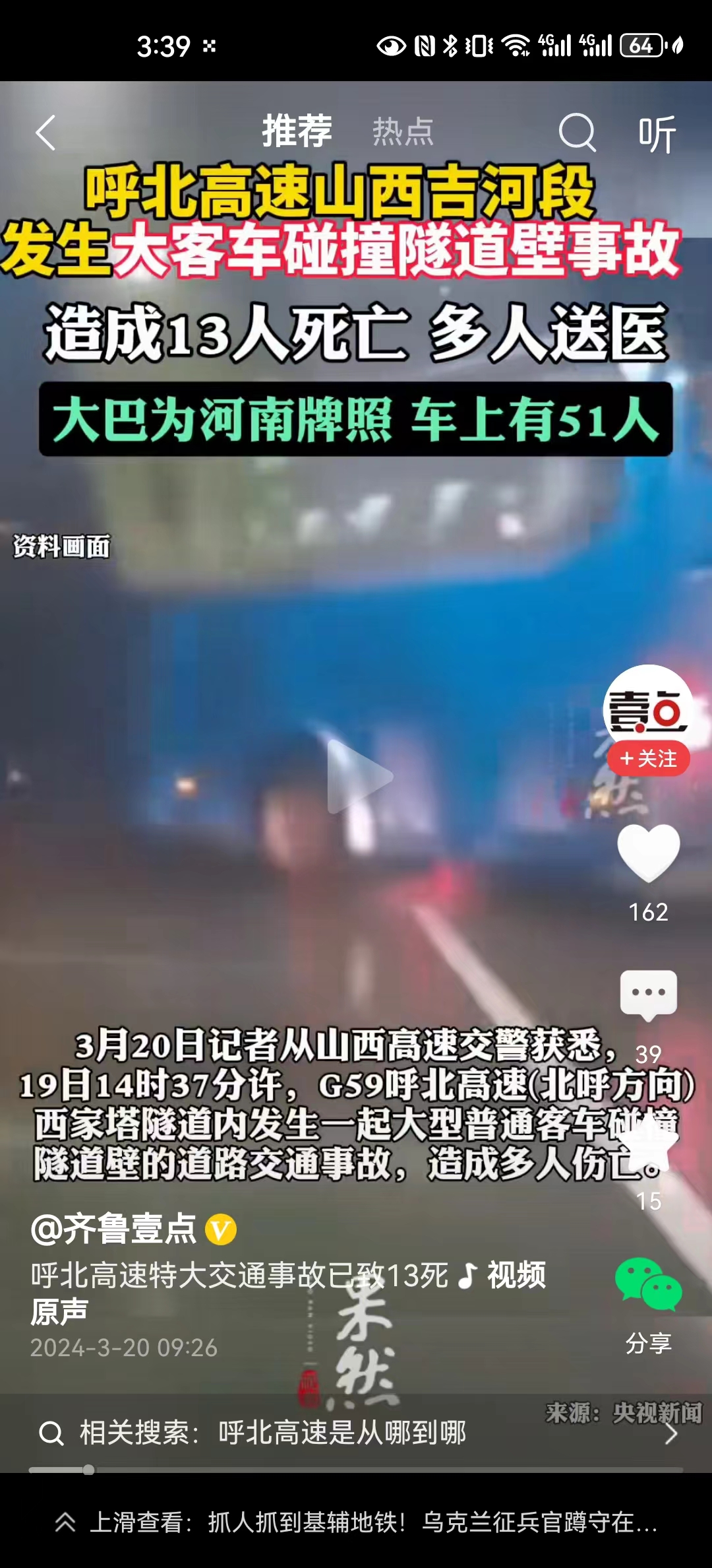 #山西高速隧道车祸至少10名伤者超68岁#这是一辆旅游大巴,很可能就是一个老年人旅游团,从河南出发,不知道目的地是哪里,估计是去陕西旅游。但是不幸的是高高兴兴出门,在隧道内发生交通事故。这场事故伤亡情况实在是太惨重了,到目前为止已经有14人死亡,37人受伤。记者报道中,其中还至少10名伤者年龄超过68岁,最少2名伤者转入ICU治疗。希望后续的伤亡数据不要再扩大了,这涉及到多少家庭的悲欢离合呀!