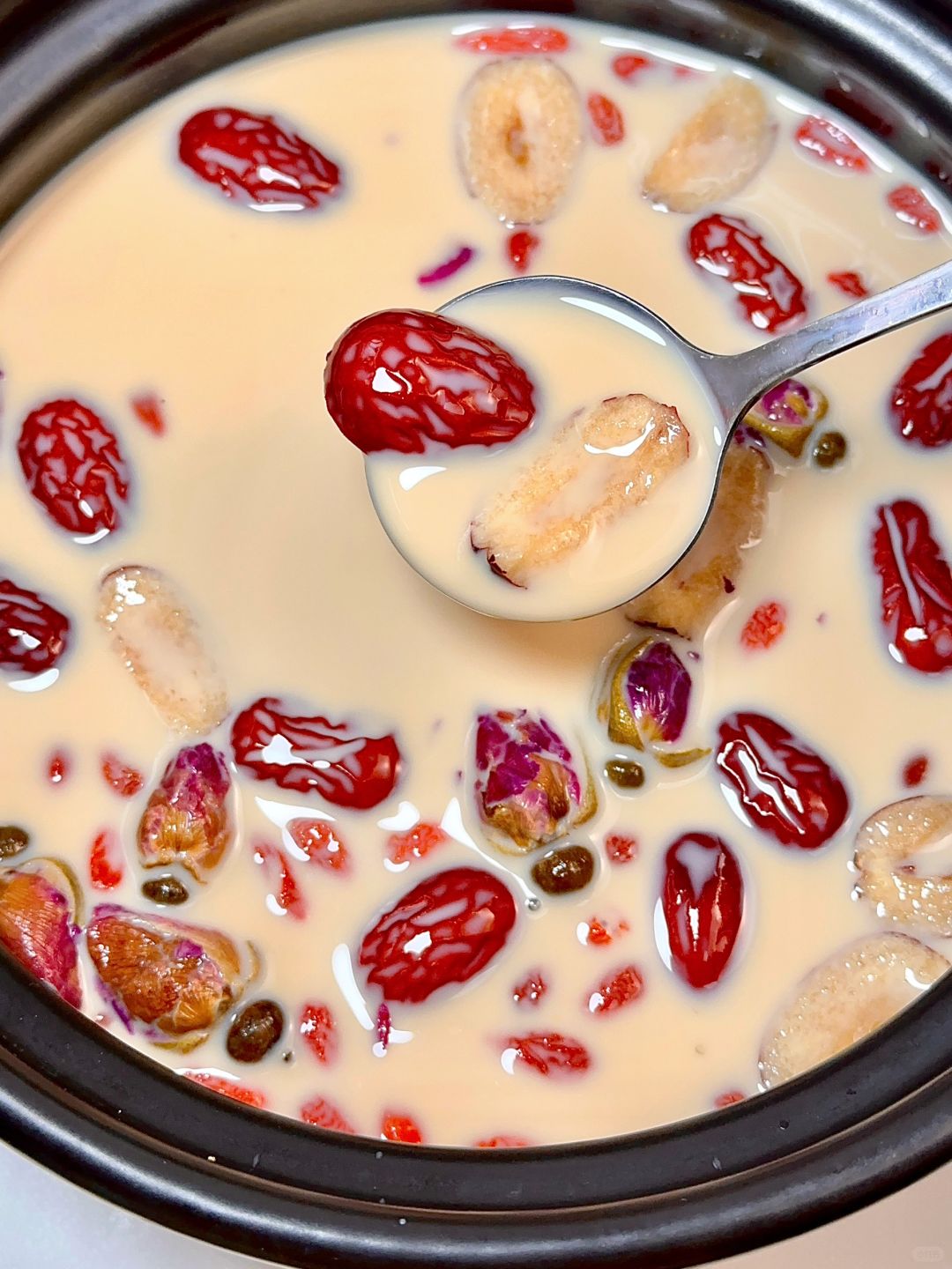 红枣牛奶茶!女孩子一定要多喝[赞R]! 奶香十足,入口浓醇丝滑!带着红枣的香甜 特别是生理期的时候,热呼呼的下肚一碗~ 全身都暖暖的,常喝小脸红润润哒! - ✅食材:红枣、红糖、枸杞、牛奶和玫瑰花🌸 做法都在图上啦!快去学!我发4!真的吼吼喝 香香甜甜的,谁还点奶茶呀哈哈哈🤣