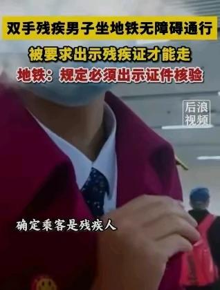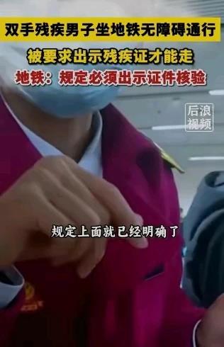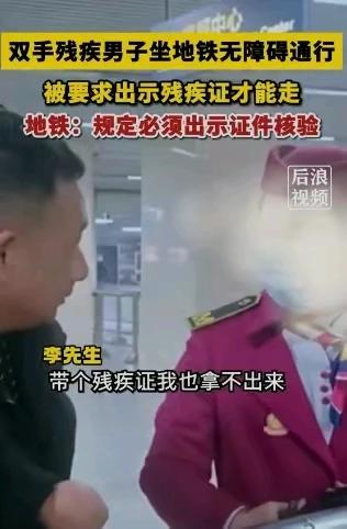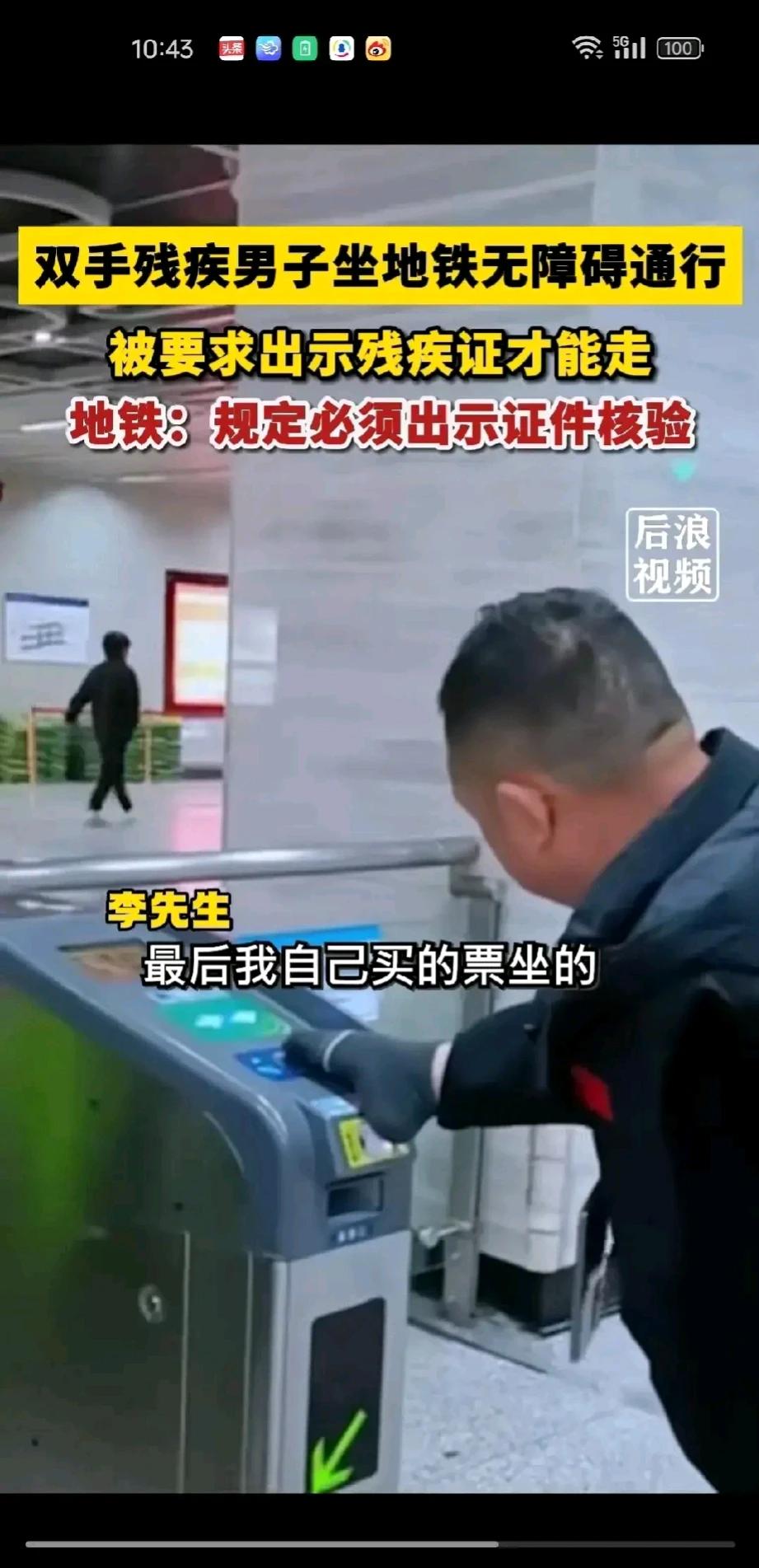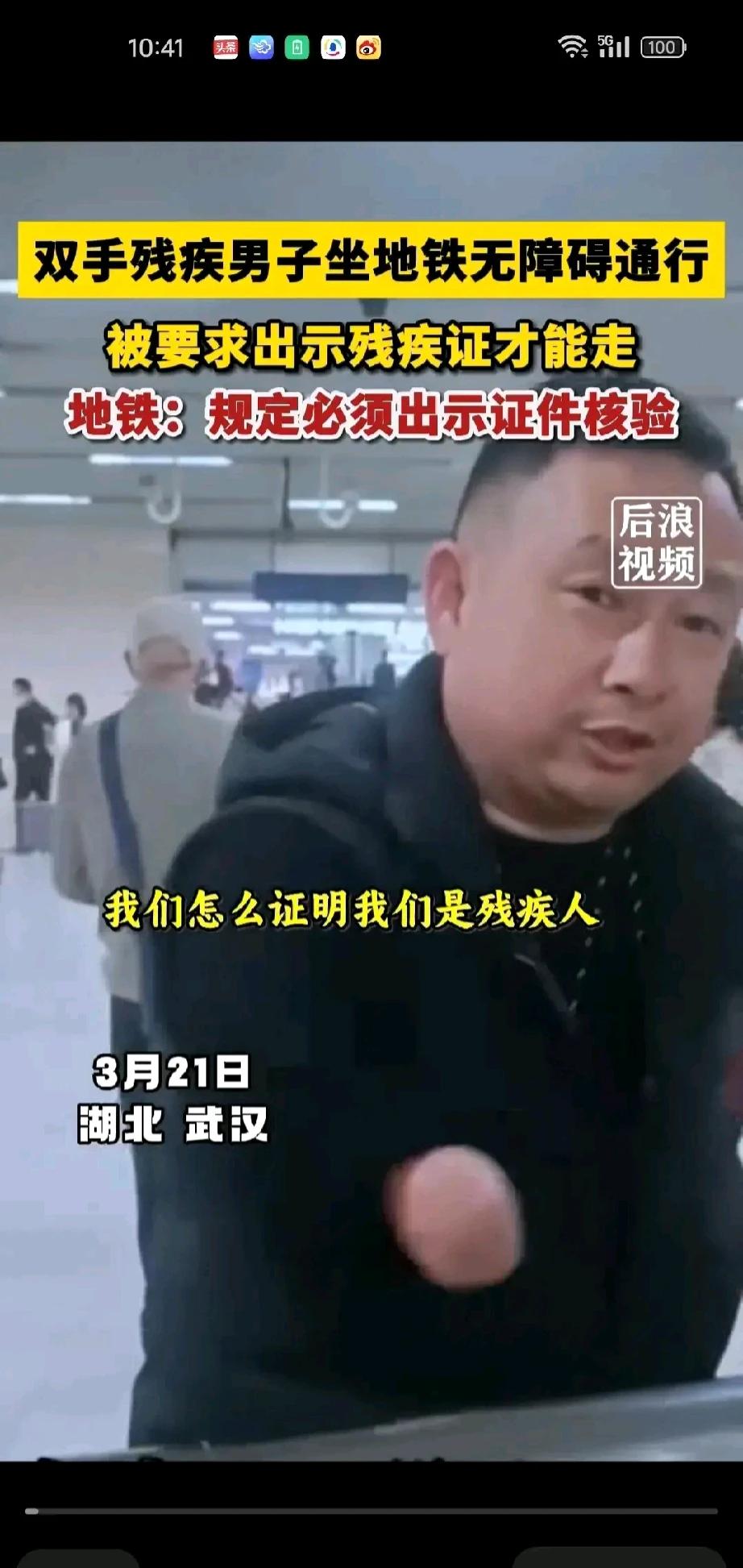 两只手都没有了,算不算是残疾人?3月21日,湖北武汉地铁上了热搜,原因很简单,就是一名没有两只手的男人去坐车,地铁没有给予优待,没有让他从无障碍通道通行,而是买了普通票走的普通通道。 原因很简单,就是这李先生忘了带残疾人证。 而自己没有双手这个事情,如果没有残疾人证,地铁就不能优惠,更不能算残疾人。 3月21日,网上突然一个视频火。 视频来自湖北武汉地铁,工作人员拒绝残疾男子进地铁坐无障碍通行的视频。。 视频我看了好几遍,确实令人气愤。 视频中,两只手都没有的残疾男子李先生准备乘地铁回家。 在视频中可以看到,李先生两只手都没有了,李先生找到工作人员,希望能给予自己优待,让他从无障碍通道通。 地铁工作人员说,李先生必须提供残疾人证才可以走,要不不能通行。 视频中,李先生说自己是有残疾人证的,但是自己忘记拿了,而且自己双手都是残疾,证件根本拿不出来,就算带了也不方便拿出来检验。 李先生说,希望工作人员能帮个忙,行个方便给自己。 但是令人遗憾的是,这地铁的工作人员没有帮李先生的忙。 他们坚持要求李先生,必须有残疾人证,没有证件,绝不放行,不免票,没有走无障碍通道。 看着工作人员非常坚决的目光和话语,李先生只好默默买了一张普通票,走了普通通道。 更令人怄火的还在后边。 明明知道李先生没有双手,他通过检票闸口的时候会有困难。 但地铁工作人员就在那里看着,没有一个人过来帮助他。 只见李先生,用脚拿着票据放在检票口,然后快速过来检票口,走的有些踉跄。 这个视频被传到网络,立刻遭到网友们的热议。 视频中有人质问地铁工作人员:检验证件的目的是什么? 地铁工作人员:确认对方是残疾人。 地铁工作人员:检验证件是政策规范要求的,需要我们检验证件之后放行,不是我们规定的,检验证件的目的,就是确认对方是残疾人。 难道李先生双手缺失!他不是残疾人吗? 地铁工作人员:没有证件,绝不放行。 应该说,地铁工作人员工作还是很负责任的。 他的工作态度很端正,一切都是看证。 只要有证,其他都是小事。 这地铁工作人员看似工作很认真,却是凉飕飕的,没有一点儿人情味,无情到底。 明明李先生没有双手,忘了拿残疾人证,在这样的情况下,就不能通融? 我现在知道人是咋死的,笨死了的。 这地铁工作人员是死脑筋,不会变通,没有人情味,不善良,只有冷冷的按章办事。 网友们更是议论纷纷。 网友:只要有证,正常人也可以是残疾人,只要没证,残疾人也只能是正常人。 网友:残疾证是官方认定的了,没有残疾证就是真的残疾都不行。 网友:免费的是残疾人证,而不是残疾人。 网友:有的人不残疾,却有残疾证,有的人真残疾,却拿不出残疾证。 网友:人性最大的恶是用有限权力,最大限度为难别人。 最后想说的是,这就是工作人员没有担当,怕自己的工作朝夕不保。 就是作为检票员和值班领导,他们做的就是检票的工作,是职务行为,都不敢为明知道正确的事情做担当。 如果这个事情,地铁工作人员让这李先生免票了,领导知道后,无非就是把自己批评一顿,然后让自己把票给补上。 但是,如果领导是一名有担当的领导,他应该不会批评这名员工,而是应该夸奖这名员工的做法,非常对有大爱。 现在,这名工作人员看着做的非常正确,按规章制度办事,没有什么瑕疵。 但是却把湖北地铁公司和地铁领导架在火山炙烤。 制度是死的,但人是活的。#武汉地铁致歉# #武汉地铁残疾人# #湖北武汉身边事# #湖北新鲜事儿# #武汉人的身边事# #湖北发声# #武汉身边的事#