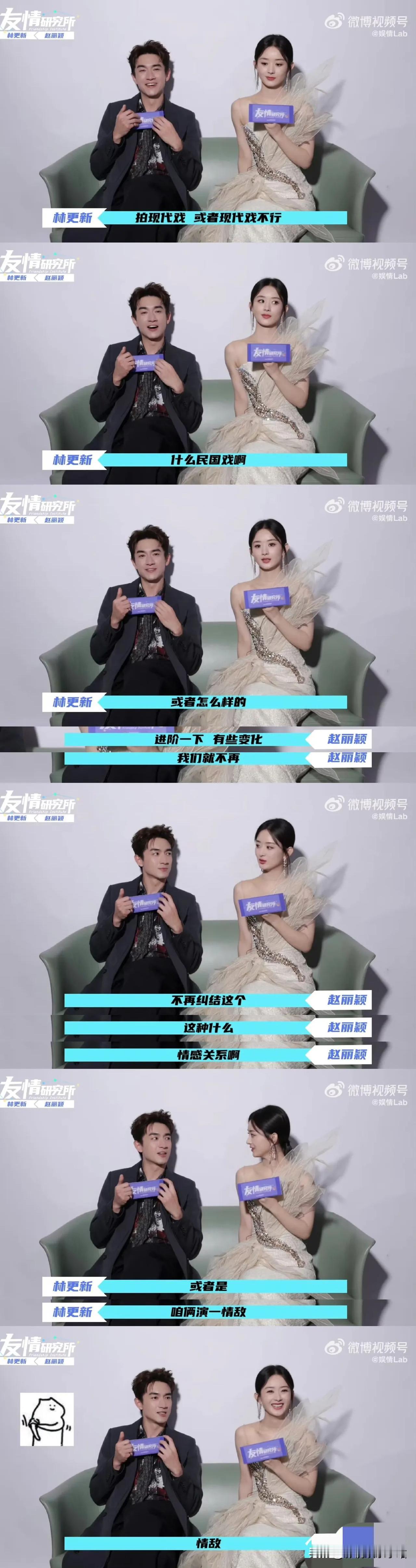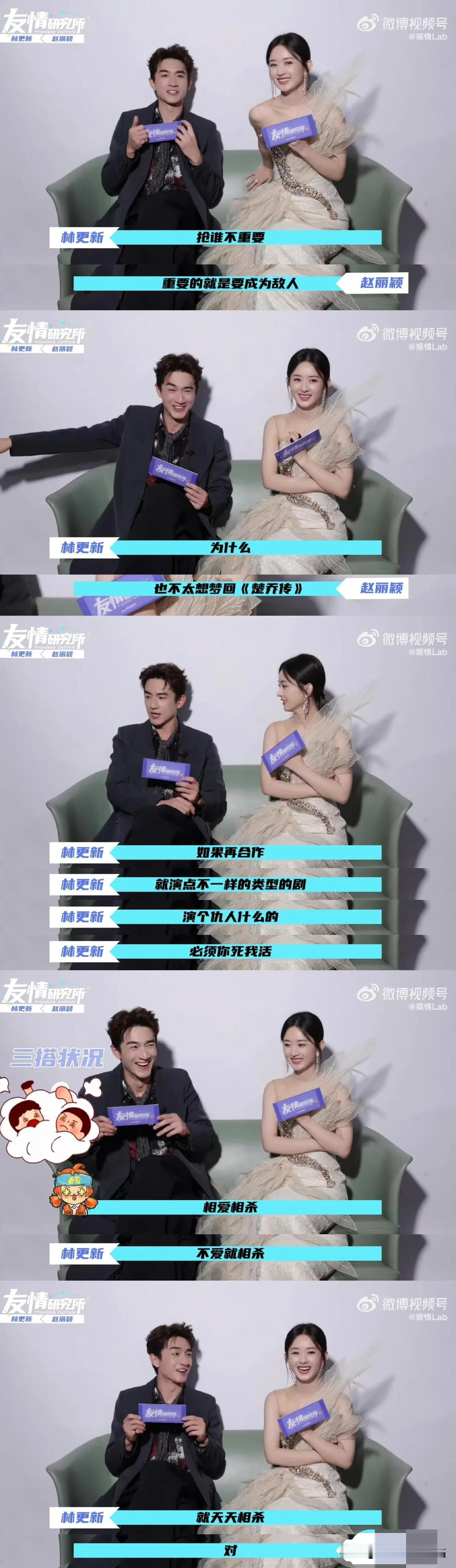 赵丽颖、林更新回答“三搭”问题: 赵丽颖:“我们就不再纠结情感关系!” 林更新:“不再跟我相爱?那就相杀吧!” 哈哈哈、感觉这采访,大新脸都快笑烂了! 我记得多年之前,在B站看到过一个up剪辑的视频。他俩好像是民国时期的间谍,丽受伤了还是怎么样,然后沉睡在梦境中醒不过来(应该接了楚乔传的剧情),然后林入梦唤醒她,好像是这样,反正到结局才反转,现在翻遍B站都找不到了。 手握现代民国大剧本的制片人们,人家话都给你们递到这儿了!有点敏锐度的制片人,这时候可以打电话拉群了!