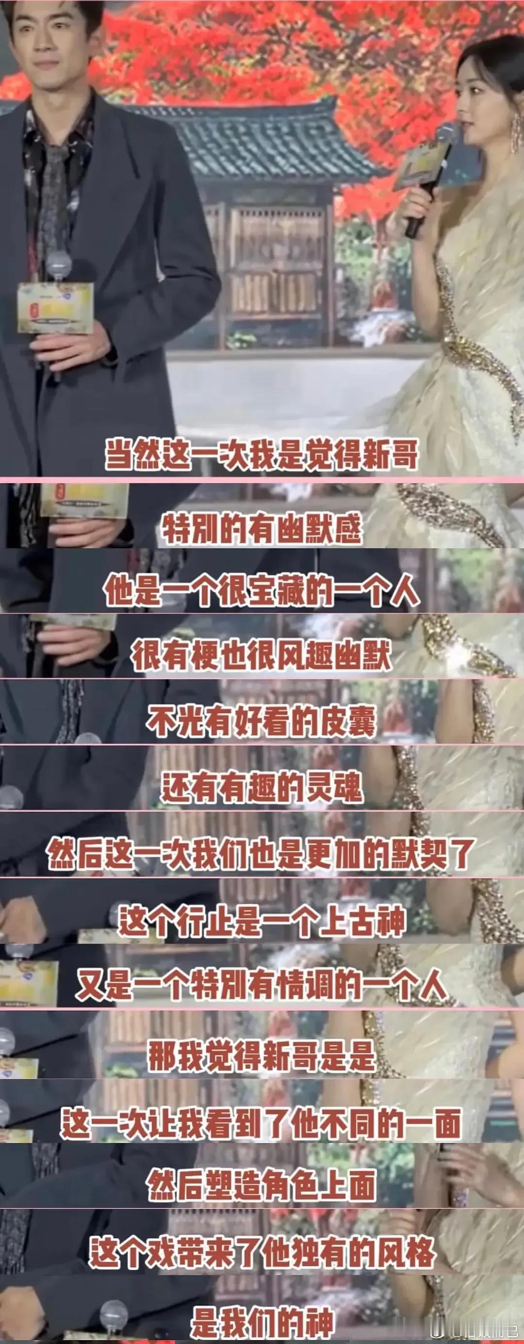 林更新:“我每次见到赵老师,就会让我眼前一亮,这个人怎么能做到,一天比一天更加漂亮,每一天给人新鲜感!” 赵丽颖:“新哥是个宝藏男孩,不光有好看的皮囊,还有有趣的灵魂!” 哈哈哈哈,你们就各种商业互吹是吧,彩虹屁不断!
