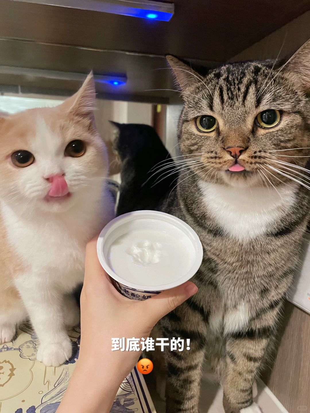就把酸奶放旁边一会儿的功夫,就不知道被哪只猫jio糟蹋了!两只猪咪都在现场,还都吐着小舌头,一脸无辜,怎么回事嘛![生气R]