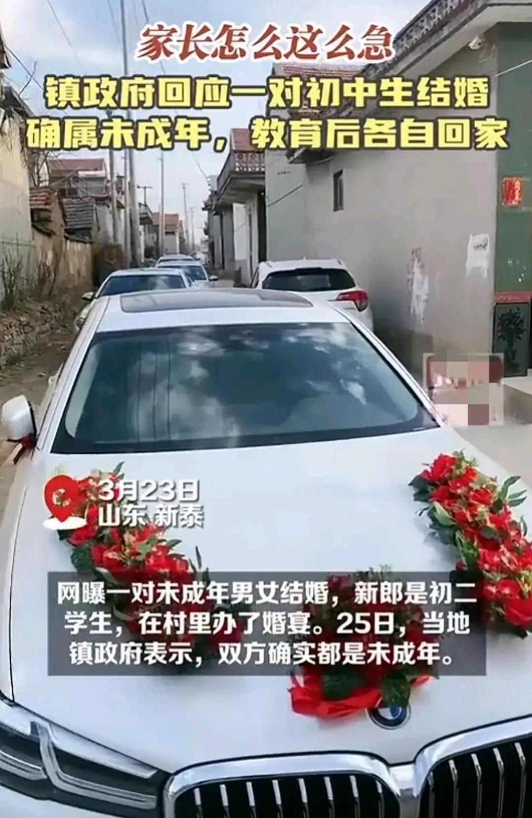 太离谱了!吓我一跳,初中生居然办婚礼了!妈呀我一看,还是我们山东人!山东新泰市人[捂脸][捂脸]近日,网传视频,山东有一对未成年小孩,在村里举行婚礼啦!其中一名还是初中二年级学生,现在已被官方证实确实未成年,目前公安,民政部门已经对双方父母进行教育啦! 现在,小新郎小新娘,都各回各家,各找各妈。 小女孩回家啦!小男孩回家了! 这小孩子办婚礼,办了一个寂寞。 这俩父母心真大,咋孩子这么小就办婚礼啊! 看着这个情况,网友们说啥的都有。 有的网友认为:结婚太早啦,不符合我国法定结婚年龄! 有的网友认为:不是说现在生育率低么,这不刚刚好结婚啦,还管! 大家都知道,我们法定结婚年龄是,男孩子不早于22周岁,女孩子不得早于20周岁。 这刚刚上初二的男孩子,也就是十三四岁的年龄,确实不妥。 不知道,他们的爸爸妈妈是咋想的。 这就这么着急让孩子们成家立业? 难道他们的爸爸妈妈给这俩孩子做主了? 俩孩子都没有脱孩子皮,就结婚确实不妥啊! 这每一个做父母的,都愿意自己家孩子早成家立业,这是人之常情。 但也不能拔苗助长,急于求成啊! 自己都还没有长大,还是孩子,怎么担起家庭重担。 他们都还没有长大,身体和心智都不够成熟,都没有经济来源,初中都没有毕业,更不说上班赚钱啦! 他们用什么来养家糊口? 所以说,这过早“结婚”,不是喜事,反而害了这俩孩子。 这三十岁多岁,四十多岁的,都没有结婚。 这十几岁的,凑什么热闹! 对此,你怎么看?#山东网友看看# #山东媳妇过日子# #山东人有多恋家# #远嫁能否幸福?# #你们还敢远嫁吗# #你后悔远嫁吗?# #后悔远嫁吗?# #远嫁可行否?# #远嫁是否后悔?# #害怕远嫁吗?#