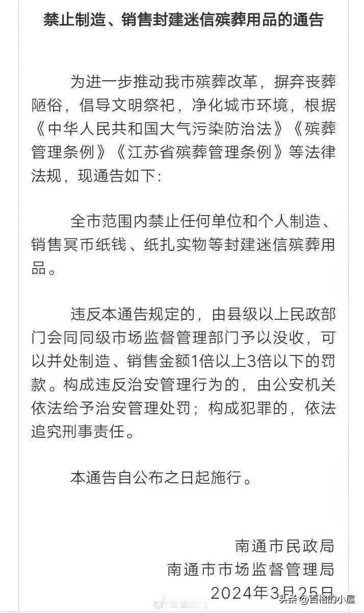 严肃认真的讨论一下,事关传统习俗该一禁了之吗 清明节是传统节日 祭祀祖先是传统习俗 祭祀用品为何是封建迷信物品 如果祭祀用品是封建迷信物品 祭祀活动是否是封建迷信活动 清明节是否成了搞封建迷信的节日 禁放烟花、禁售冥币纸钱,为啥传统文化习俗总面临被禁厄运 传统文化习俗能传承至今,必然有广泛的群众基础和普遍深厚的情感。 从南通的12345热线被打爆,群众纷纷怒斥,应该明白,人民群众不认同,会历经千年传承而不断?恐怕不用去🈲早就失去了市场。 如果一个个传承被断掉,几千年的根基还是否存在,失去根基是危险的!