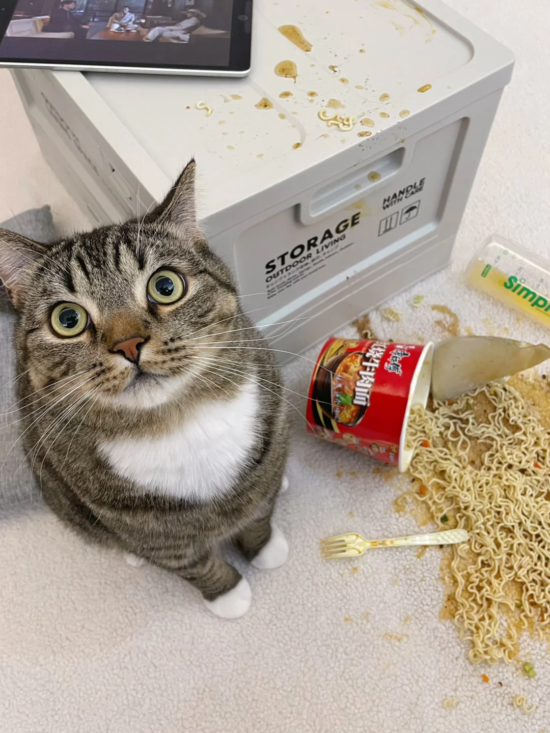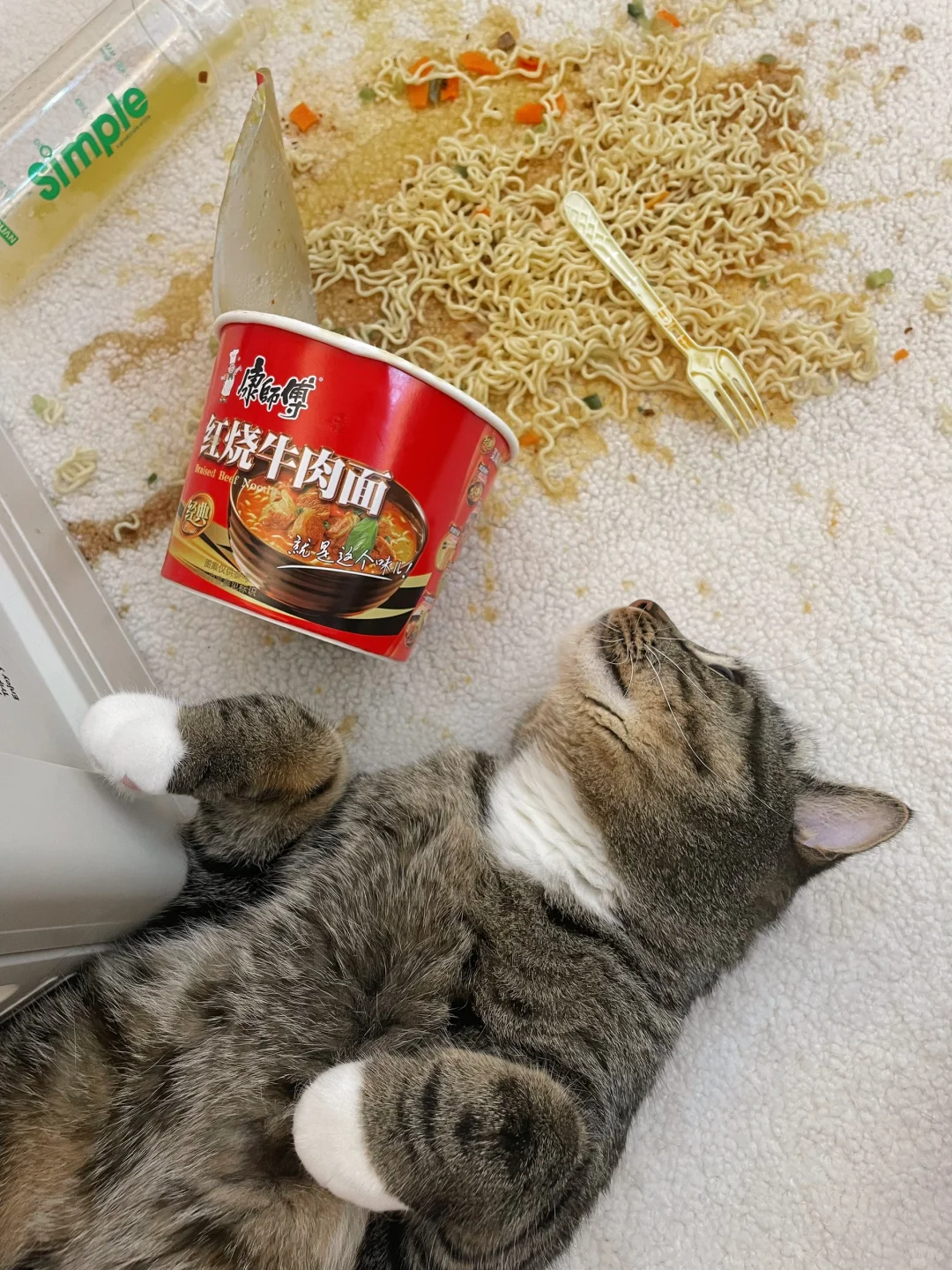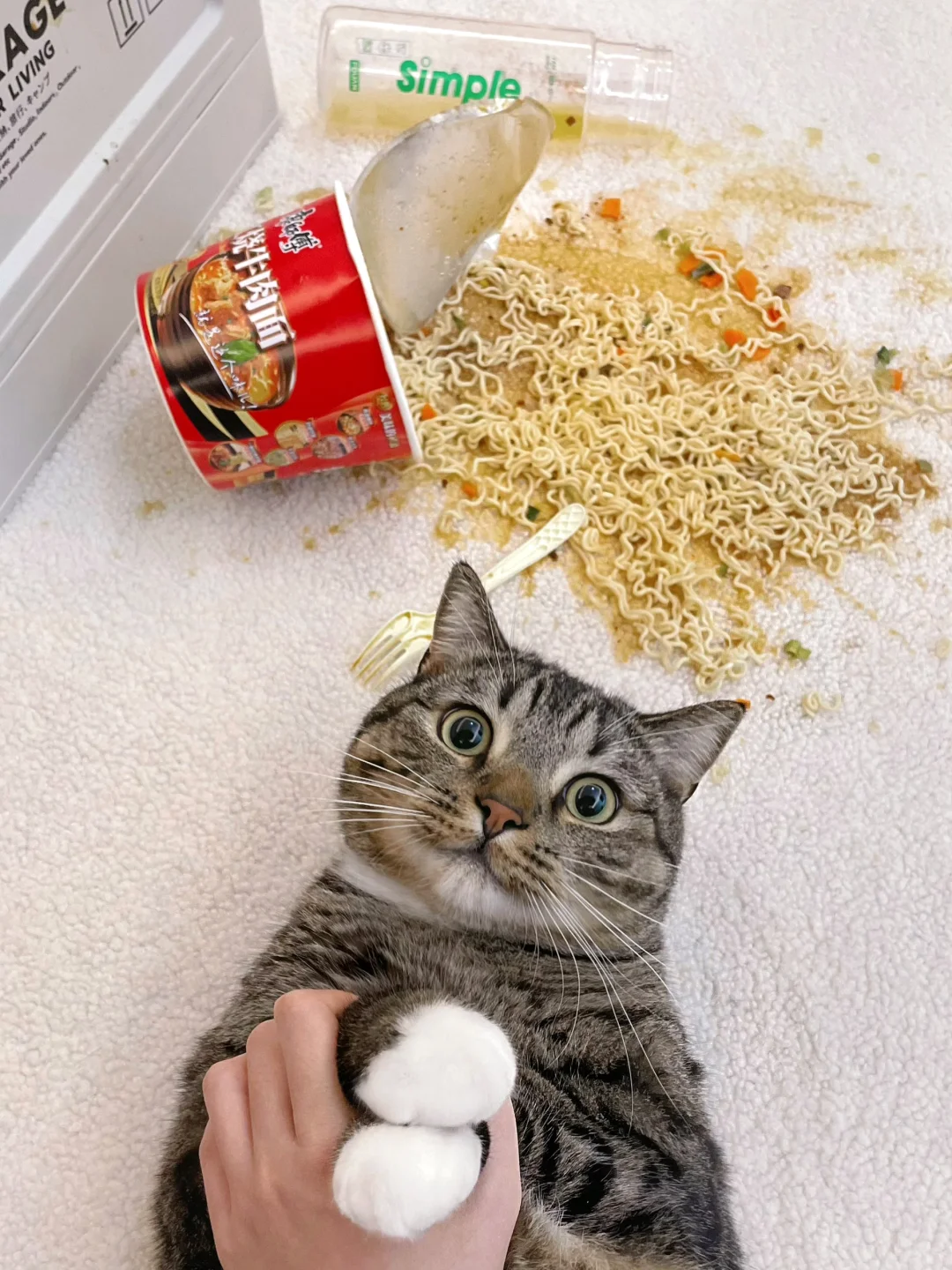 今天下班回家饿极了,本想先泡个面垫一垫,结果还没等我开吃,面和饮料都被猫打翻了...