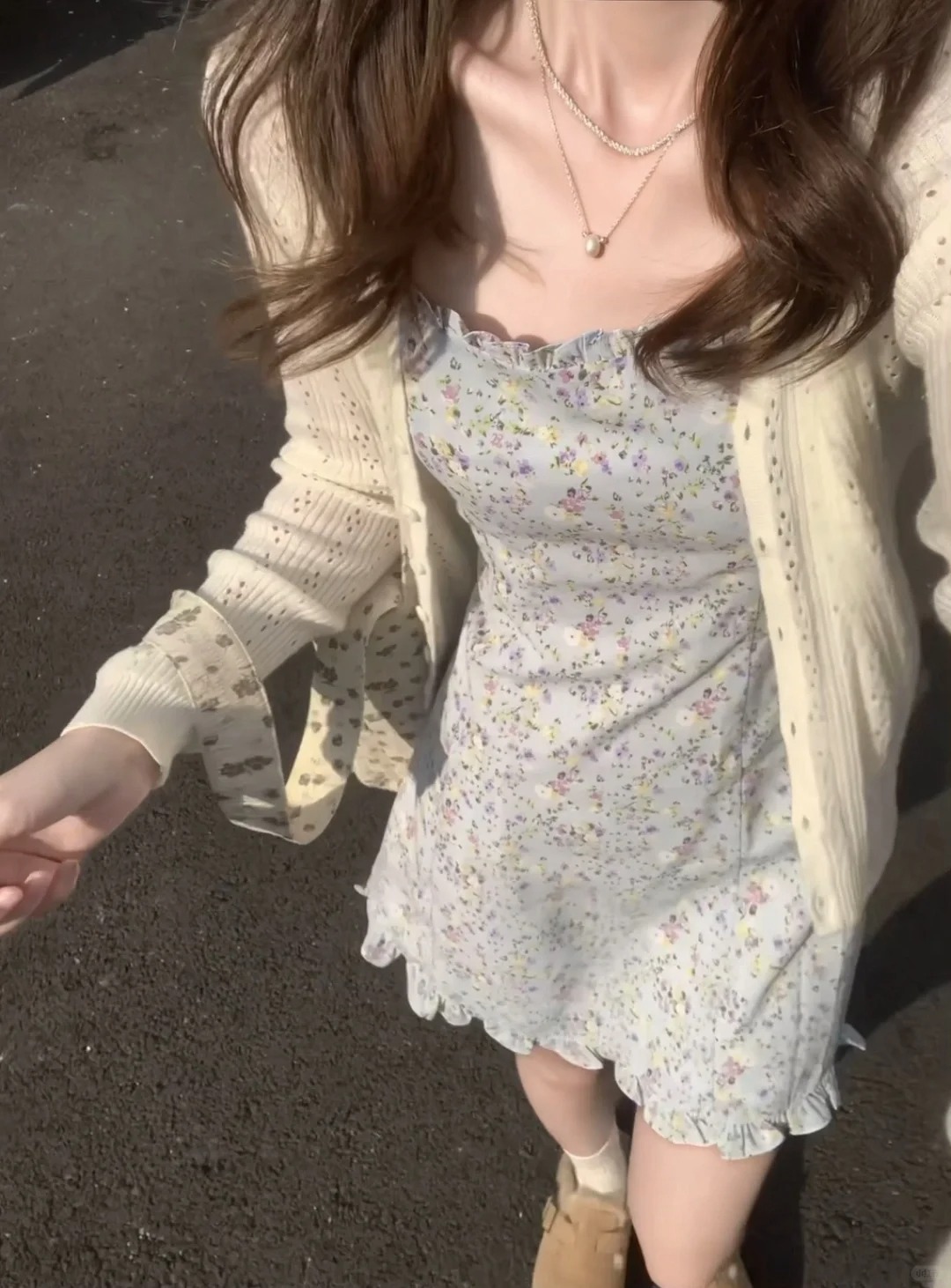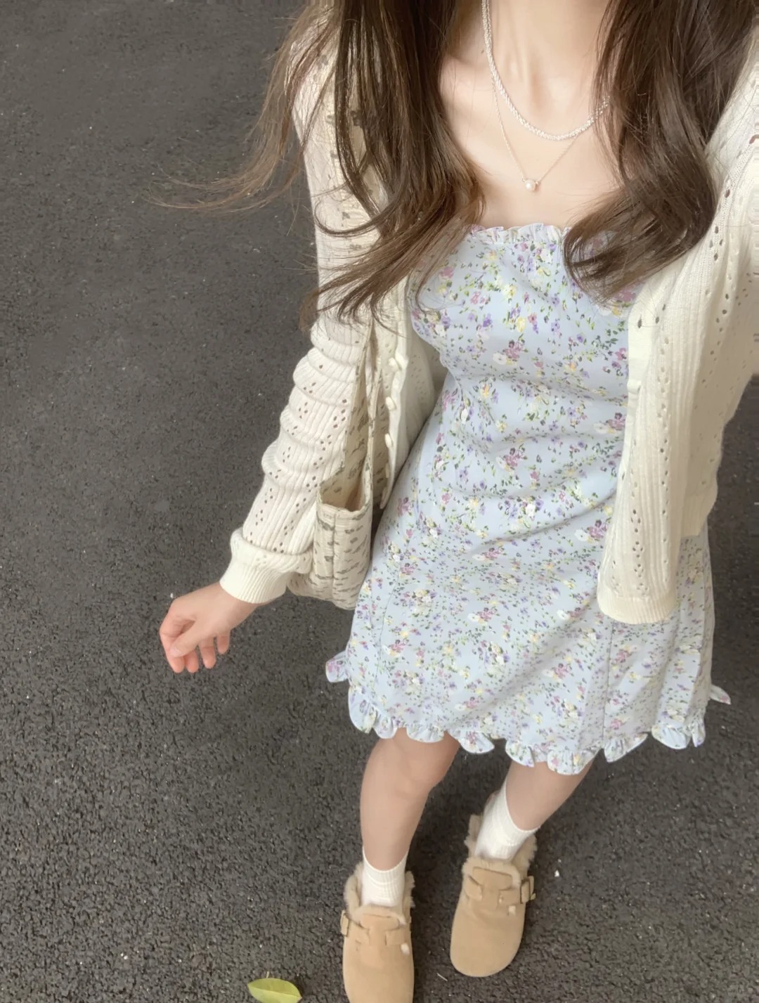 今天穿bm白色针织开衫 bm白色针织开衫➕蓝色碎花吊带连衣裙
