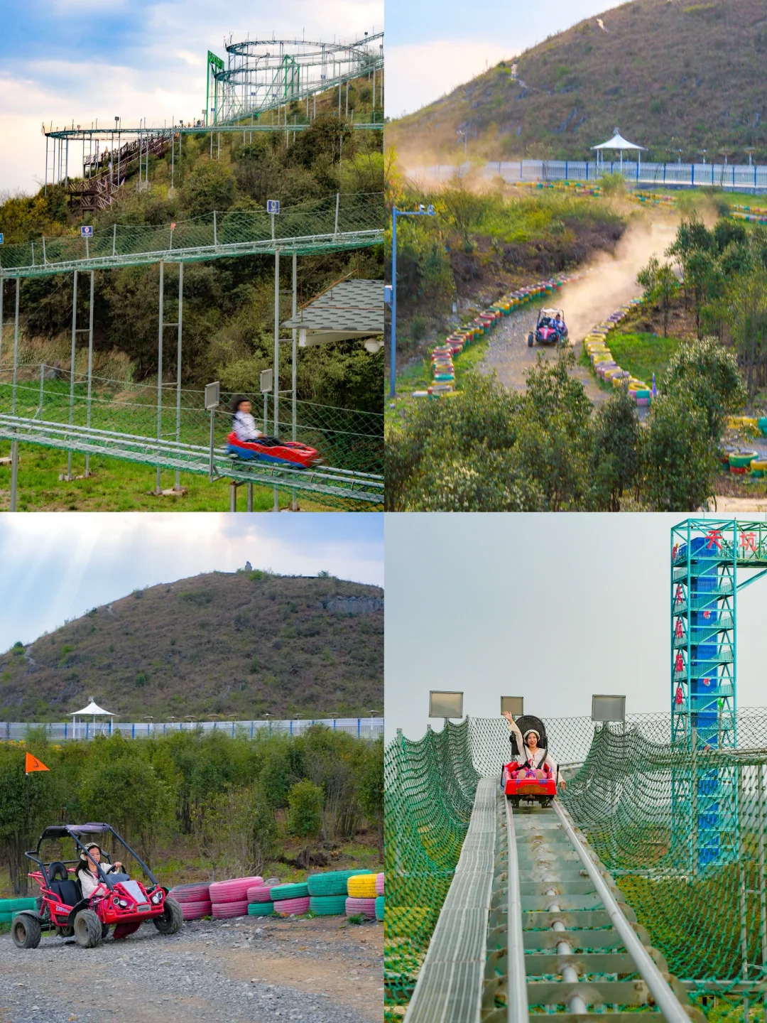 「游玩项目」管轨滑车、山地越野车、彩虹滑道、悬崖秋千、网兜吊桥……