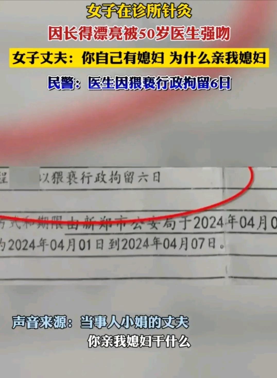 这医生简直就是流氓啊!50多岁男医生强吻漂亮女患者,并且称她长的漂亮。这漂亮就是他强吻的理由吗?这个理由很雷人。 事情发生在4月1日,河南新郑。 女子小娟在某中医诊所调理身体,针灸结束后,又按摩面部,在按摩眼睛的时候,被这名50多岁的医生突然强吻。 面对医生的强吻,这女子小娟感到莫大的耻辱,非常的愤怒。 她责问50多岁的男医生:为什么要强吻? 这男医生的回答令人可笑:因为你长得漂亮。 小娟说:漂亮的人,多了去了,你咋没去吻别人,这不是耍流氓吗? 小娟的丈夫:你亲我媳妇,想干嘛? 跌眼球的还在后面,没想到的是,这医生的妻子竟然没有认识到丈夫犯了法,而且还大气磅礴的说小娟污蔑自己的丈夫。 令人想不到的是,这妻子居然要求小娟道歉,恢复自己丈夫的名誉。 只能说,这个妻子也是一个愚蠢至极的妻子。 明明自己的丈夫错了,还纵容自己丈夫犯错,怪不得有人说,这胆大包天的丈夫背后,总有一个不明事理的妻子作祟。 这医生一家人和小娟一家,双方争执不下,谁对谁错没有说出来一二来,他们随后遂报警。 没想到,警察调取监控后,啪啪啪啪啪打了男医生一家人的脸。 经过警方认定:医生程某某治疗时趁小娟不备亲其嘴唇,因猥亵行政拘留6日。 这个处罚来的非常及时。 不得不说,警察的眼睛是雪亮的。 强吻就是强吻,假的真不了,真的假不了。 目前辖区卫生监管部门已介入,该诊所停业整顿。 只能说,这医生的行为作践了自己的职业。 这6天拘留出来以后,我估计男医生的中医诊所的生意也会凉凉。 我估计,现在男医生,还有男医生的妻子,肠子都悔青了。 但人生没有彩排,没有后悔药可以吃。
