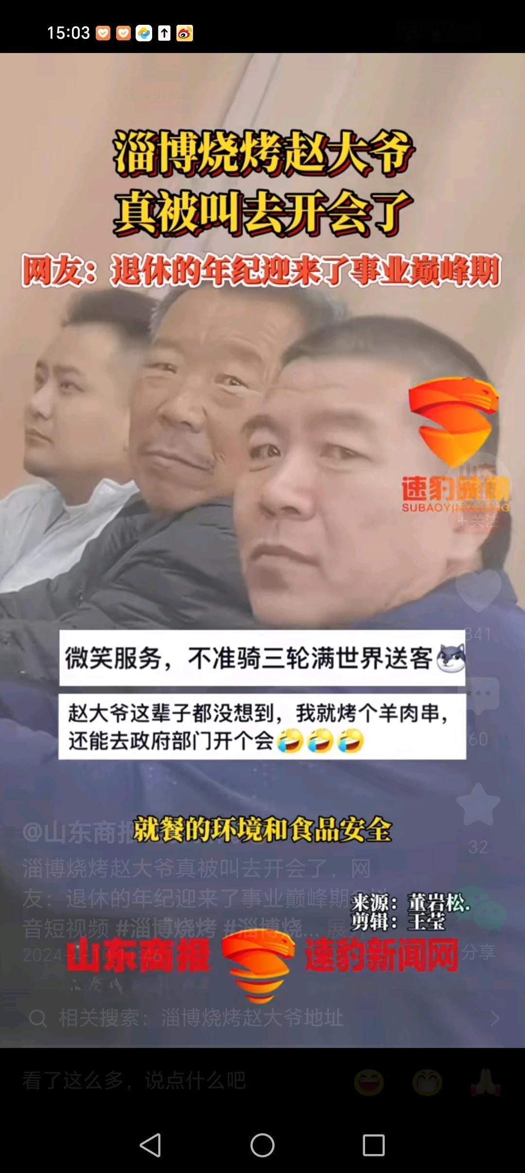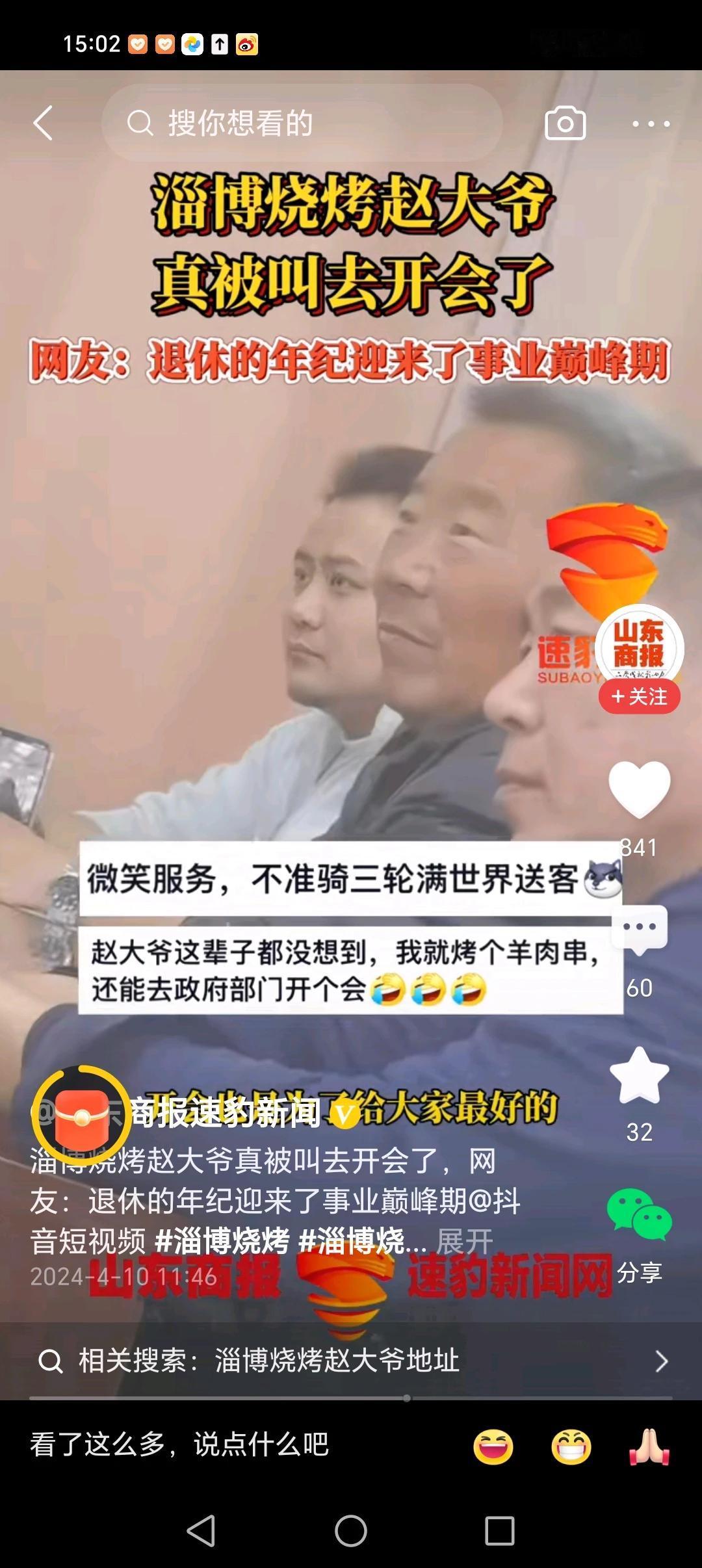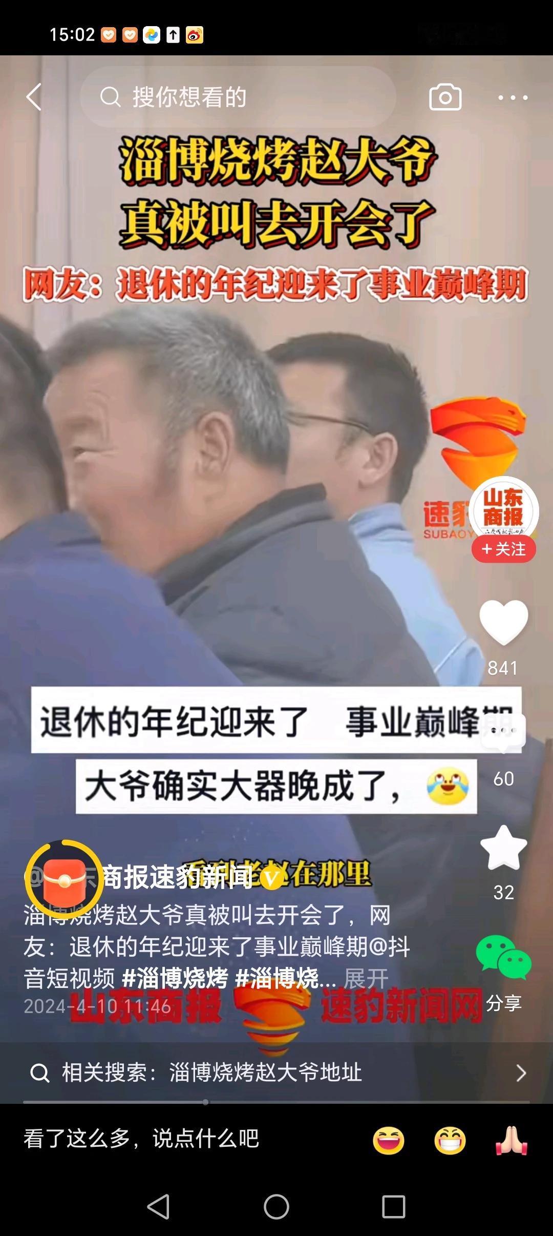 全国烧烤看淄博,淄博烧烤看赵大爷,70多岁的赵大爷,真的是大器晚成,真被叫去开会了。没想到啊!这么大年纪,迎来了事业巅峰期。 大爷啊!这都被点名了,以后就不能得瑟的刷抖音啦! 赵大爷开会,旁边坐着日日鲜老板吗? 他们俩人,这几天很热闹啊! 他俩相互送客人给对方,都想着不要太累。 网友说的好:这是赵大爷和日日鲜老板的批评会。[捂脸][捂脸]。 这烧烤都烤成非洲人,都烤的冒烟了,这不,还得抽空开会,太难了。 赵大爷:我太难了! 赵大爷:你们都去日日鲜去吃烧烤吧! #淄博烧烤#