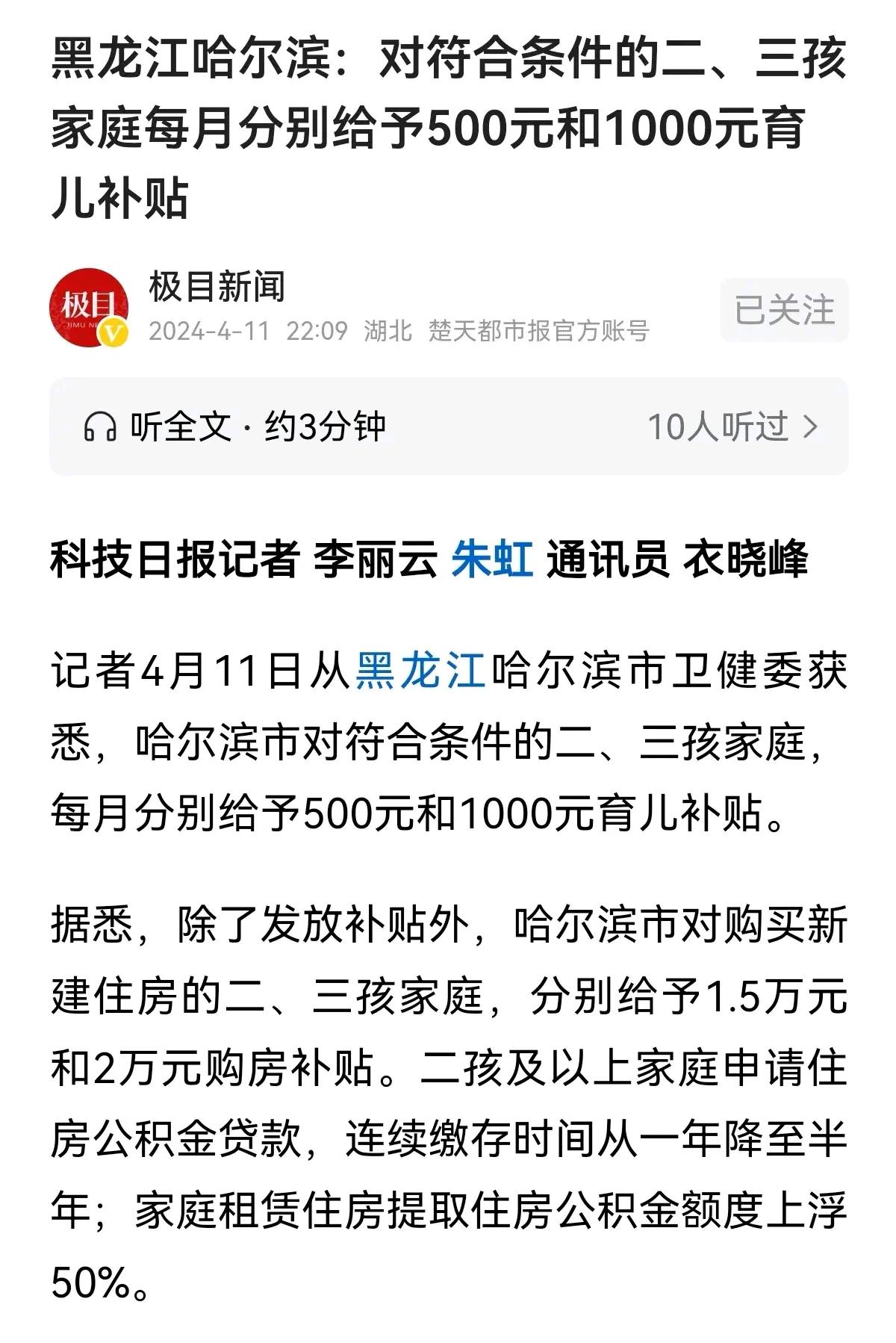 特大喜讯!生二胎三胎都有奖励和补贴啦,真的是非常贴心和给力。姐妹们,是时候拼二胎三胎啦!赶紧生吧,趁着东风的翅膀。 看看山东泰安,看看黑龙江哈尔滨,那是一个比一个有力度,一个比一个牛逼。 先看看我们山东泰安的,他是直接给二胎三胎家庭购房补贴8万,10万,是不是很给力。 哈尔滨给力,生一个二胎,三胎,每个月給500元, 给1000元,再给1.5万,2万购房补贴。 还有生育补贴3万块,爷爷奶奶给,姥爷姥姥給,这生一个二胎,三胎,现在妥妥能奖励10多万,是不是非常香啊! 香喷喷啊! 你有没有心动? 就是不知道,这些每月的补贴, 是补贴一年 还是补贴10年啊? 这个事情没弄明白。 这么多利国利民的好生育政策,是不是就可以解决低生育率以及人口负增长的困境了? 这样子的大力度补贴生育,那二孩三孩会源源不断的出现。 那我们医院的妇产科,幼儿园的升学率,都会改善很多。 那我们生育率和人口负增长都会变化很大。 朋友们,你们想生几个孩子?