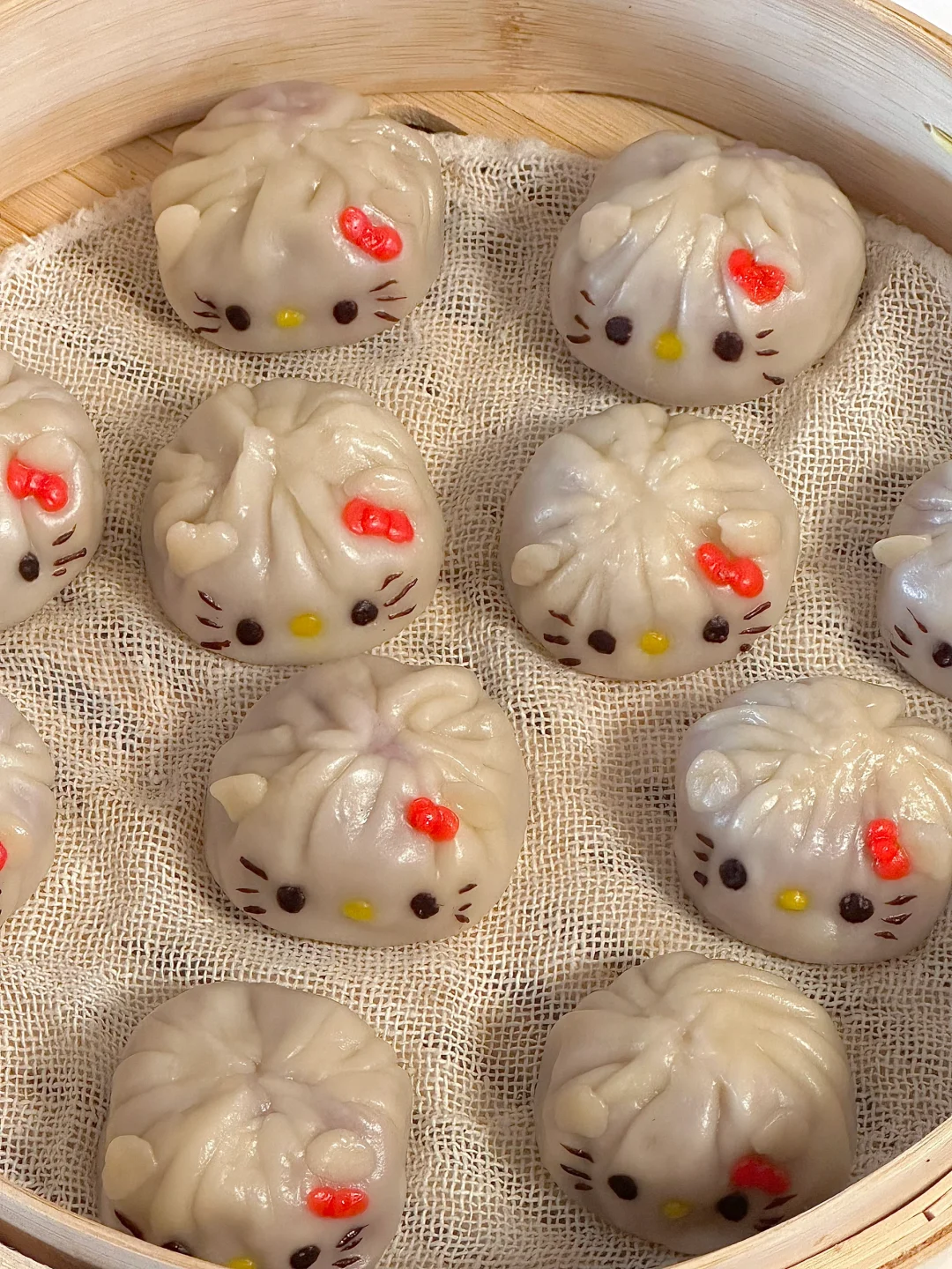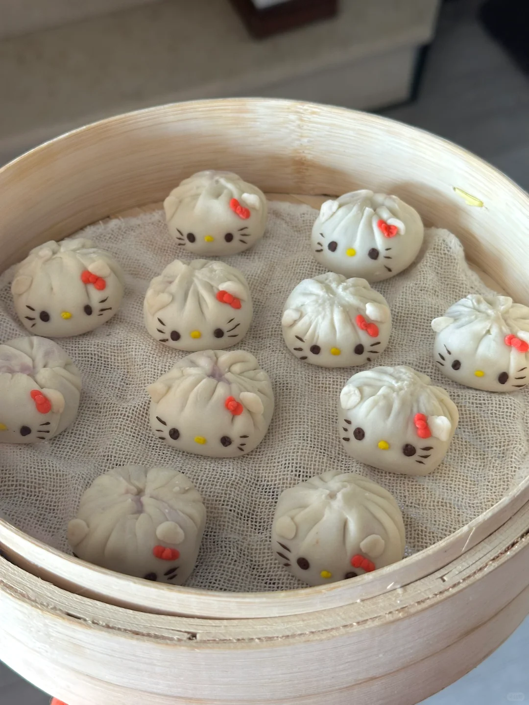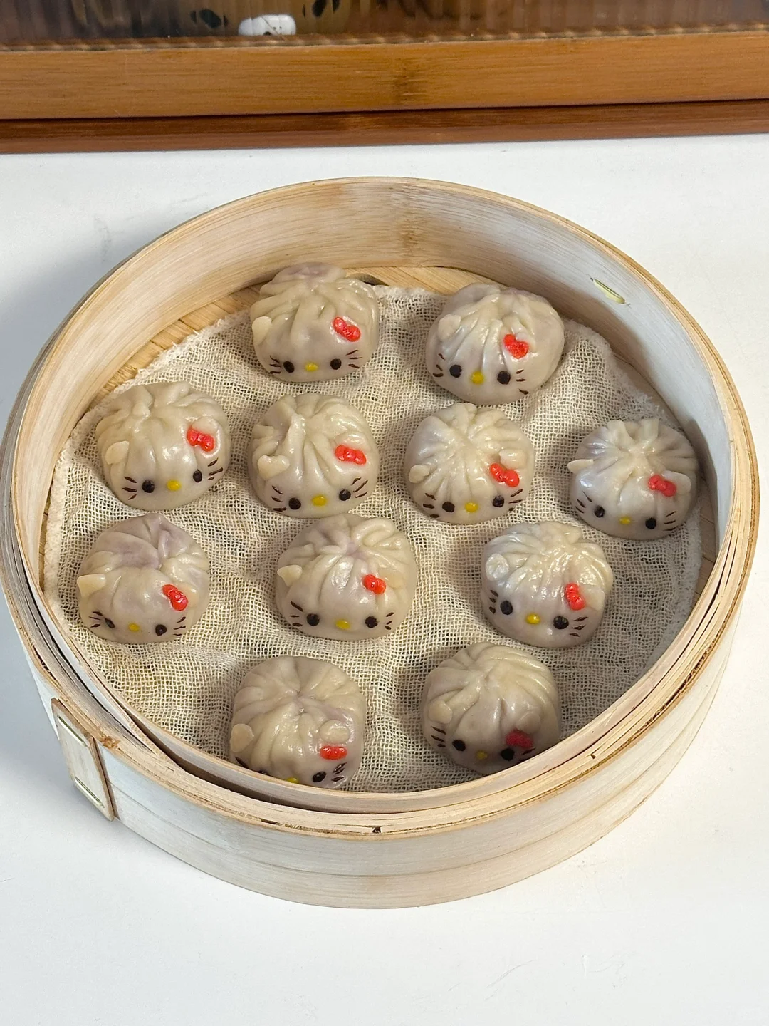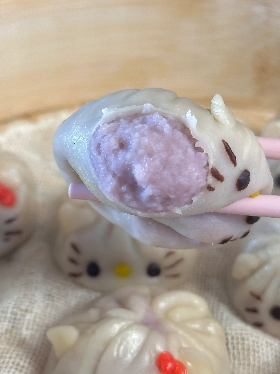 刷到鼎泰丰芋泥小笼很想吃,就自制了一下 配料: 馅料:香芋、奶油、糖、紫薯粉 皮:80g面粉、40g水、一撮盐、调色(红色、黄色、可可粉) 1.芋头蒸熟加入奶油打烂,炒干水分后加入糖调味,关火加入紫薯粉调色冷却备用 2.皮配料混入均匀,揉成光滑面团,分份调色,白色擀成皮,用被子或者小碗压出圆形(大概10g一片皮) 3.皮包入20g馅料,装饰上表情蒸10分钟