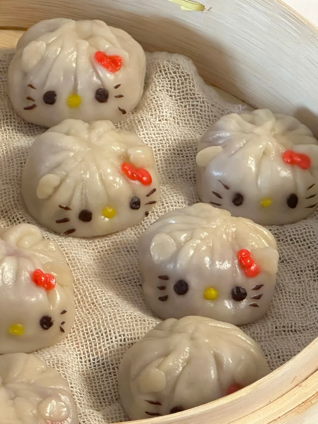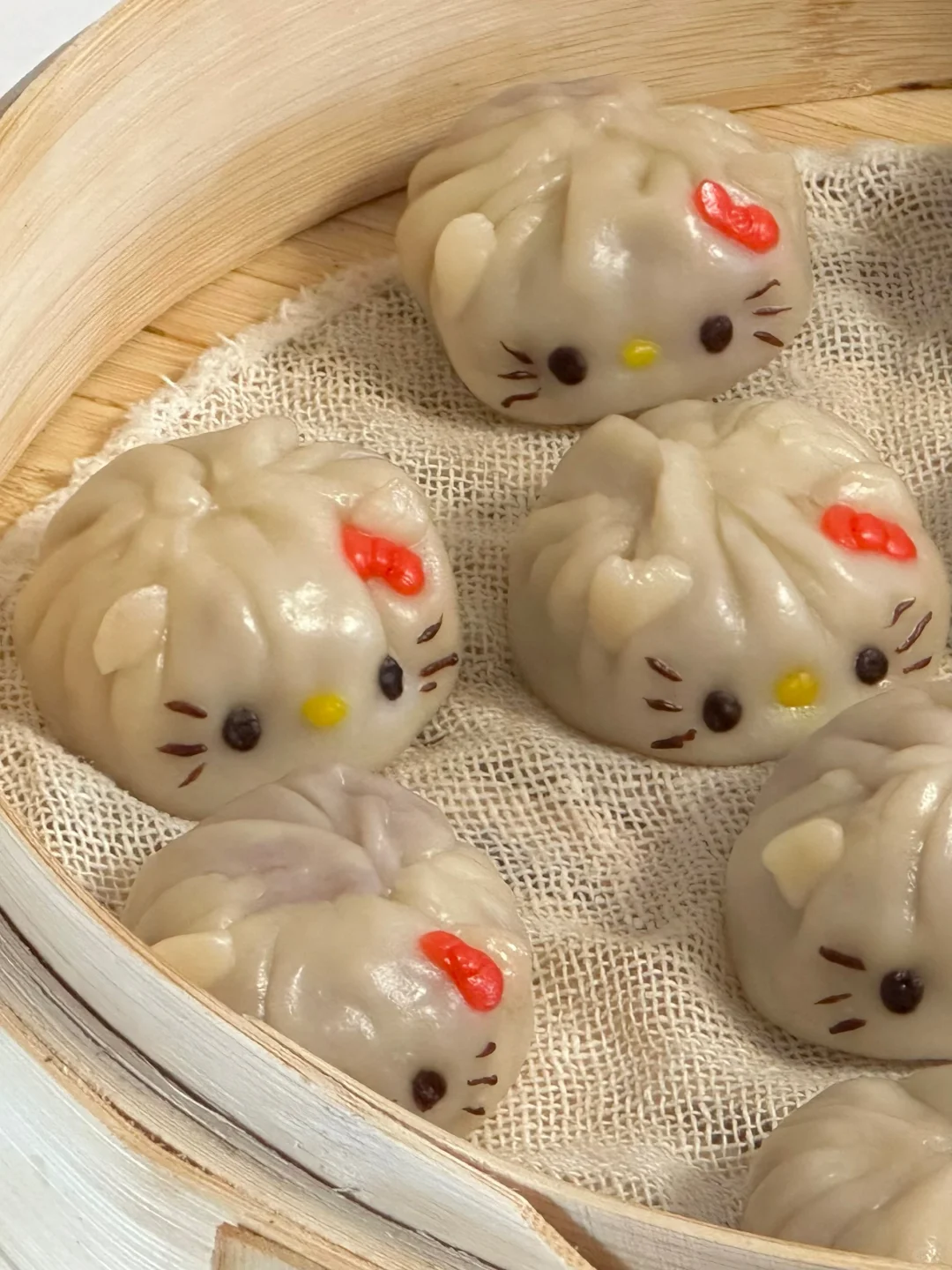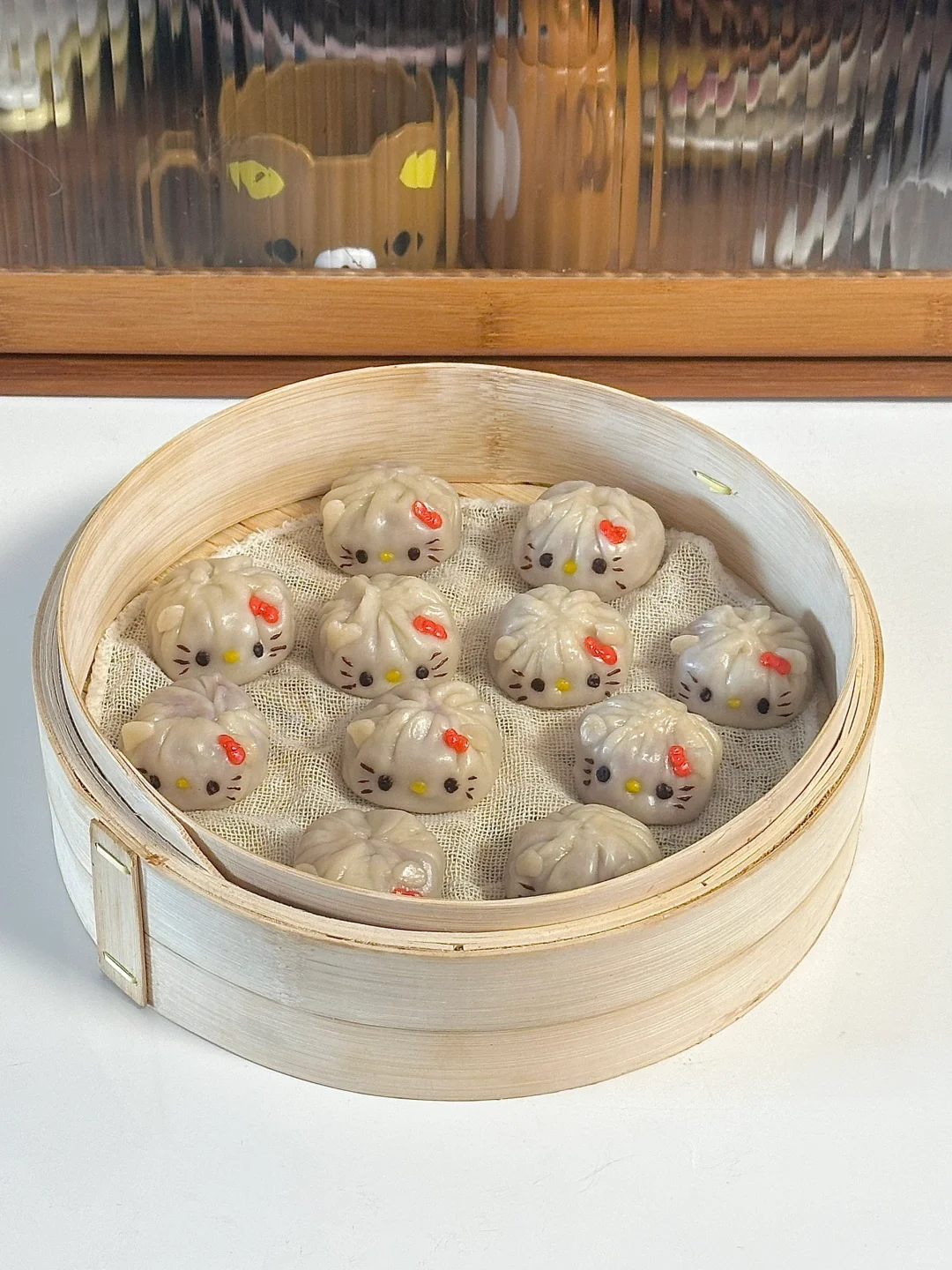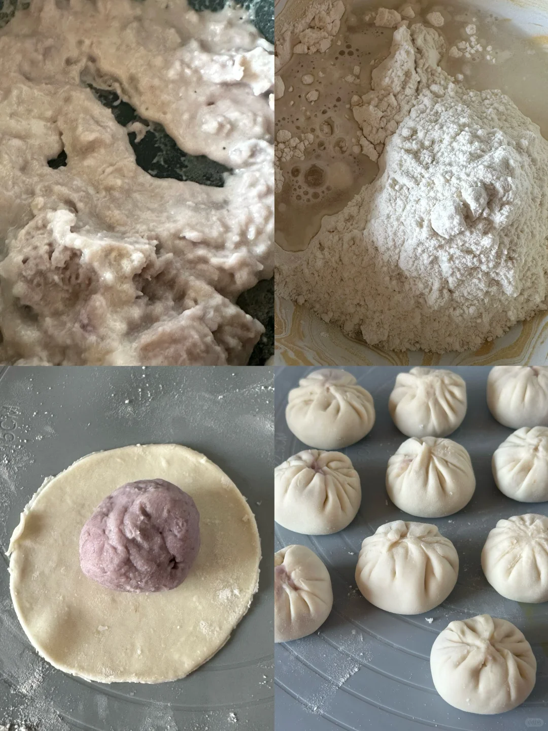 刷到鼎泰丰芋泥小笼很想吃,就自制了一下 配料: 馅料:香芋、奶油、糖、紫薯粉 皮:80g面粉、40g水、一撮盐、调色(红色、黄色、可可粉) 1.芋头蒸熟加入奶油打烂,炒干水分后加入糖调味,关火加入紫薯粉调色冷却备用 2.皮配料混入均匀,揉成光滑面团,分份调色,白色擀成皮,用被子或者小碗压出圆形(大概10g一片皮) 3.皮包入20g馅料,装饰上表情蒸10分钟