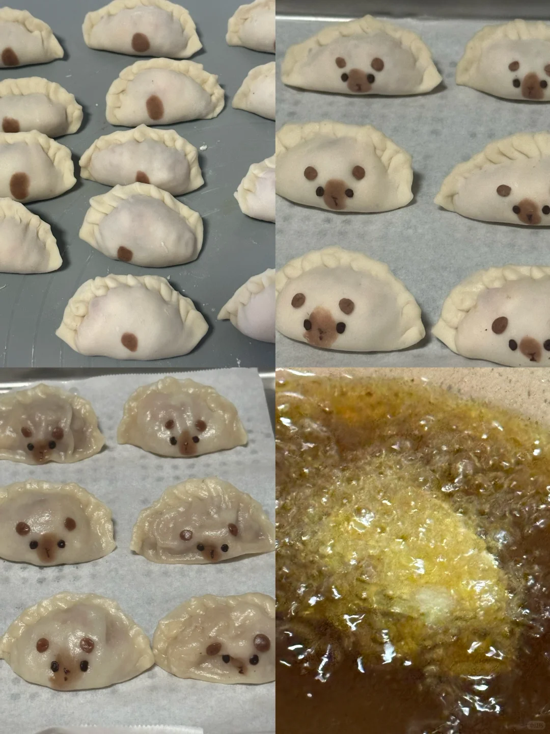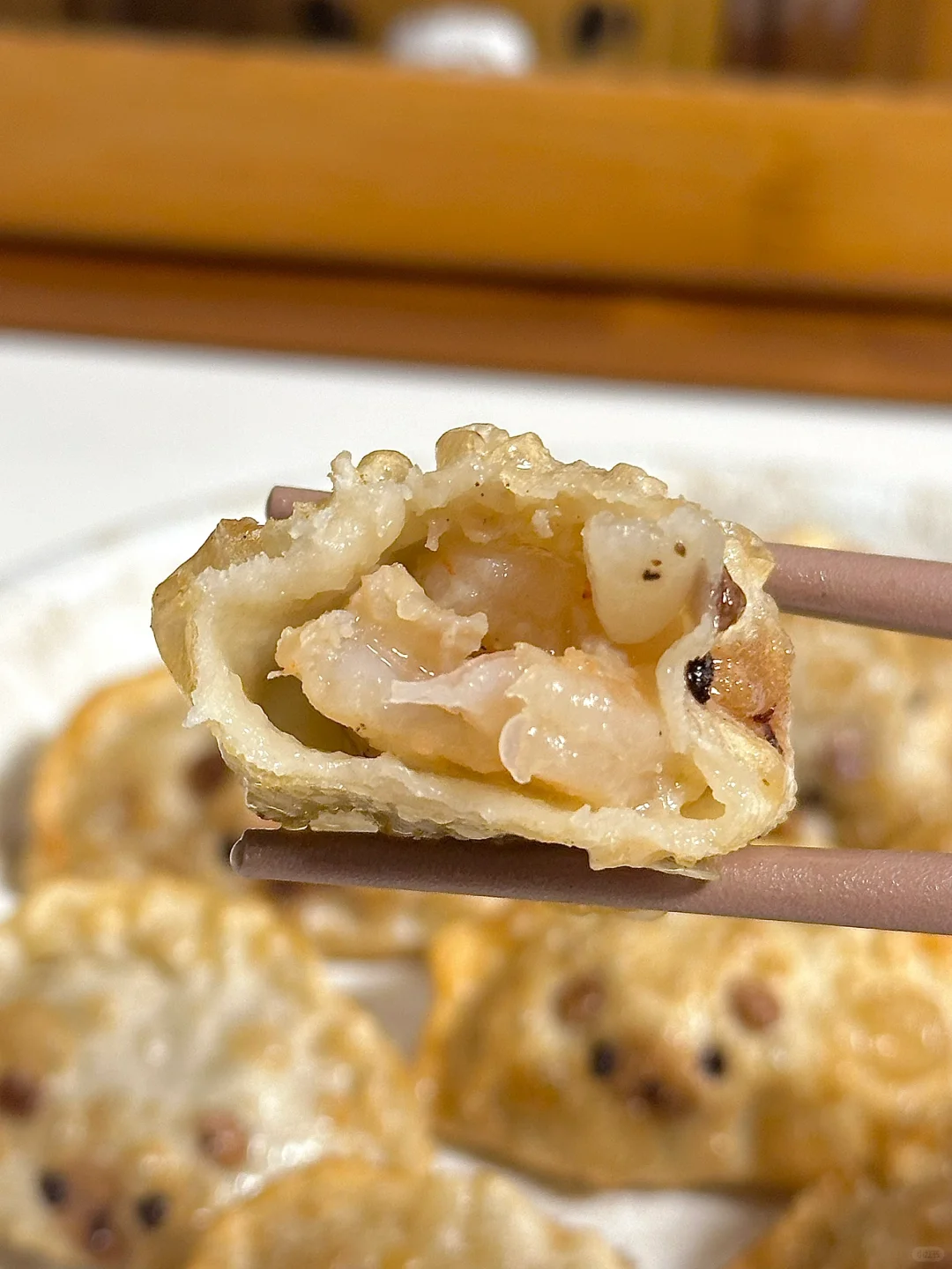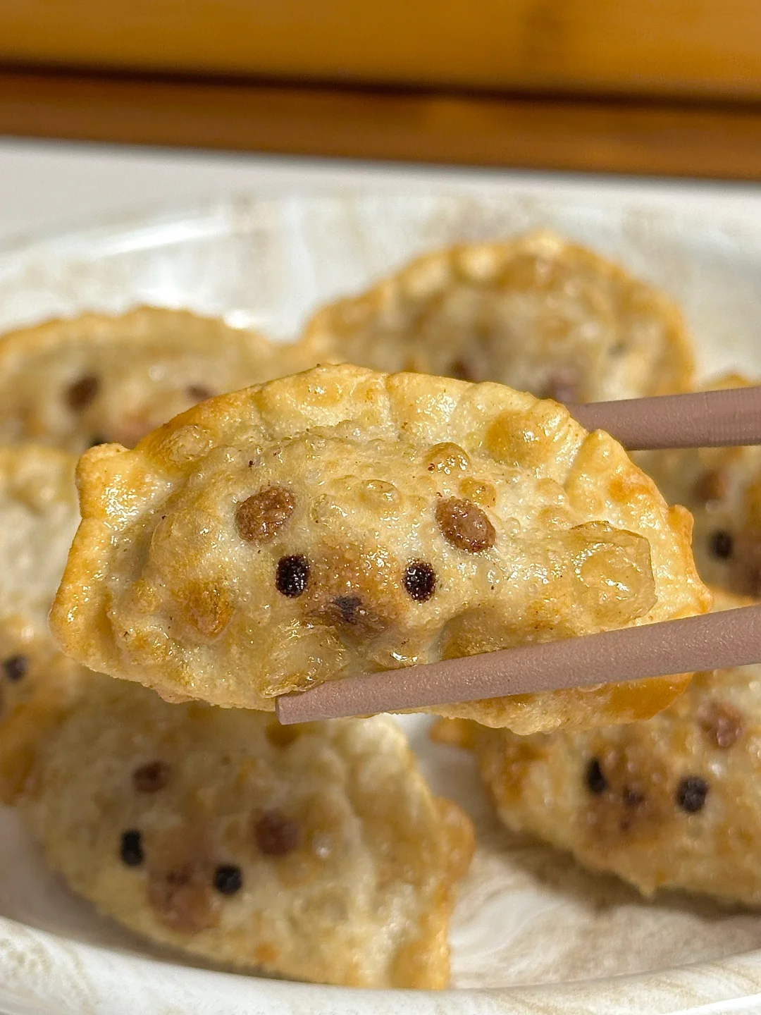 5.蒸好的饺子炸至表面金黄(注意内部汁液漏出导致油飞溅!)