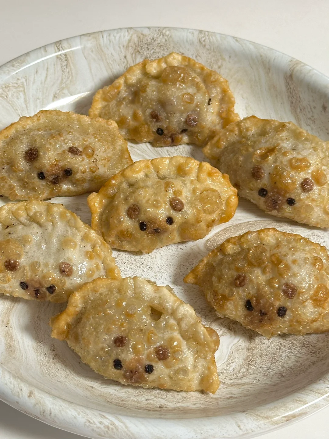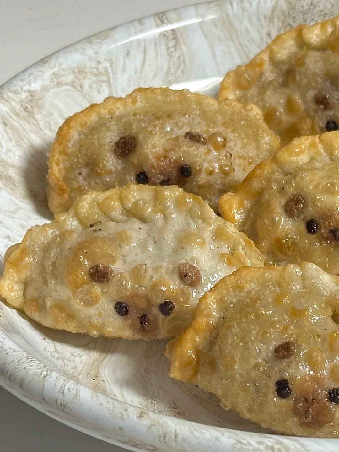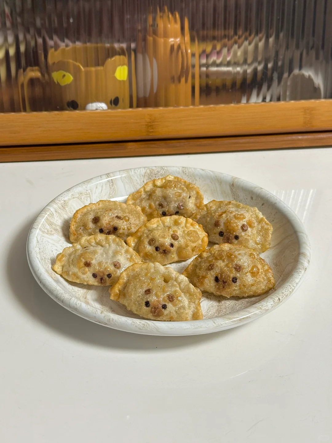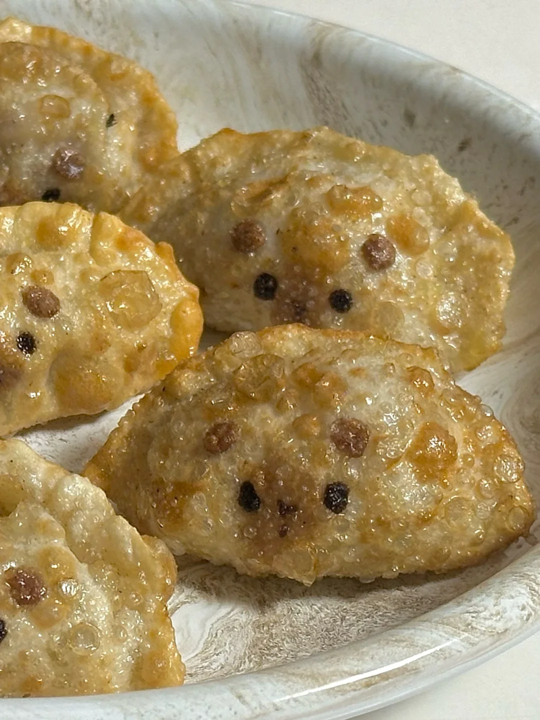 5.蒸好的饺子炸至表面金黄(注意内部汁液漏出导致油飞溅!)