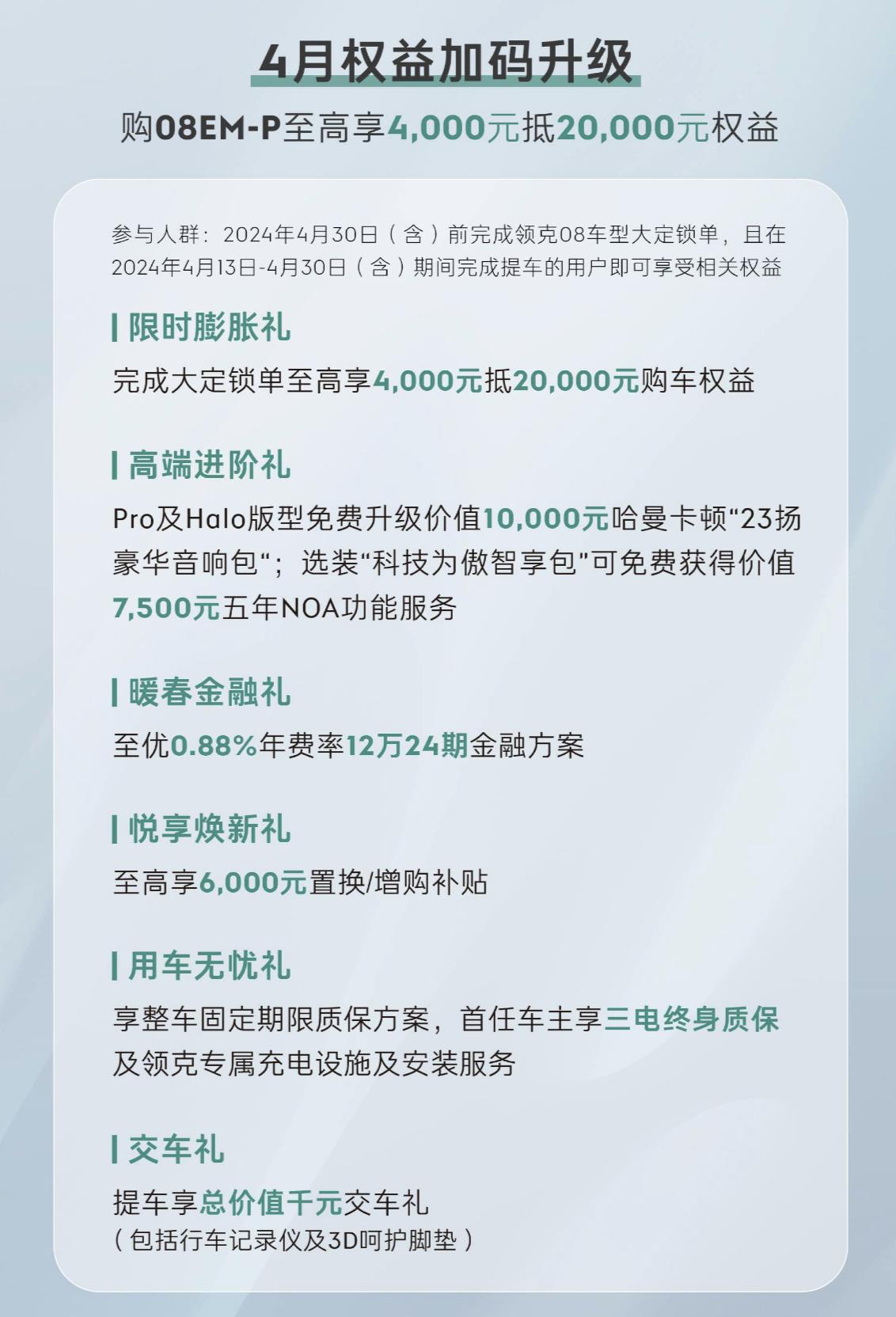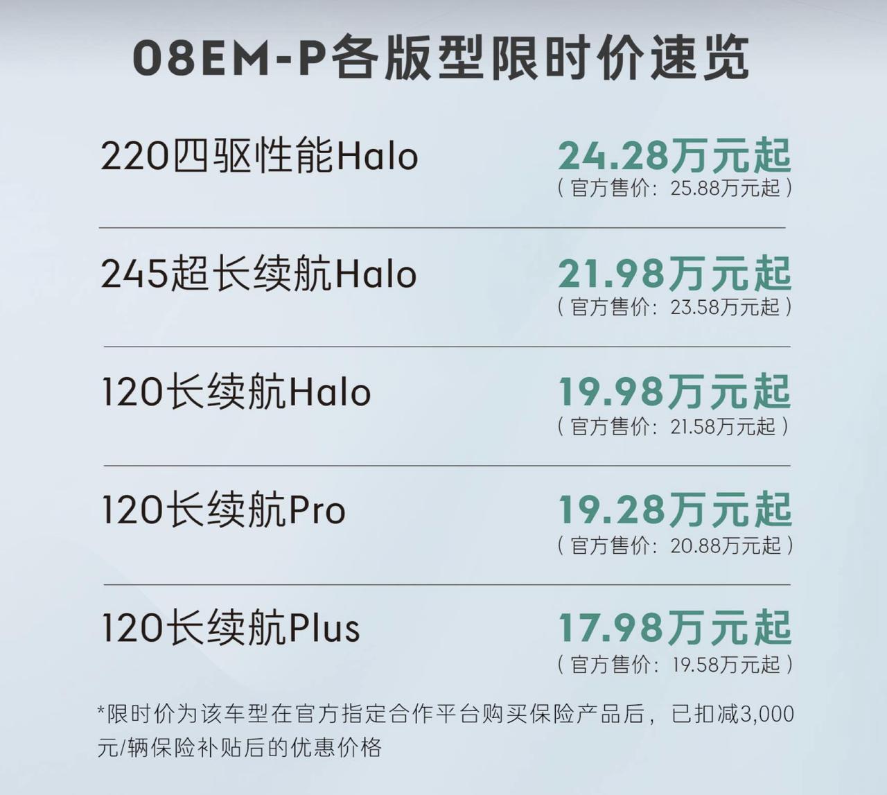 【领克08 EM-P新增入门车型 售价更低】领克推出领克08 EM-P 120长续航Plus车型,官方指导价19.58万元,限时售价17.98万元。作为增配车型,新车将作为领克08 EM-P新的入门版车型,拉低起售门槛。 领克08的长宽高分别为4820/1915/1685mm,轴距为2848mm,全系采用五座布局,支持4/6比例放倒,乘坐空间和装载空间都很宽裕。 动力方面,领克08 EM-P基于全新一代CMA Evo架构打造,搭载EM-P超级插混系统,由1.5T四缸发动机和三电动机(P1+P3+P4)组成的插电式混合动力系统。长续航版车型(1.5T+P1+P3)系统综合功率381马力,系统综合扭矩615牛·米,亏电油耗为5.5L/100km。四驱性能版车型(1.5T+P1+P3+P4)系统综合功率593马力,系统综合扭矩905牛·米,配备电动四驱,官方0-100km/h加速时间为4.6秒,亏电油耗6L/100km。【来自懂车帝车友圈】