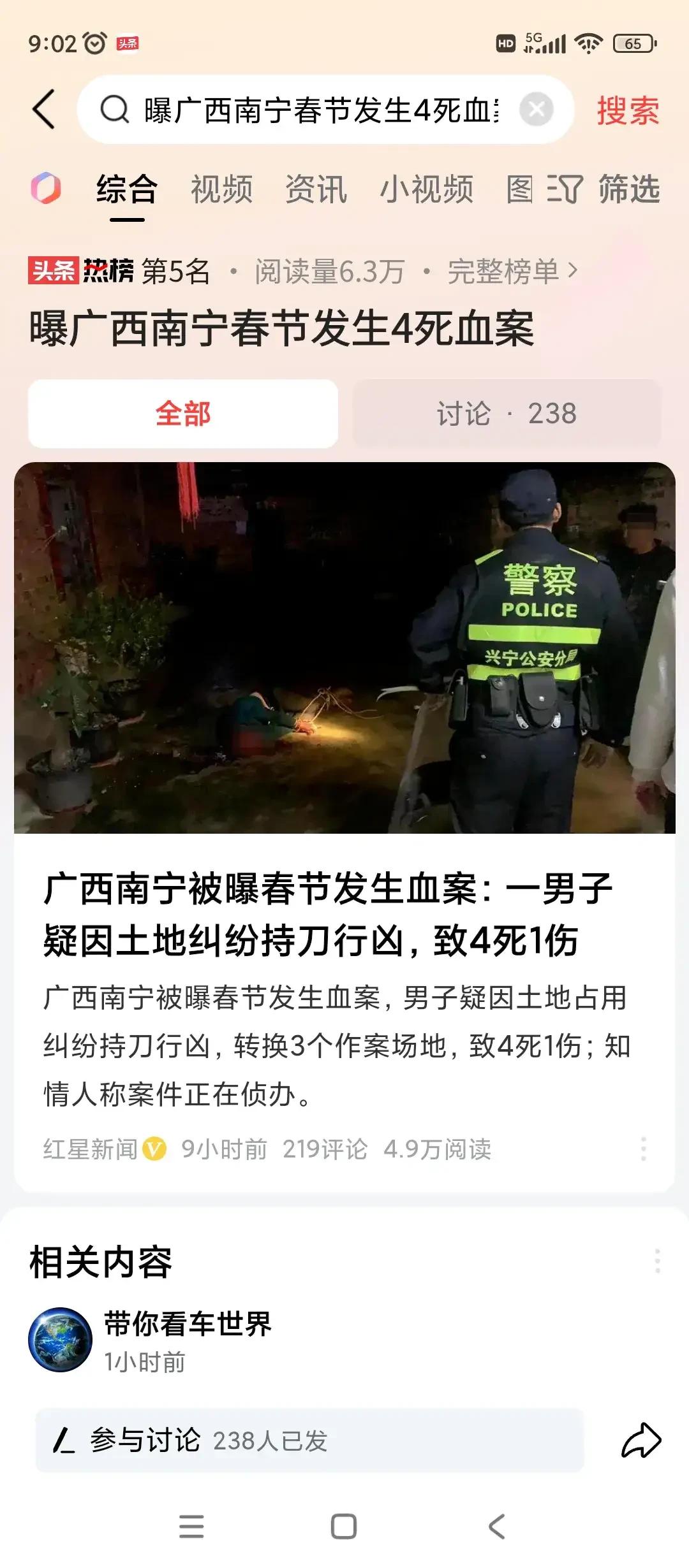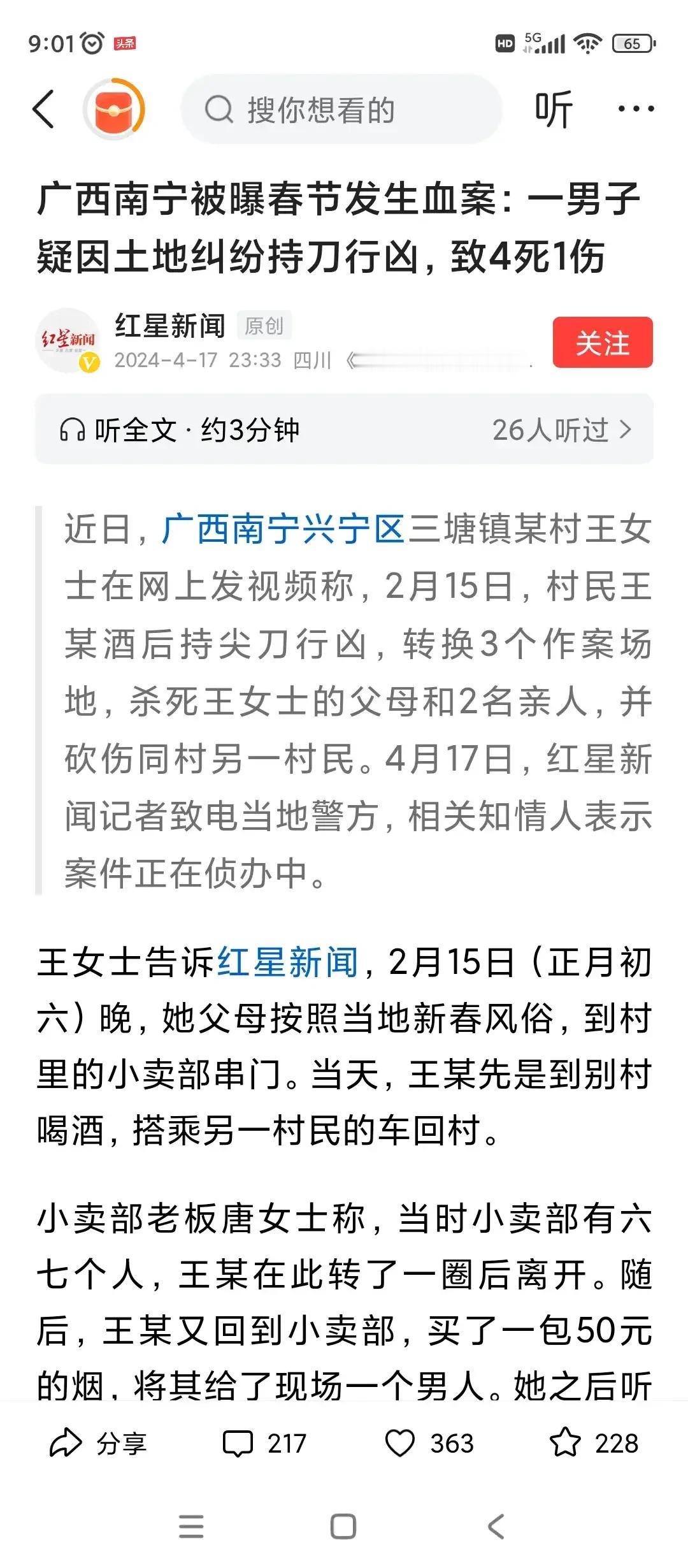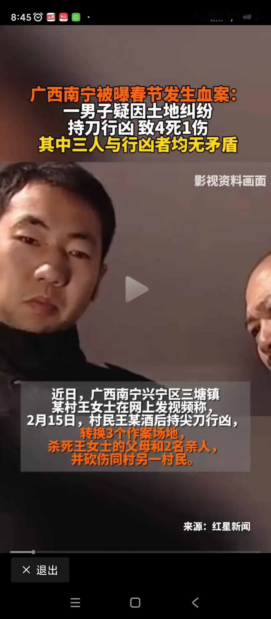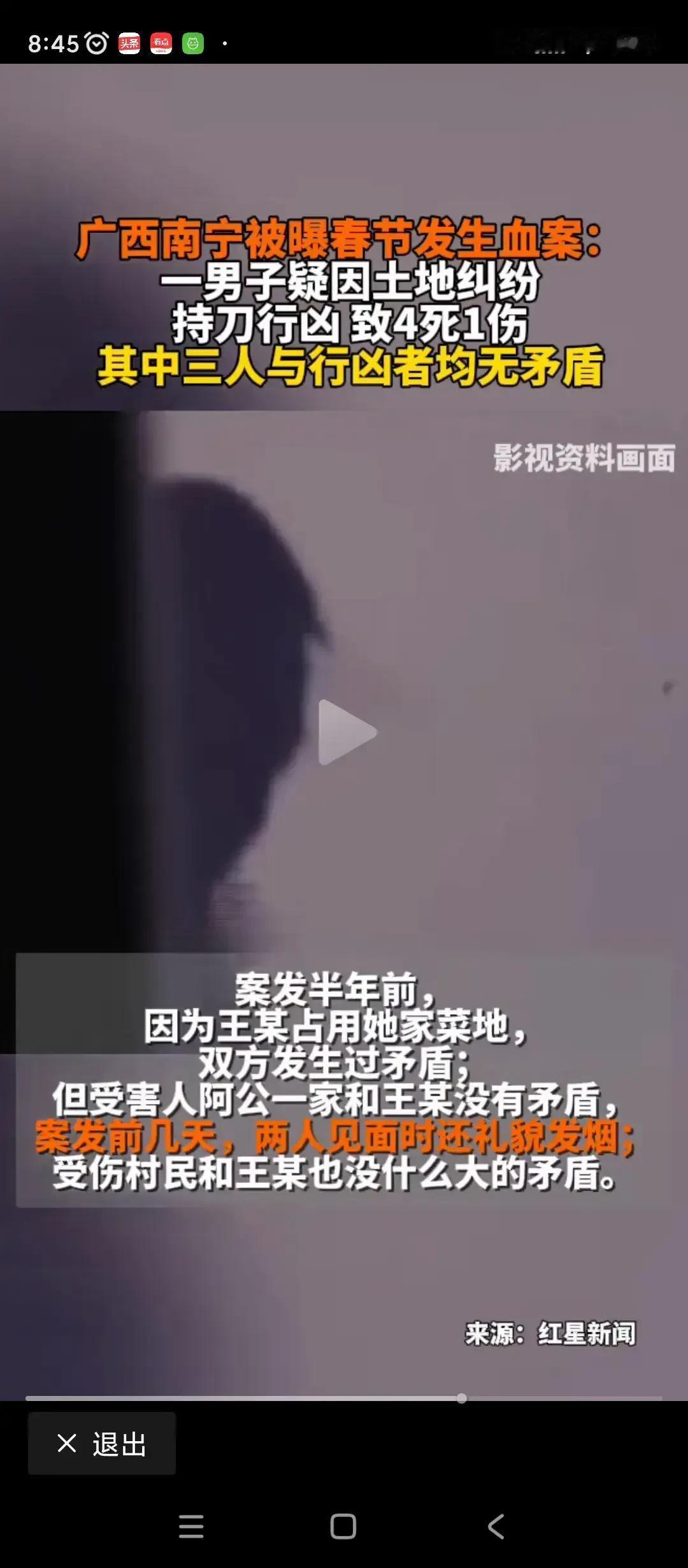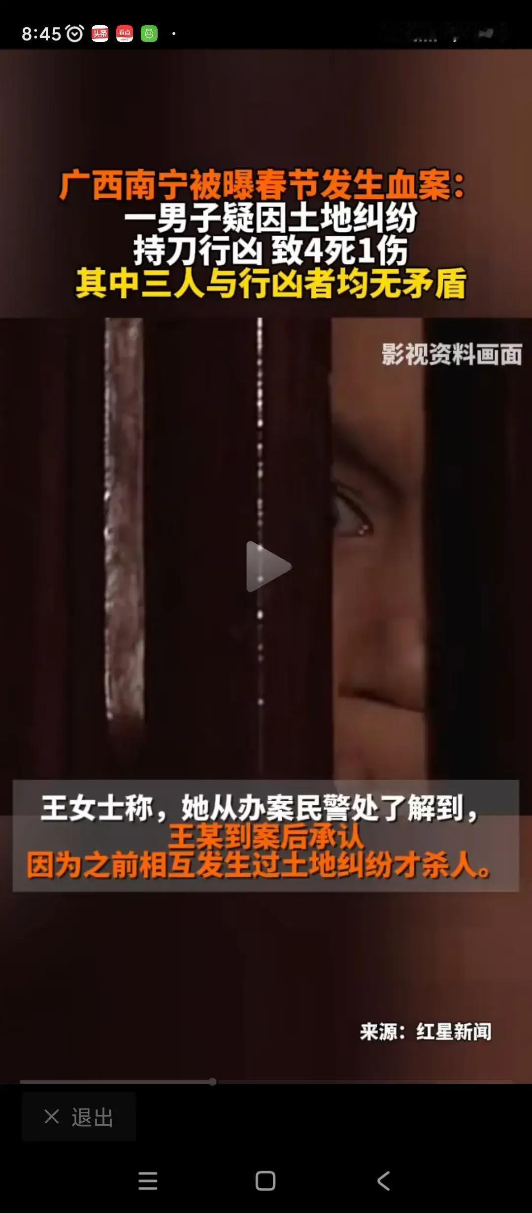 广西南宁在春节大过年大年初六那一天发生了一起严重的血案,4死1伤,据死者的亲人王女士说:死者中2名是她的父母,还有两名是她爷爷的弟媳妇还有儿子,死的都是她的亲人。。 伤的一个是邻居。据新闻报道,凶手是男子,疑似因土地纠纷而行凶,导致4人死亡,1人重伤。 这起恶心杀人事件引起了社会的广泛关注和强烈谴责。 只能说,这个凶手太狠毒了。 其实原因很简单,就是半年前这王某占用王女士家的菜地,双方发生过矛盾。 但是,这凶手王某和王女士的小爷爷家没有矛盾,两人见面都相互礼貌的发烟抽。 受伤的村民和这个王某也没有矛盾。 现在,这王某已经被抓捕归案。等待他的将是法律的严惩。 农村因为土地,宅基地,菜地,这样的纠纷很多。 因为纠纷闹矛盾的很多。 因为土地纠纷发生命案的也不少。 我们我们都重新温习一下“三尺巷"这个故事。 千里修书只为墙,让他三尺又何妨,万里长城今犹在,不见当年秦始皇。 做人要豁达大度 ,宽容忍让,不要斤斤计较。 所有的得失在生命面前斗不值得一提。 忍一时风平浪静,海阔天空,让一分天下光明。 让人让自己。 格局打开,格局大了,世界就会因你而宽广。