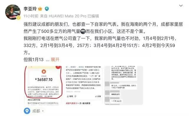 天下奇闻!现在的燃气都提速了吗?人不在家,燃气就偷偷摸摸的自己燃烧?还是偷偷摸摸的自己跑了?这个情况令人害怕呀!4月17日,知名编剧李亚玲发文称,自己在海南2个月,成都家中产生了500多立方用气量,准备联合有相同遭遇的邻居找第三方检测机构检测燃气表。 这真的是人在海南住,成都家中的燃气突突突的烧。 到底谁在她家使用她家的燃气,而且用的如此之多,令人咋舌。 不单单是她一家说个案。 她们邻居家也是相同的药方,相同的待遇。 唯一的相同就是,他们家都曾经更换过燃气表。 难道说燃气表看着主人不在家“偷偷跑得快”。 近日,成都市保利心语二期有业主反映,自从更换燃气表后,20天欠费高达17290元,该小区多名业主表示,更换燃气表后出现燃气费暴涨的问题。 看看,这不是光李亚玲家的表跑得快。 很多人家的燃气表有些冲动,冲动到了万元。 有网友提出质疑,到底是新换的燃气表转的太快,还是收费有问题? 有人怀疑,燃气“周扒皮”。 这20天欠费17290元燃气费,确实值得每一个深思。 网友说;瑞士表算个啥?我大中华表独占鳌头。