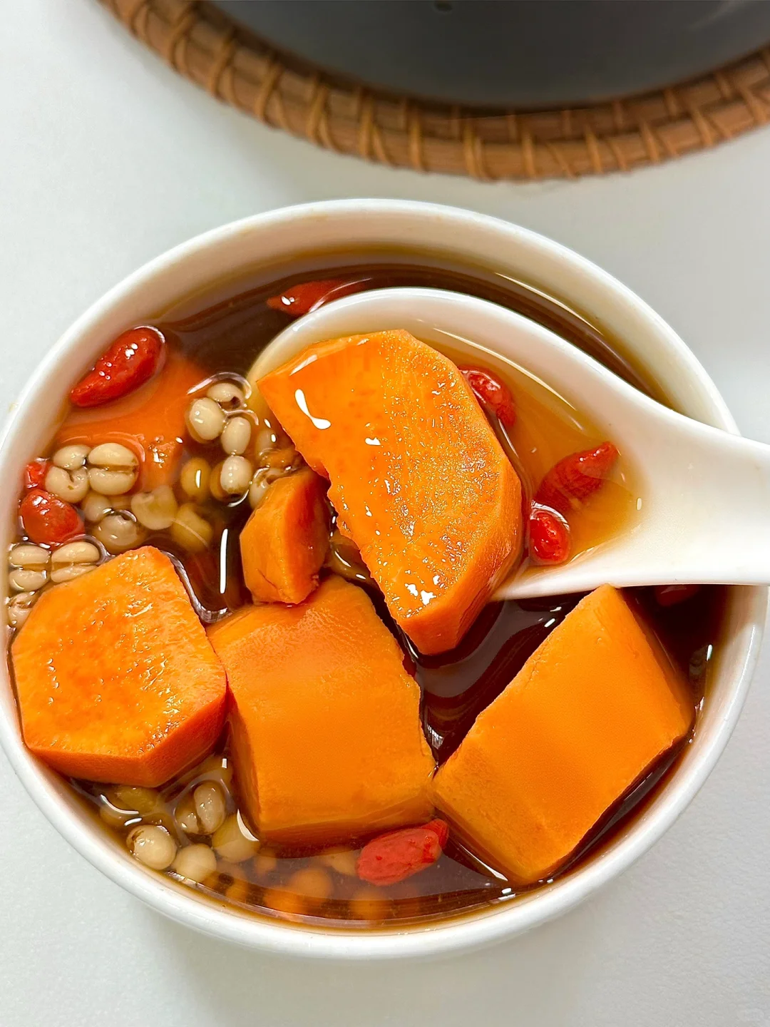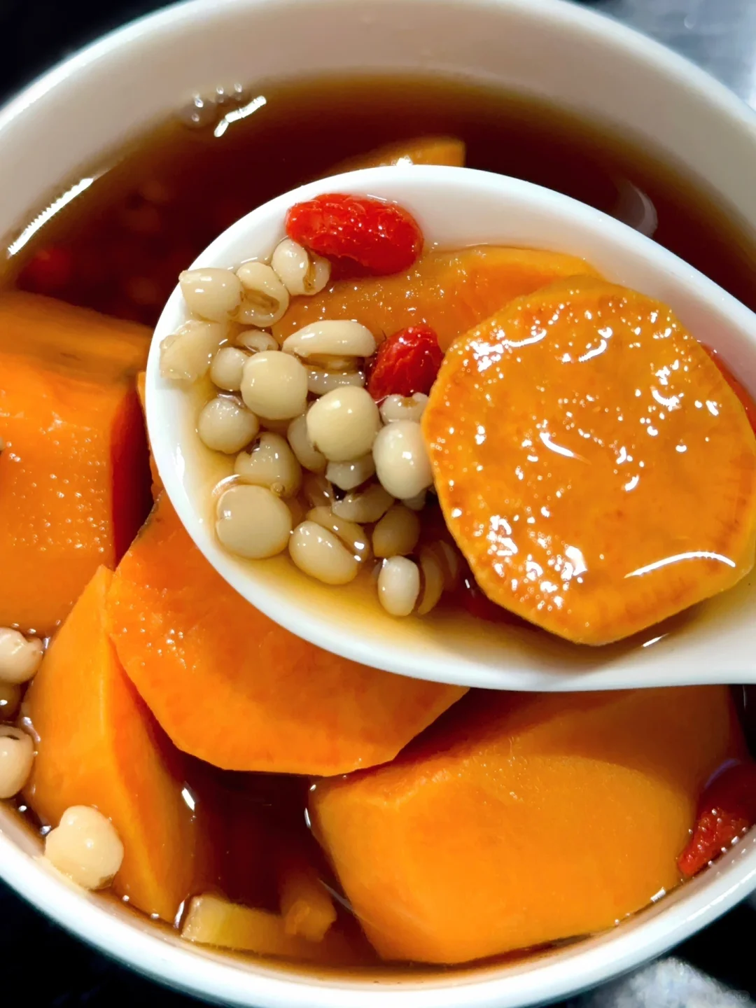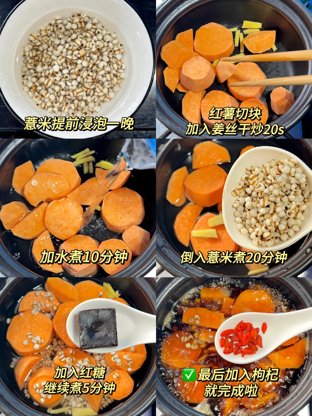 做法:红薯去皮切块,,锅中放姜炒10秒,再放红薯炒20秒,加入红糖和薏米煮20分钟,完成撒上枸杞,焖一会就好啦✨
