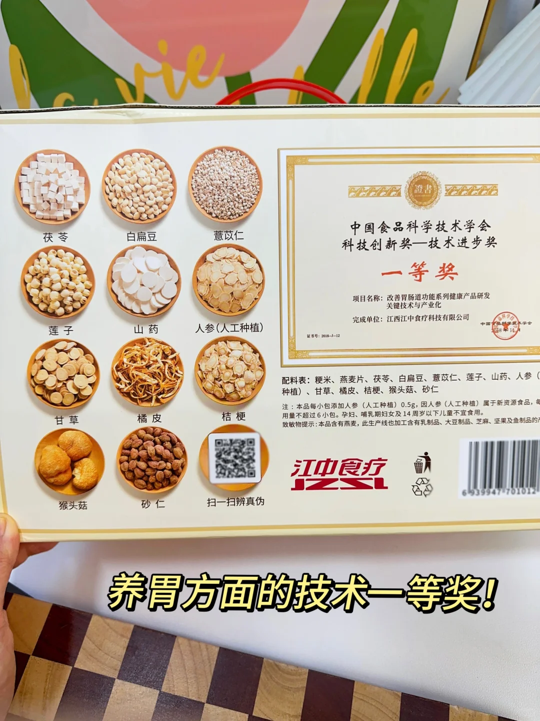 配方来自宋代健脾养胃古方《参苓白术散》,有人参、山药、薏苡仁、砂仁等十种药食同源的食材,特别是薏苡仁,懂得都懂,对湿气重而且容易浮肿的姐妹很友好!开水冲泡一分钟就搞定啦,口感温润细腻,香香甜甜甜的,带着淡淡的草本香😋一碗下肚胃里舒服了不少!江中是国民老品牌了,专注养胃,值得信赖!