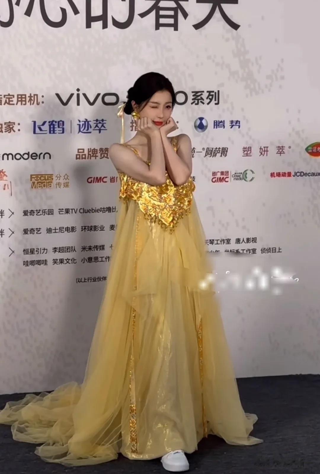 别出心裁的选用了小白鞋配明黄色吊带裙,花苞盘发用黄色发带固定,直接让人梦回《永夜星河》中的凌妙妙了