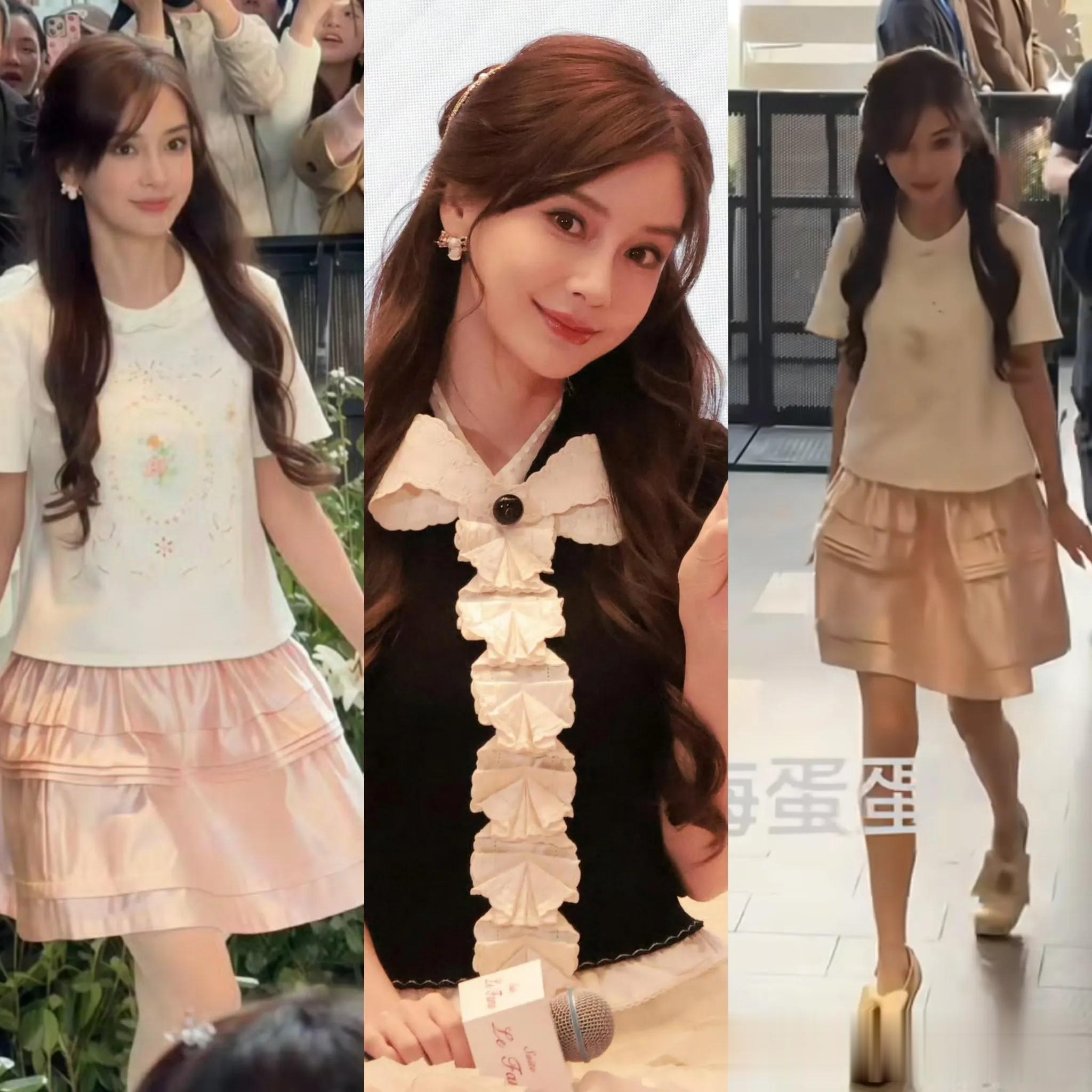 一身是白色T恤配粉色短裙,搭配公主鞋,完全精致芭比娃娃啊