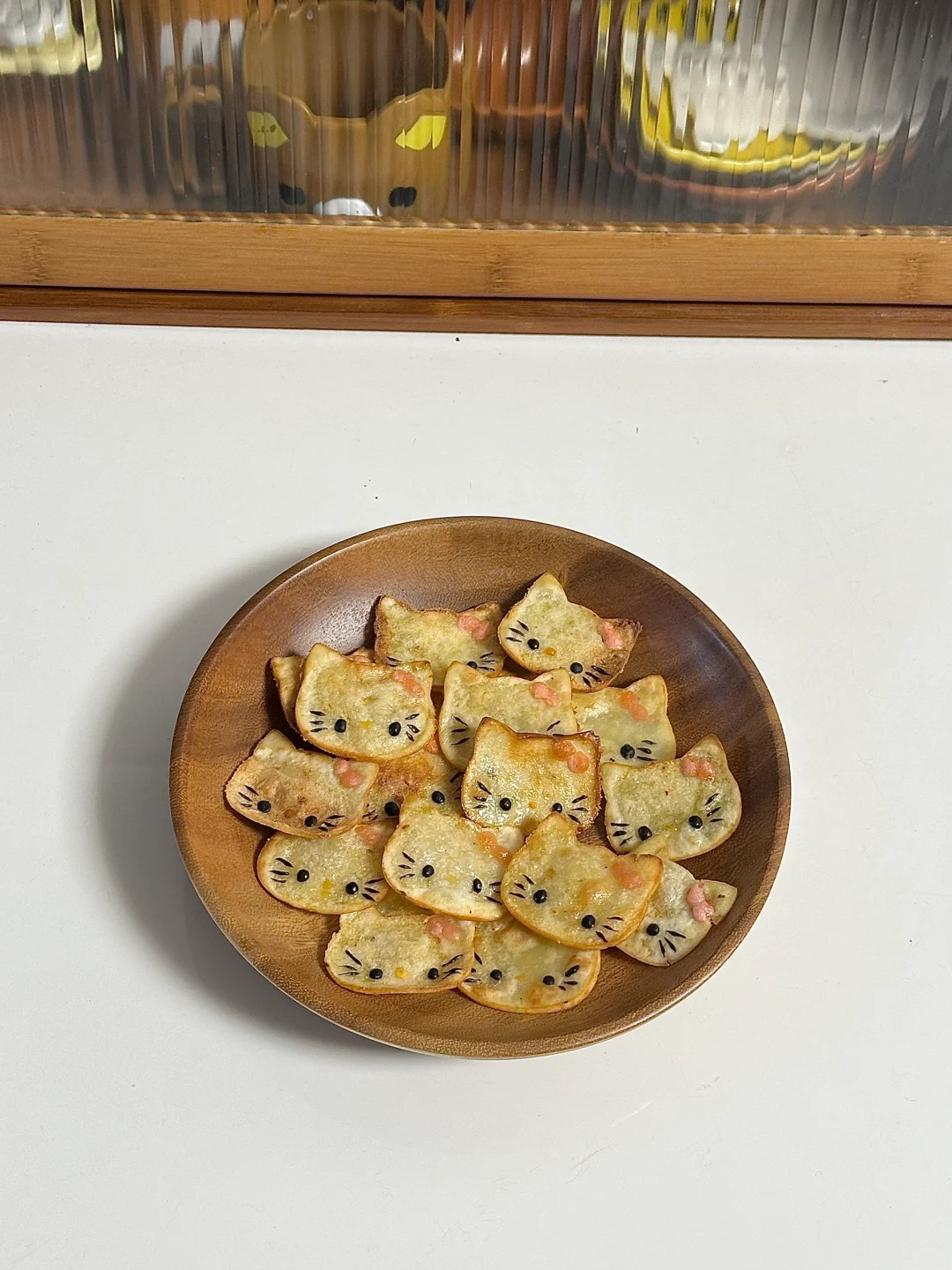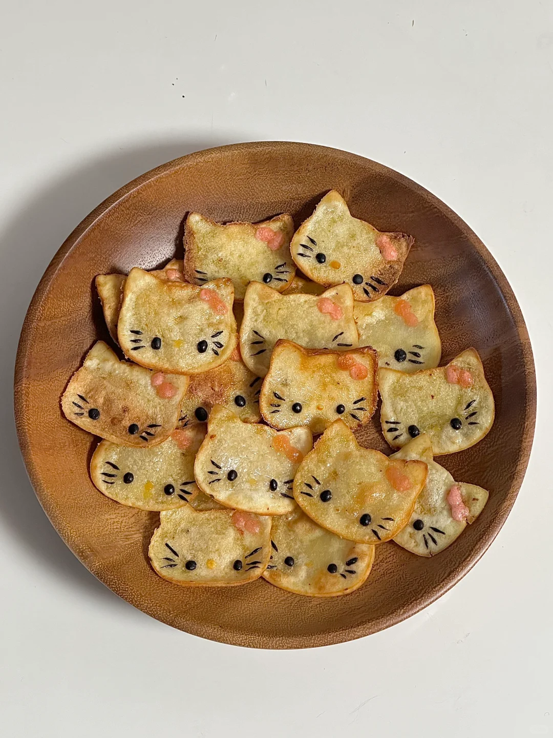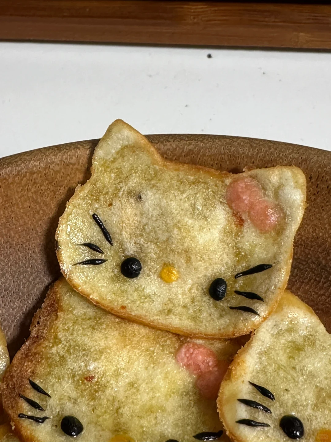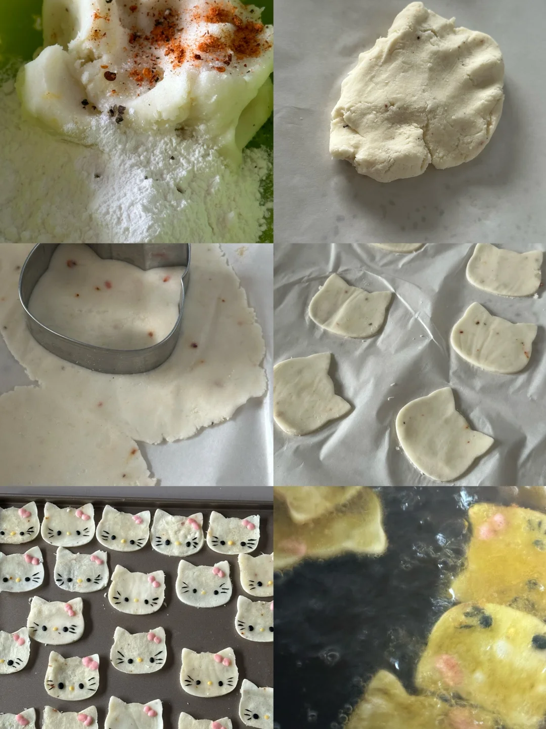2.面团擀扁,用模具压出猫咪头,贴上表情,微波炉打1到2分钟,kitty变得略微干硬