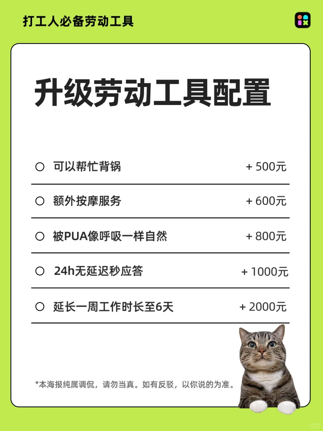 这款金牌劳工可以帮各位打工人提供食品质检、背锅等多种服务!如您工作不顺心,还可以选择另一款KPI粉碎机,包您满意哦[喝奶茶R]~