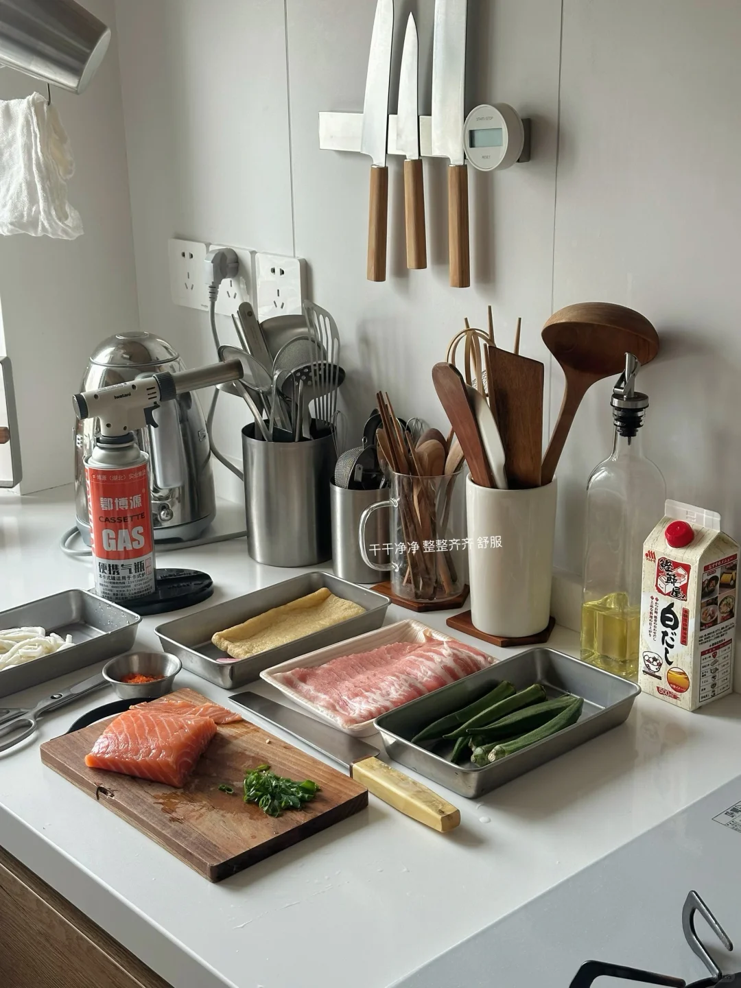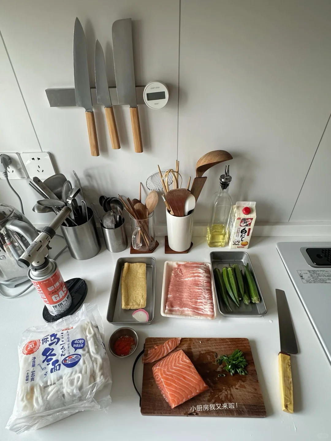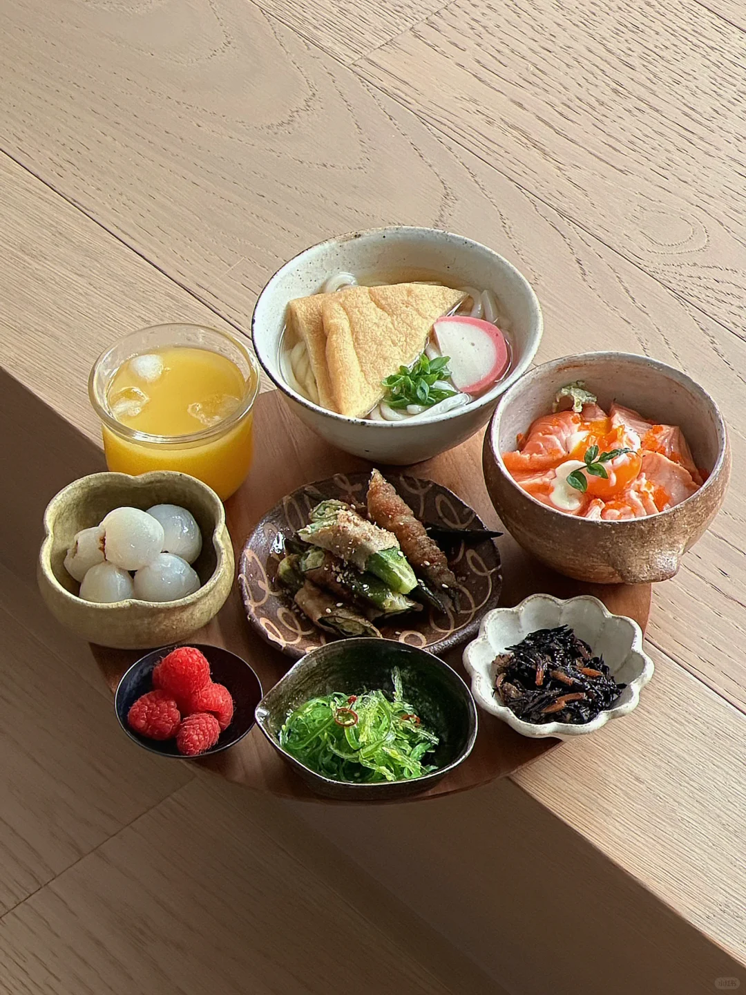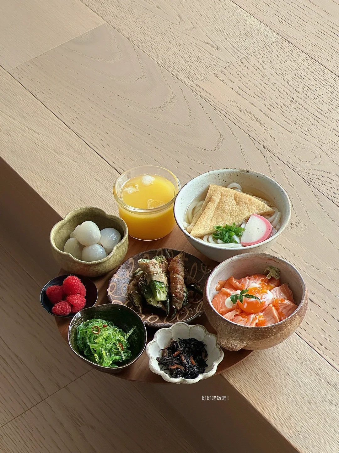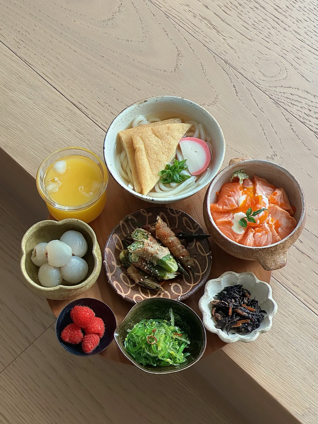 今日小托盘 出汁乌冬面🍜 炙烤三文鱼盖饭🍣 五花肉卷秋葵🌯 酸辣海藻丝🍃 五目洋栖菜煮🥕 树莓 荔枝 橙汁🍊 - 五目洋栖菜煮 在很多日剧里出现的小腌菜 洋栖菜是一种类似梅干菜的食材 泡发之后 和猪肉胡萝卜鸡肉香菇芹菜(五目)炖煮 口感脆 有点像梅干菜味儿的木耳碎 好吃! - 如果一定要找到让自己下厨开心的技巧 就是阶段性奖励自己一些喜欢的厨房工具 毕竟 钱要花在刀刃上哈哈哈哈哈哈 而美好的器物总是以宁静平和予我温暖的陪伴 人生厨房 也是对话器物之心的理想国度🥰