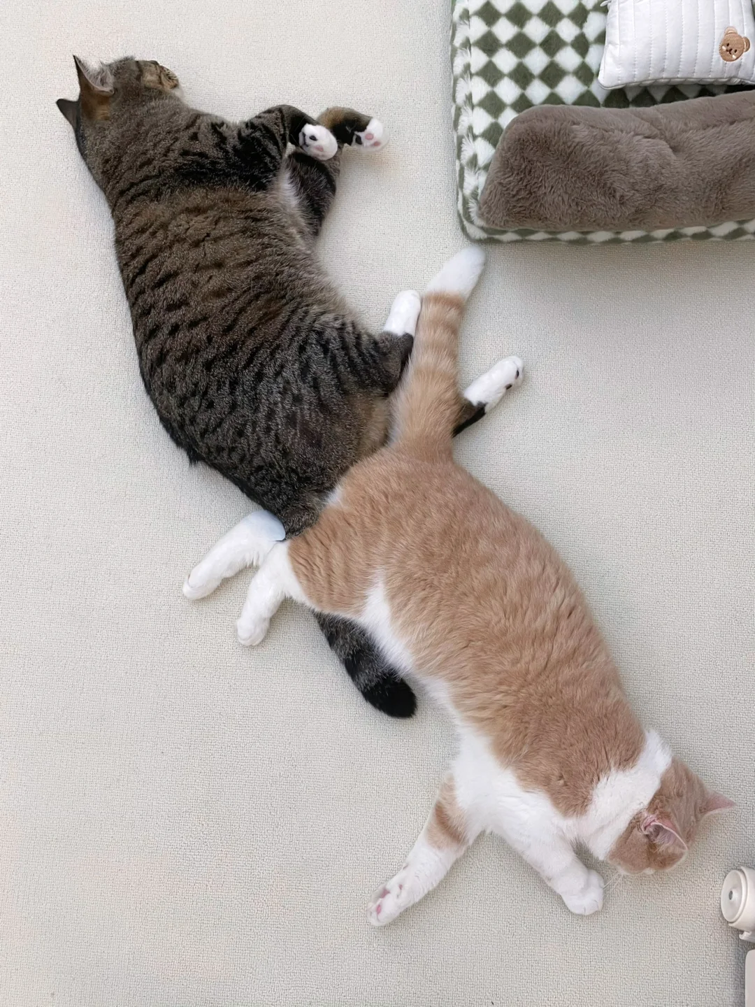 不懂小猫咪的世界,刚打完架呢,躺下又开始这个姿势贴贴了!