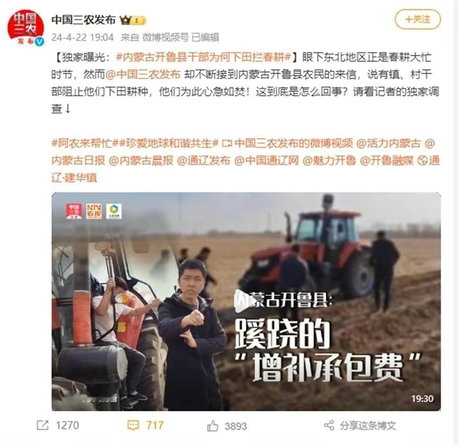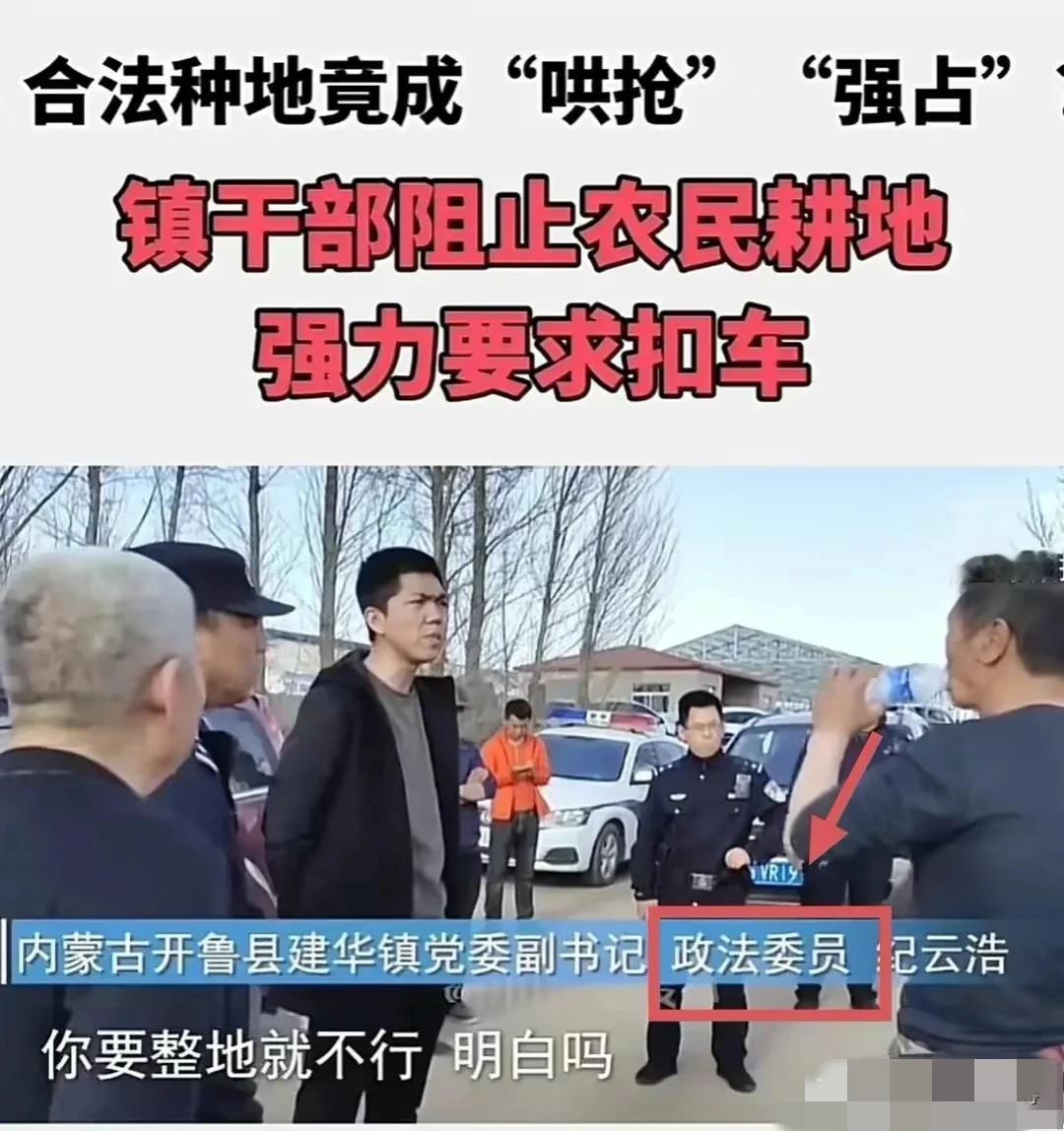 这农民种地咋这么难啊?种地不但苦和累,有时候还会颗粒无收,但更多的时候,是承包费的问题,这承包费可不是小数目。 近日,内蒙古通辽村民承包的集体的盐碱地5000亩,20年的合同,巨额的投资,辛辛苦苦把一片盐碱地改造成种粮良田。 可是,现在村镇领导要求,每一亩💵必须要增加租地费,每一亩是200元。 叫什么“增补承包费”。 这一亩地增加200元,这5000亩可不是小数目。 农民不交增补承包费,这建华镇还有镇干部,就阻止农民耕地,并且强烈要求扣车。 视频中,该镇党委副书记,政法委员纪云浩在视频中说:别找我,我不懂法。 而开鲁县建华镇双胜村村委会一名副主任,阻拦种植户春耕时说:110来了又能咋样?上边让我敛钱我就敛钱,我听上级的。 这一年之计在于春,春天是播种的季节,而谷雨前后种瓜种豆,这个道理大家都知道。 但是,这些干部们却百般阻挠农民种地。 这5000亩盐碱地,如果每亩再交200元,那就是100万呀! 这可不是个小数目。 农户花了20年的时间,几乎把自己全身家当都投入到盐碱地改造,现在又在补交上百万元的承包费。 这不是狮子大开口吗? 问题是,他这5000亩地还没有到期,当时合同是三十年,合同还有10年的期限。 就因为近100万元的承包费,这农户实在拿不出来,所以农户就没有交。 但是春耕春种不能耽搁,于是呢,农户就想先把地给种了。 没想到啊,却遭到了村委还有镇委这些干部带人强行阻止。 他们24小时在地偷轮班看守着。 有的人呢,甚至都在种地的机器的旁边进行阻止。 没办法 ,农户只能报警。 万没有想到,这警察来了,居然把报警的人给强行带走了,直接把这些人往车里摁,按。 镇上的干部说,农户不交这每亩200元钱,如果继续耕种,他们就属于哄抢集体土地,属于闹事者。 更令人想不到的是,当记者找到了村干部和镇委副书记时,他们两人都表示自己不懂法。 这个事情一曝光,引起了很多网友的讨论。 有一网友说的好啊,真的是荒前无人耕,耕好有人争啊,这种植户真的太不容易。 网友质疑,这些不懂法的村镇干部是怎样当上领导的,他们这些连法都不懂的人,能为村民们谋福利奔小康吗? 事情发生了,调查组已经介入调查。 希望调查组能够给只能农户主持公道。 年之计在于春,,农民不能再等了,也等不起,农时等不起。 春种一粒粟,秋收万颗子,先把地种上,才是重中之重。