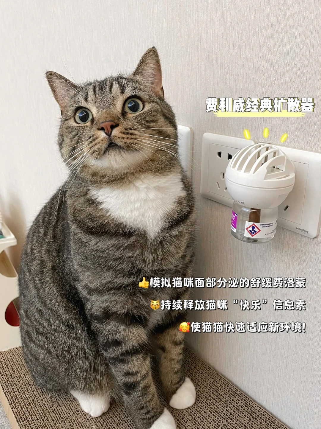 费利威的经典系列主要是通过模拟猫咪面部分泌的舒缓费洛蒙,释放快乐信号,猫咪闻到后会感到“安全、愉悦”,从而在陌生环境下的焦虑情绪得到缓解,也避免了因猫咪应激而引起的乱尿、乱抓挠等不当行为[赞R]