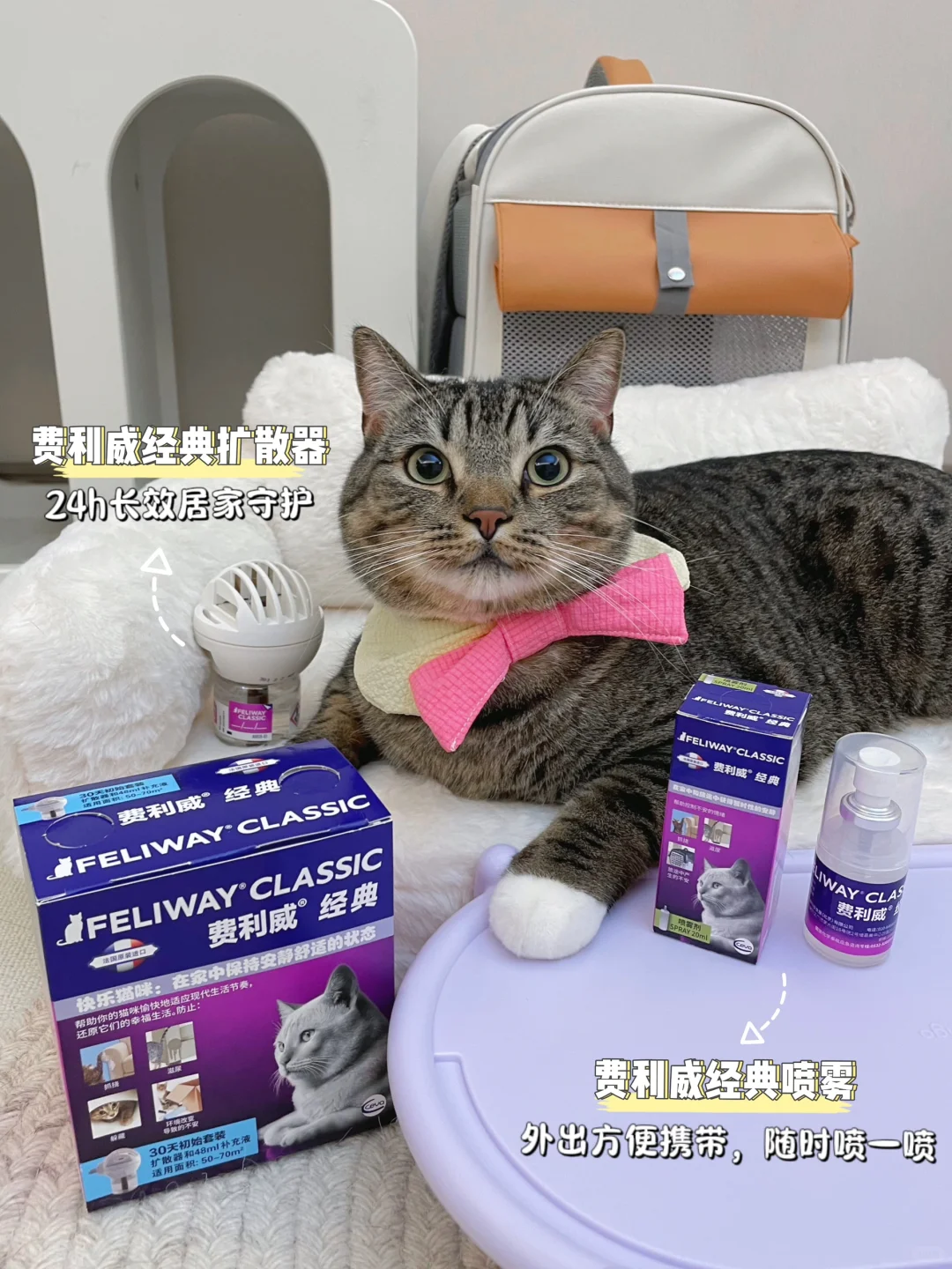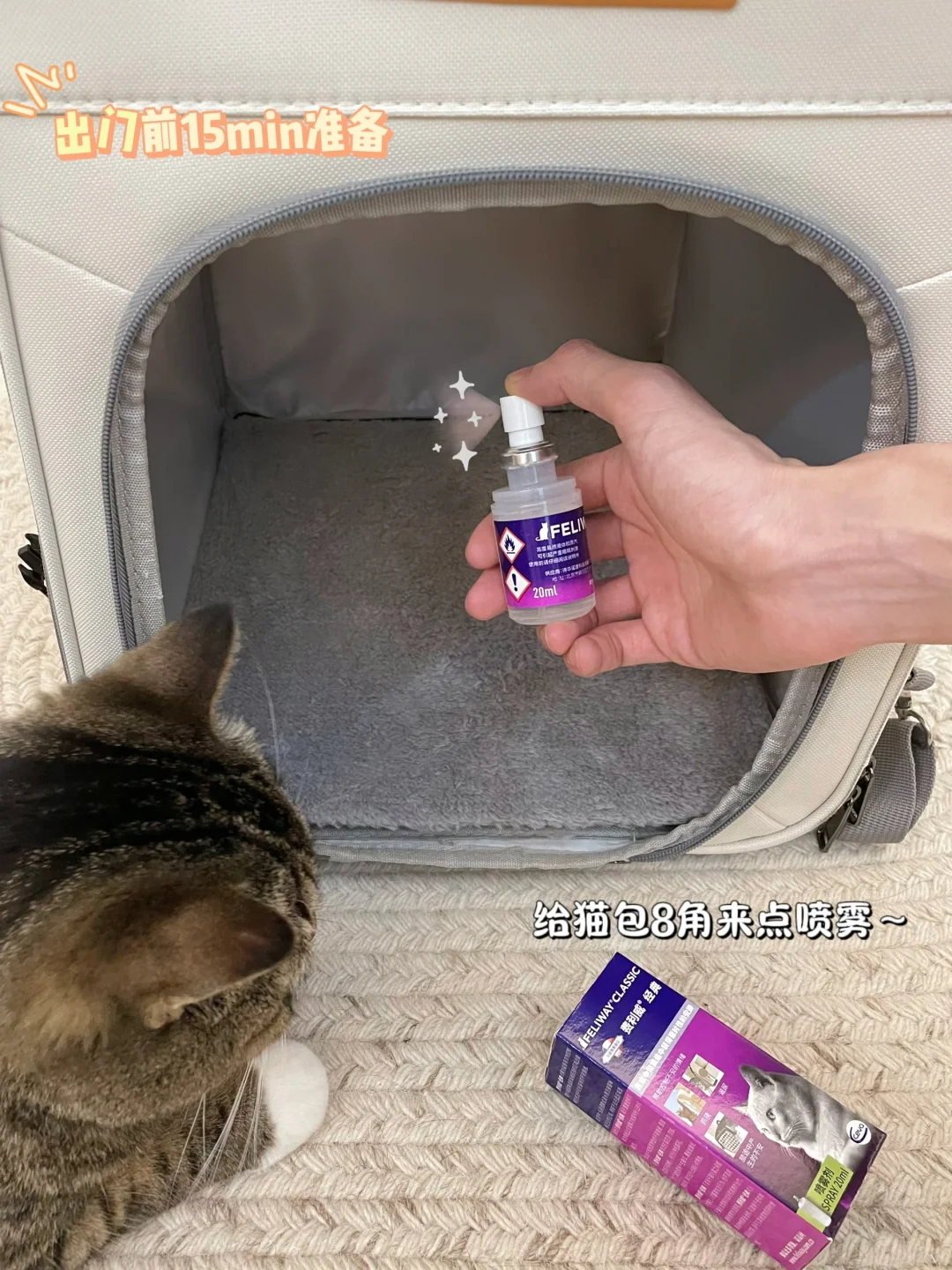 这回带饼饼出门特意提前在家里插上了费利威经典扩散器,猫包的8个角也在出门前15min喷上了费利威经典喷雾~