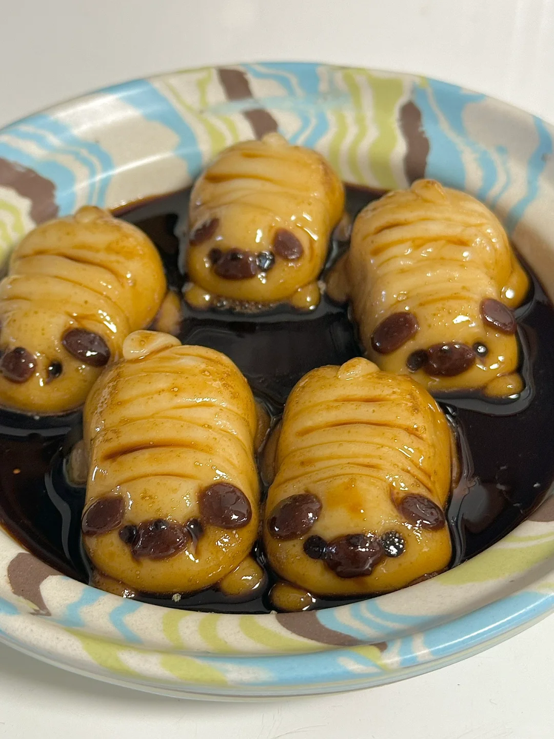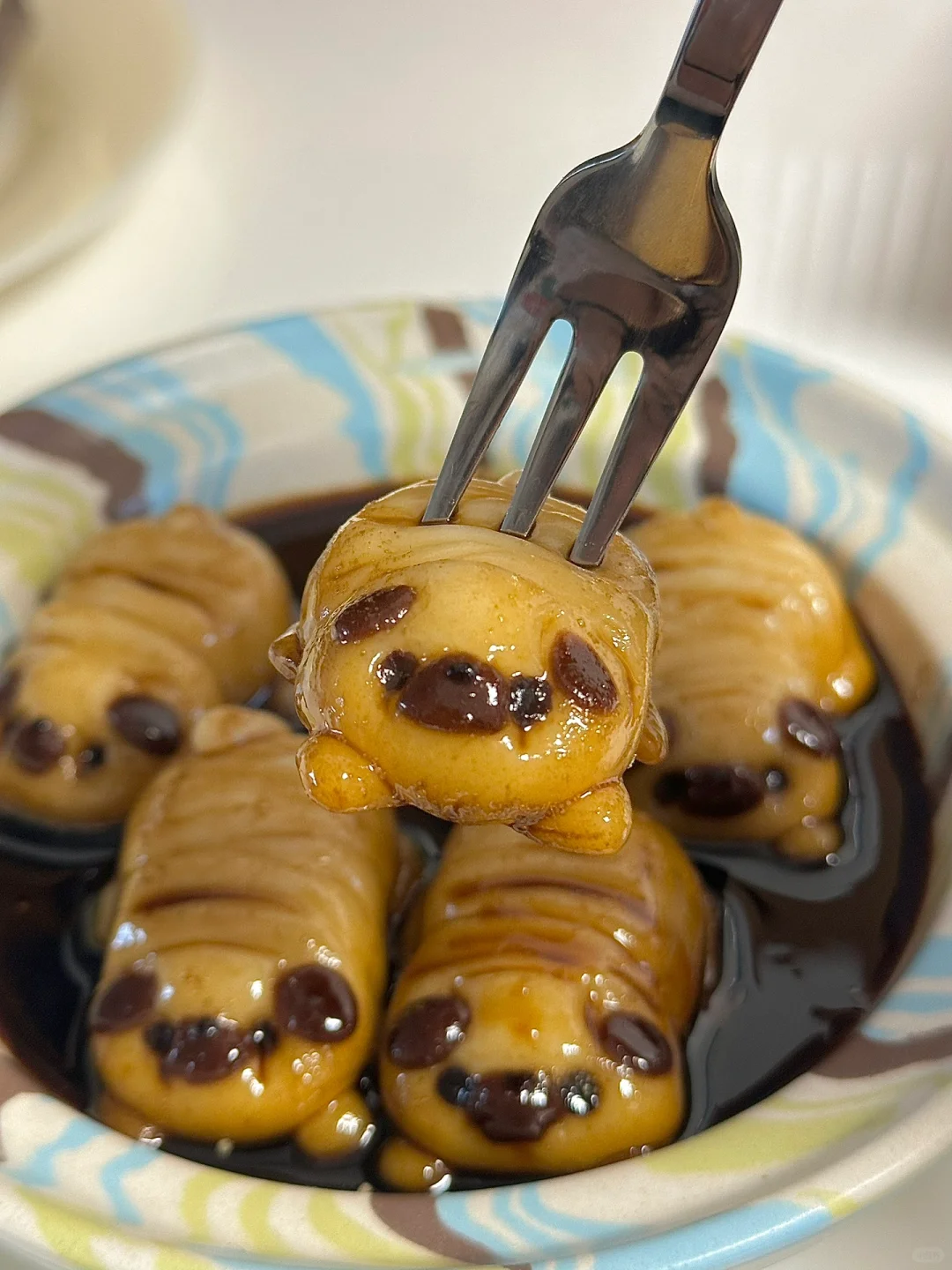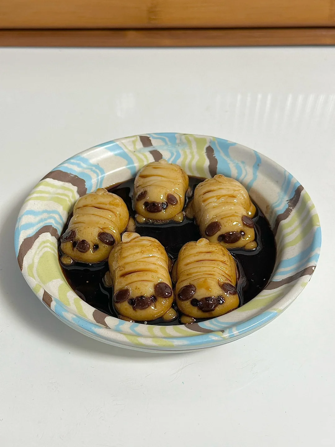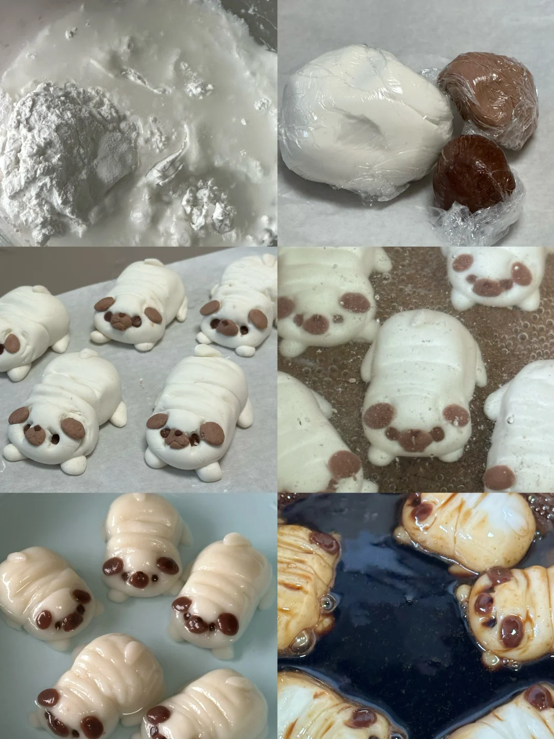 3.糯米团做成巴哥犬的形状,水开下锅煮至稳定漂浮,捞出备用