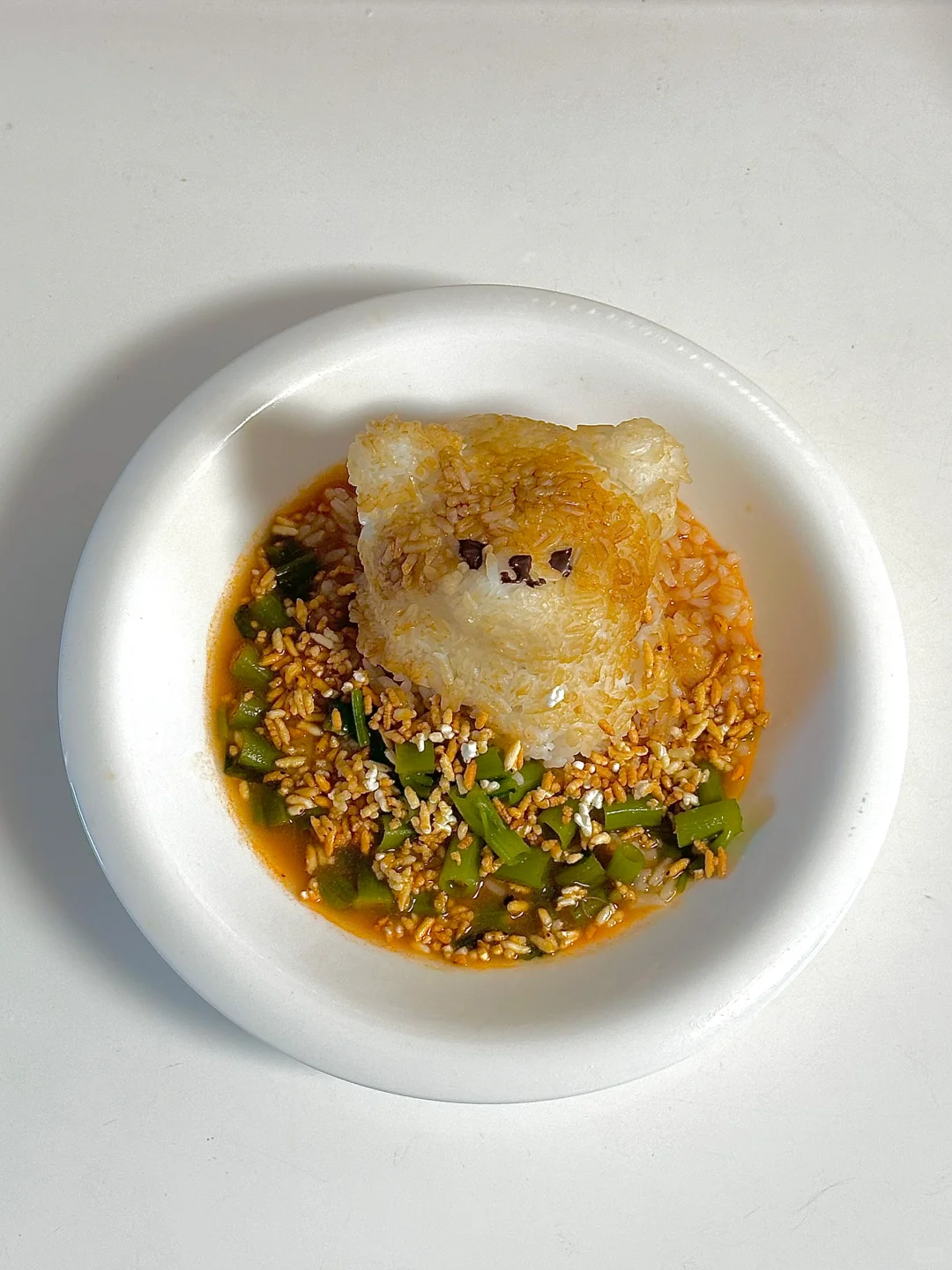 4.米饭捏出小狗形状,刷上酱油,巧克力画表情,放入汤汁中,撒上脆米