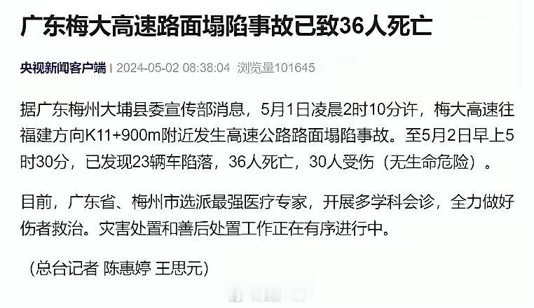 广东梅大高速塌方事件死亡人数继续攀升已经36人死亡,从19人到24人又到36人,车辆也攀升到了23辆。这真的令我们每一个人难过。本来是欢天喜地的出去旅游 ,高高兴兴回家和父母团聚。 没想到一个塌方,一刹那,却阴阳相隔,再也不能相见。 看着现场画面,这些车的模样,就知道当初的惨剧。 祈祷其他人都好好的,再也不要出现新的状况。[祈祷][祈祷][祈祷][祈祷][祈祷][祈祷]