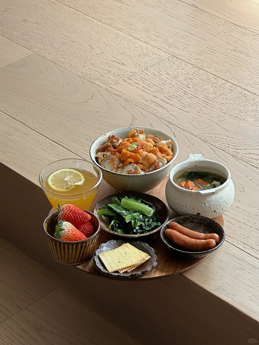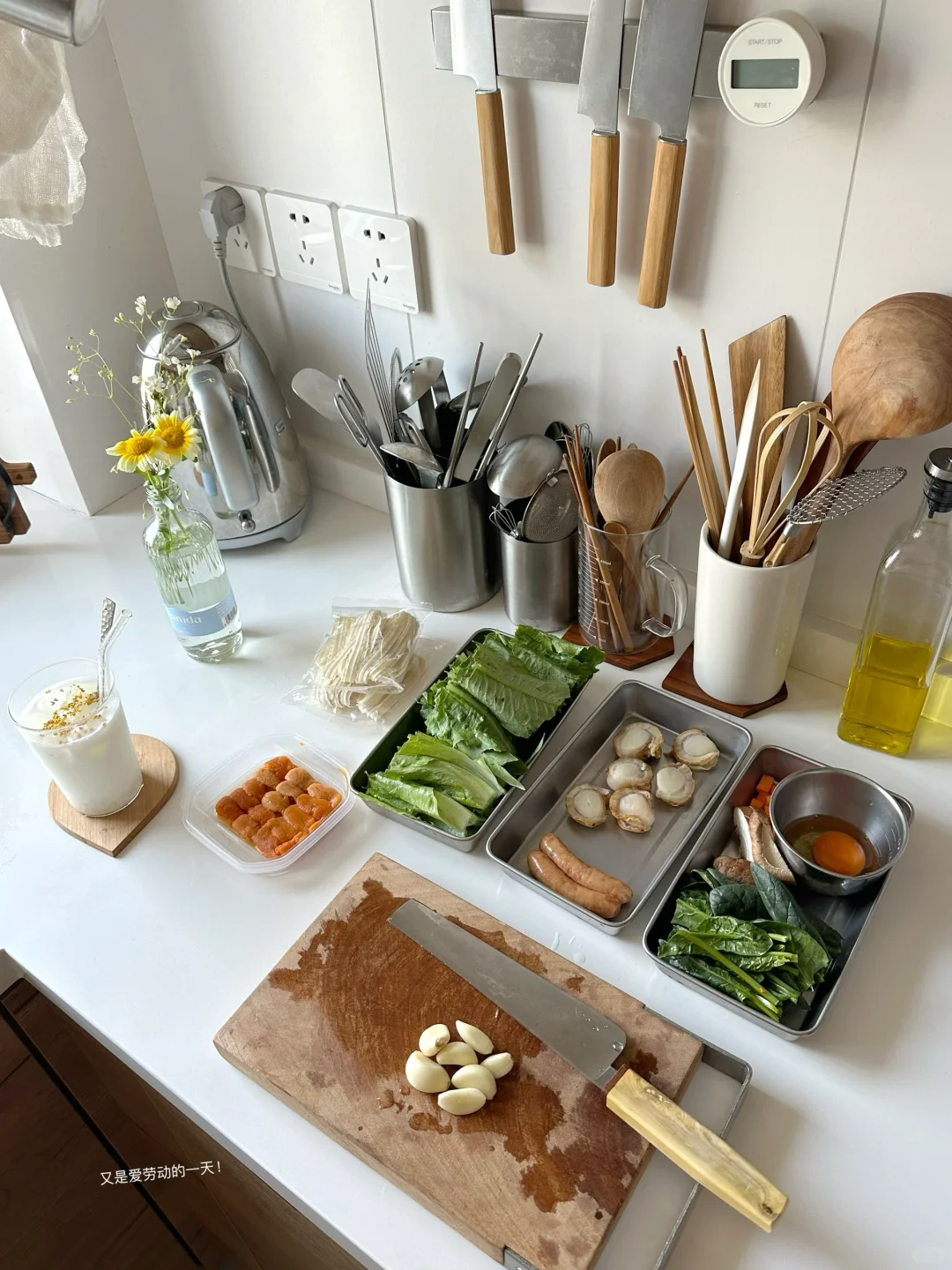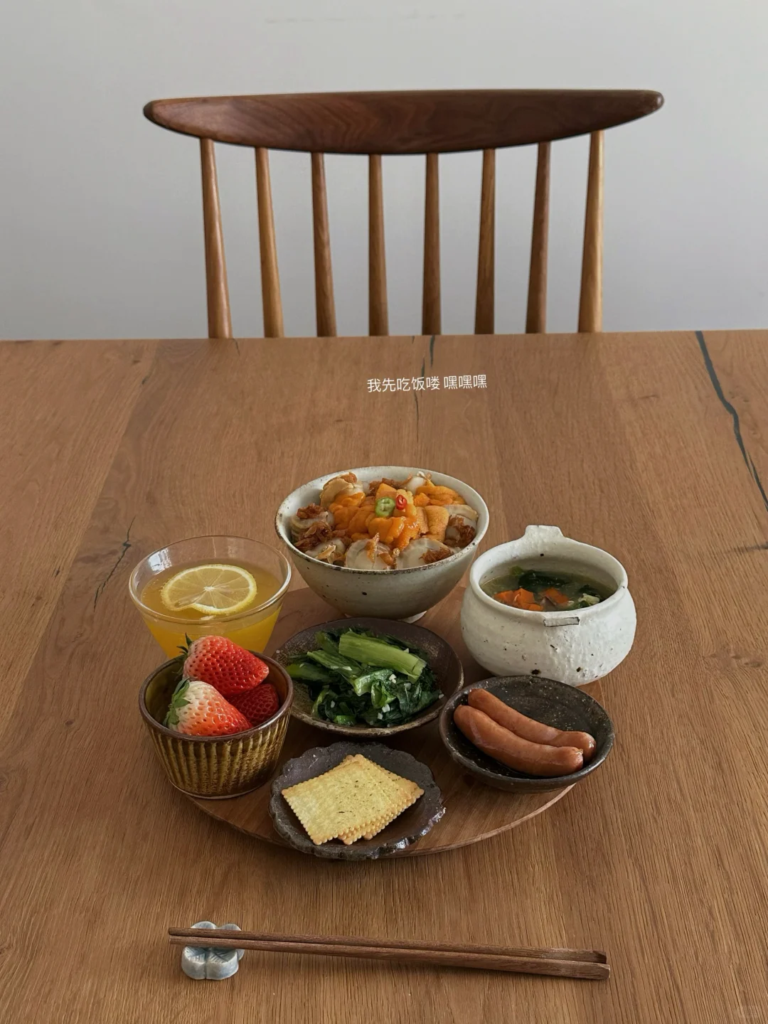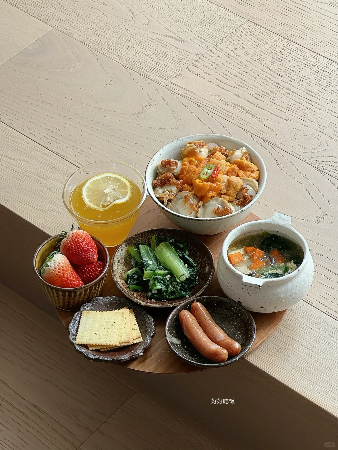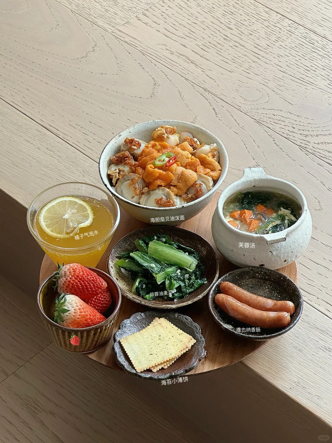 假期 早起 自己梳洗完 开始伺候祖宗们 铲屎、擦脸、擦pp、猫饭、打扫屋子🧹 扫地拖地、植物泡水、冰箱看看有什么 又给自己做了丰盛的一餐!劳动最光荣! 我!黑暗料理界一颗冉冉升起的新星! 油泼面+海胆扇贝 好吃的厥过去了! 先原谅这世界十分钟!尽情干饭! - 今日小托盘🥢 海胆扇贝油泼面🍜 蒜蓉油麦菜🥬 芙蓉汤🍄🥕 维也纳香肠🥓 草莓 饼干 橘子气泡水🍊
