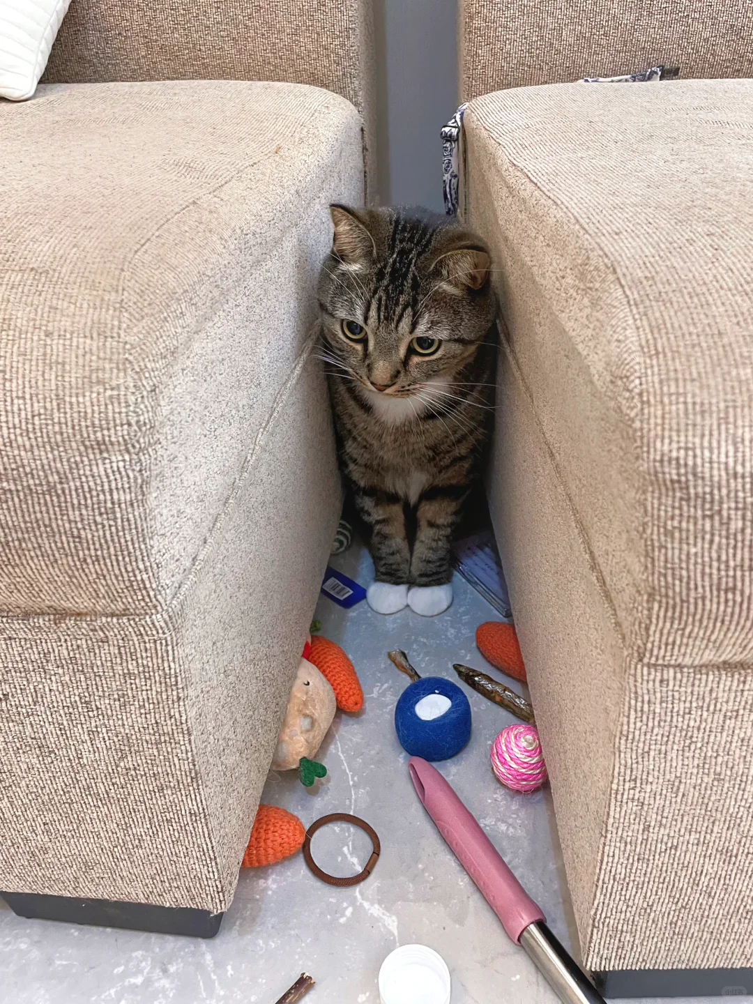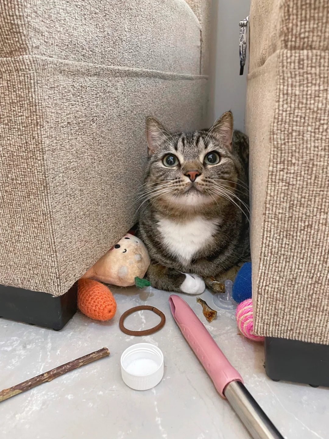 平时沙发都是罩起来的,今天决定彻底打扫一下,结果没想到它在沙发底私藏了这么多东西!小球、皮筋、木棍、鱼干、瓶盖....